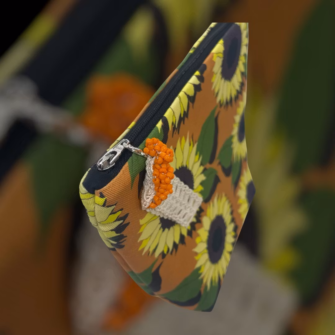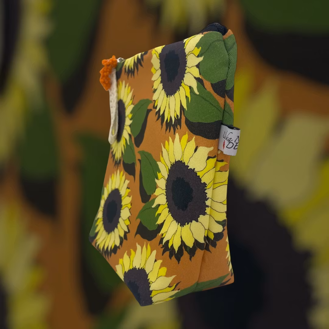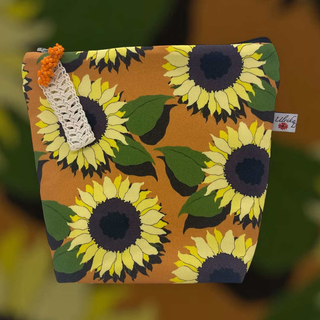 större makeup-väska/mindre necessär i mönstret Soliga solrosor på orange