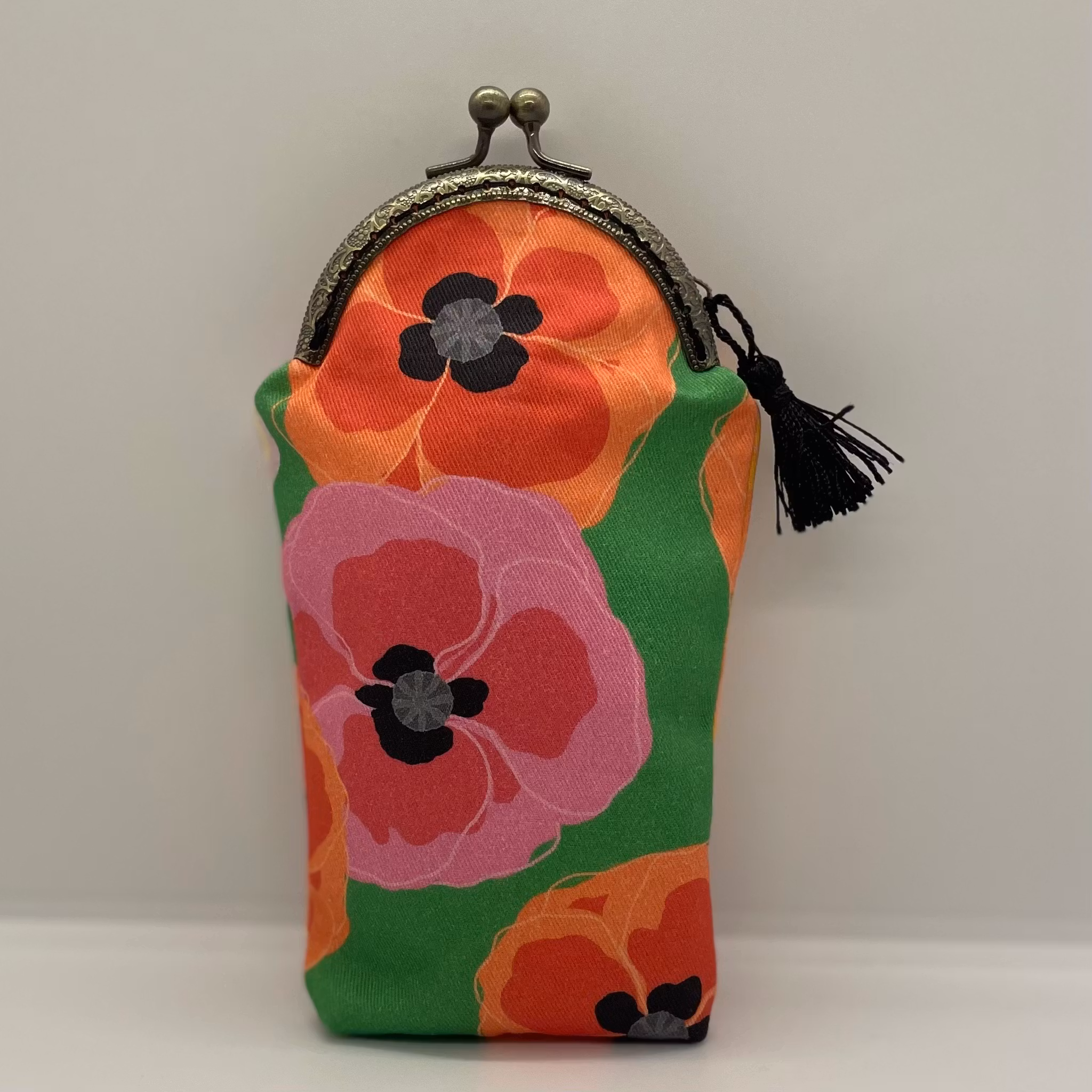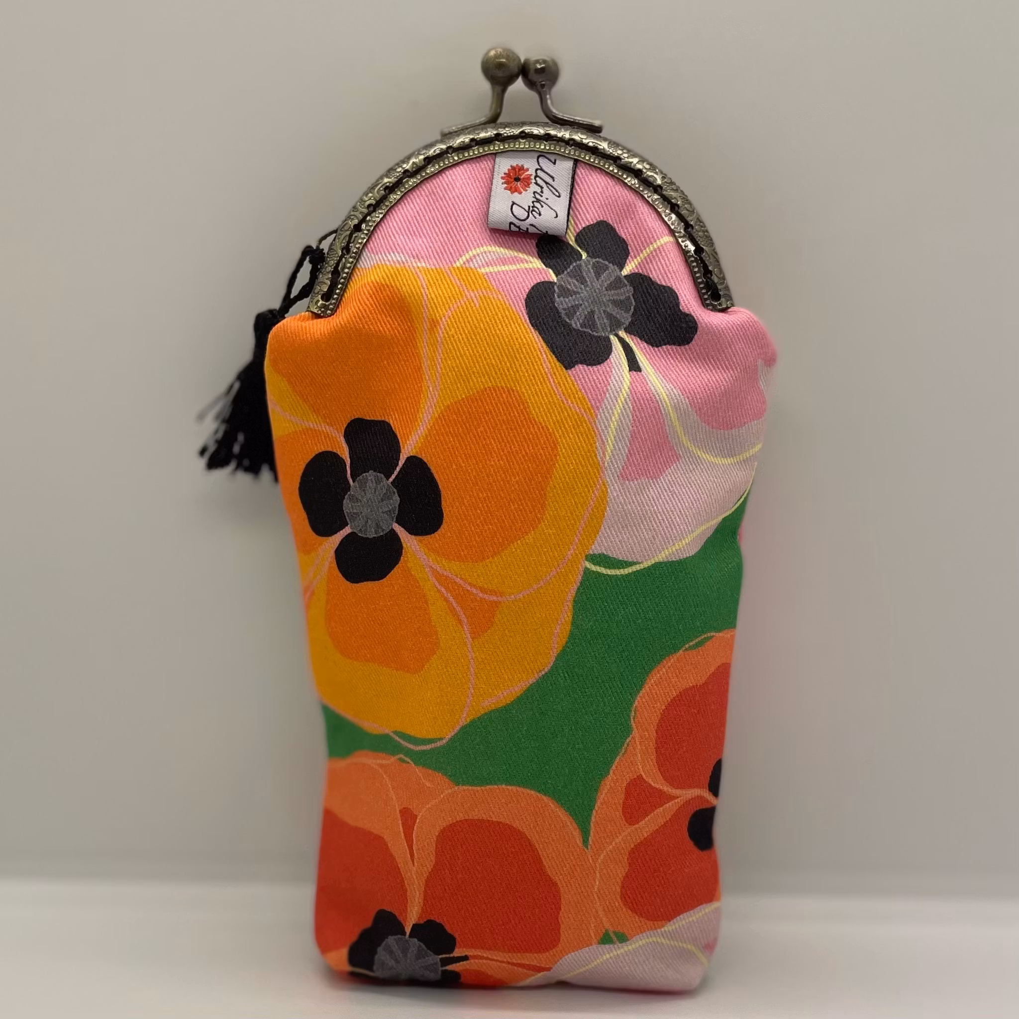 Fodralet mäter cirka 17 cm på höjden utan knopparna man öppnar fodralet med, är 10 cm på bredaste stället och cirka 2 cm djupt. Yttertyget består av bomullstwill 240 g/m2 och är förstärkt med vliseline. Fodret är sytt av av bomullssatin 140 g/m2. Skalan är lite större på yttertyget som du kan se på bilderna. Fodralet är inte vadderat, då det blir för klumpigt i den här modellen.