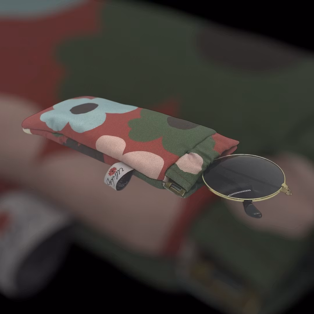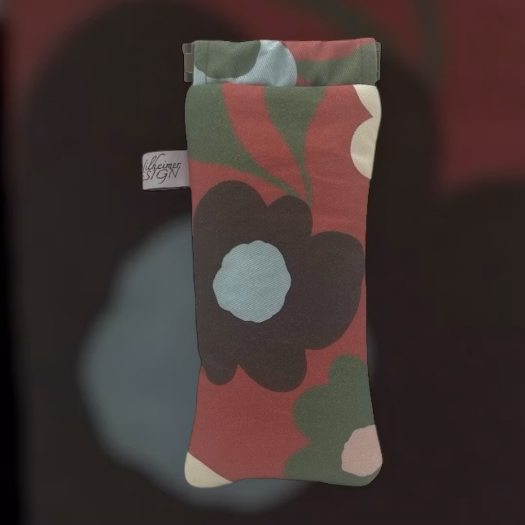Fodralet mäter cirka 18 cm på höjden inklusive den klassiska klämöppningen och är 8 cm på bredaste stället. Yttertyget består av bomullstwill 240 g/m2 och fodret är sytt av ett vitt bomulltyg av fin kvalitet jag hade i gömmorna. Fodralet skyddar dina glasögon i form av oeko-tex standard 100 hobbypolyester. Jag hade turen att hitta två oöppnade förpackningar på loppis och du som känner till mitt miljötänk, vet att jag är nöjd när jag kan återvinna och ta tillvara. Hållbart, funktionellt och vackert på en och samma gång!