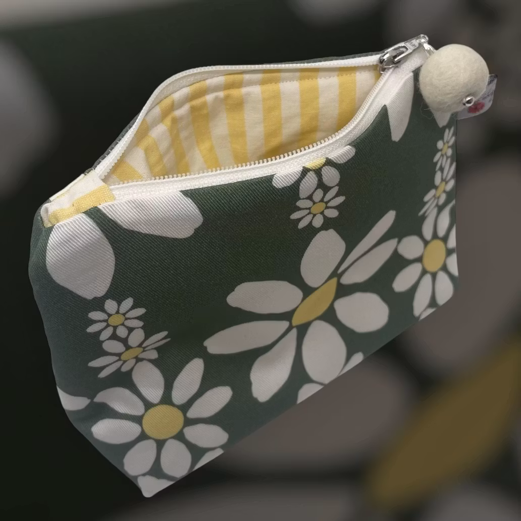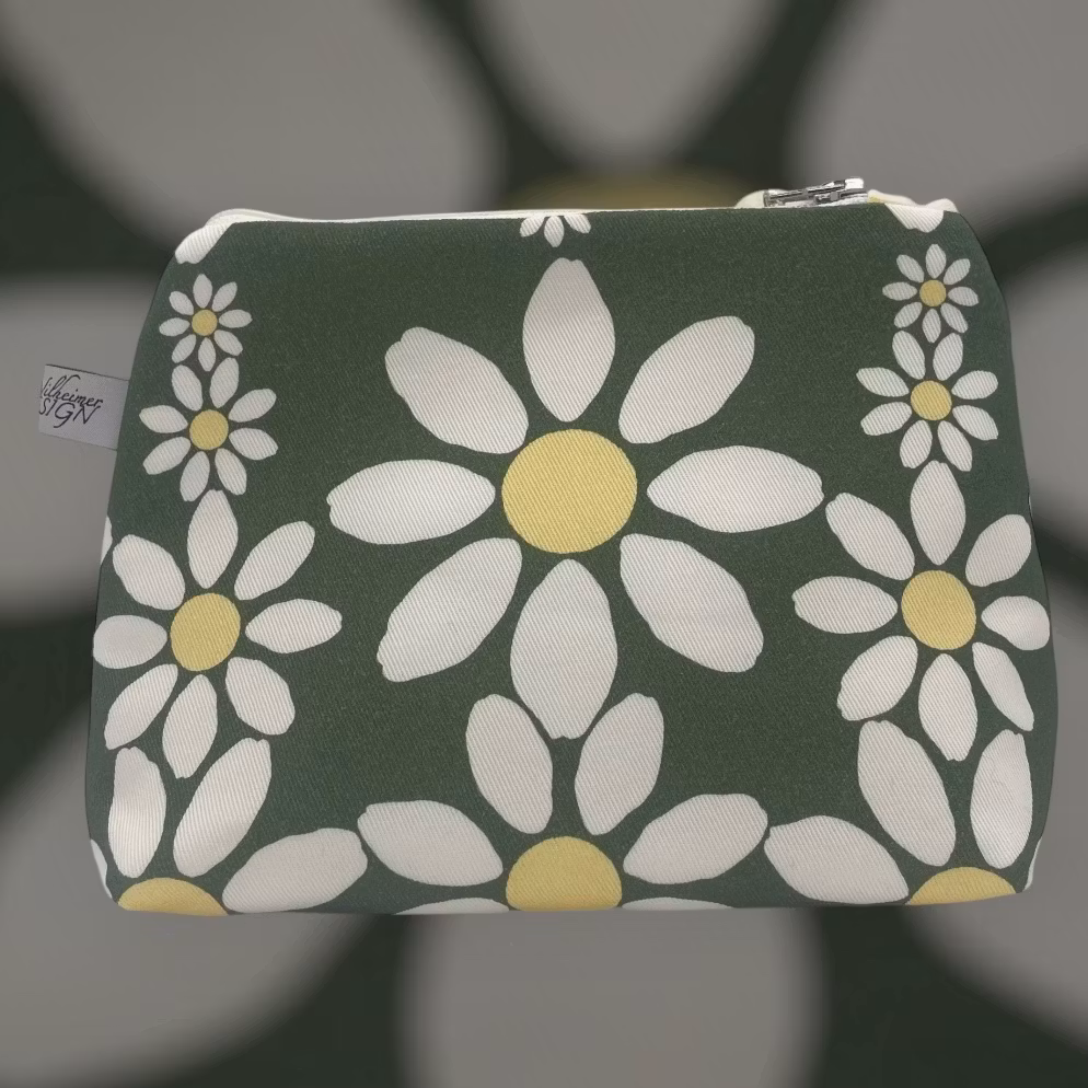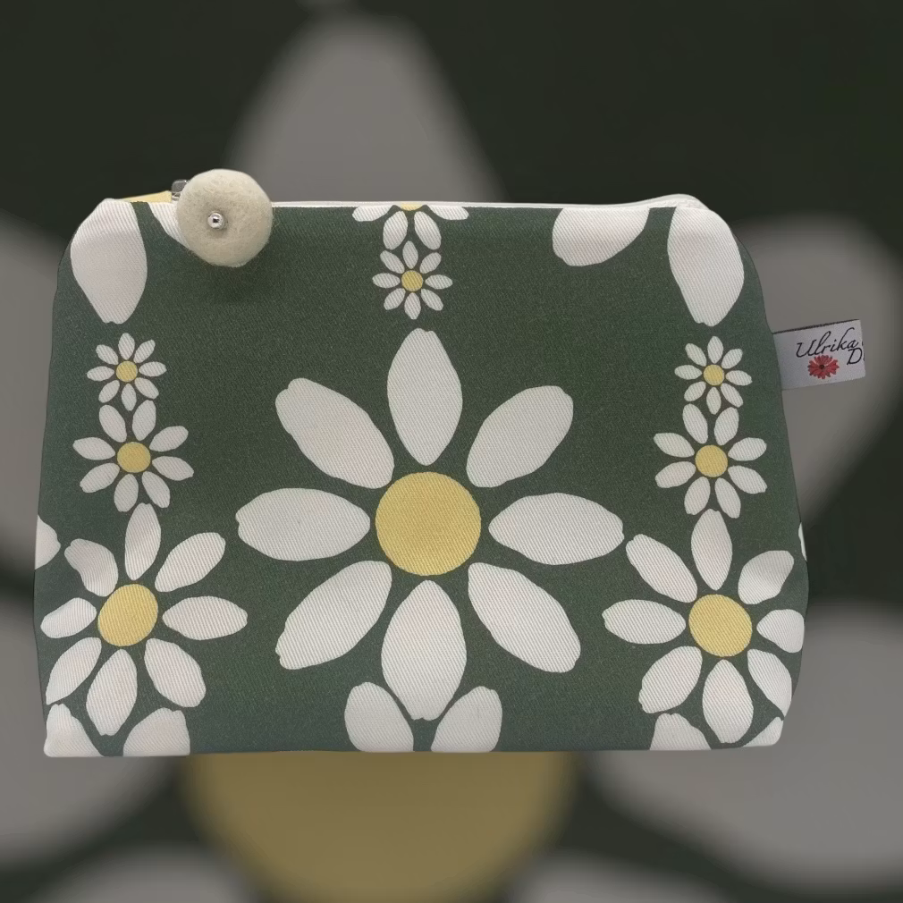 liten makeup-väska/necessär med stiliserade prästkragar på grönt