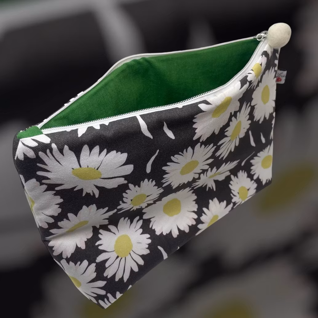 Funktion och material: Det här är min mellanstora necessär som är sydd i min fina twill 240 g/m2. Fodret är sytt av ett riktigt grönt loppistyg i bomull, fräscht och oanvänt. Den lilla vita ullbollen gör sig bra ihop med yttertyget och kan lätt tas bort då den sitter med ett litet klo-lås. Jag har vadderat necessären med vadd i polyester, som gör den både stadig och skyddar innehållet.