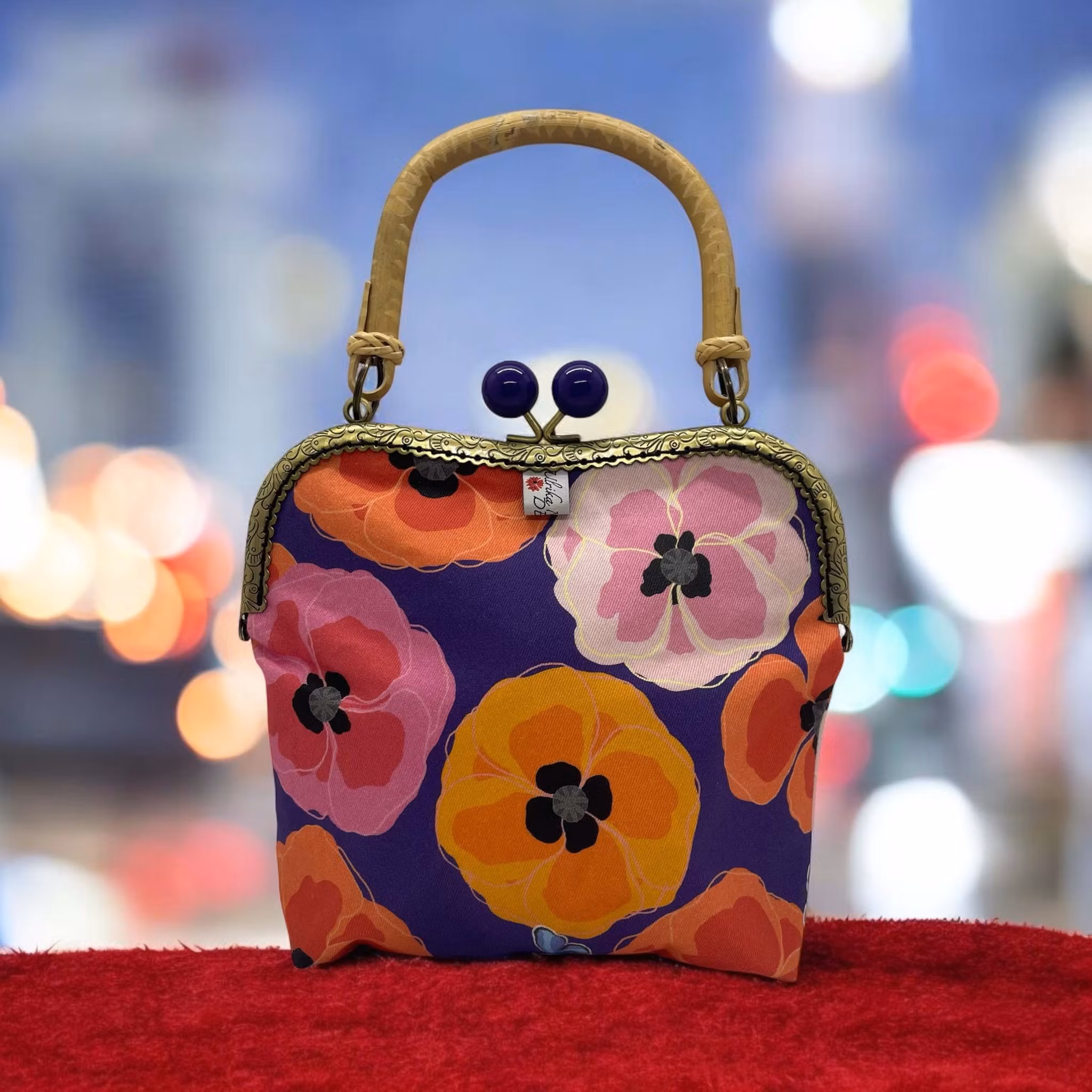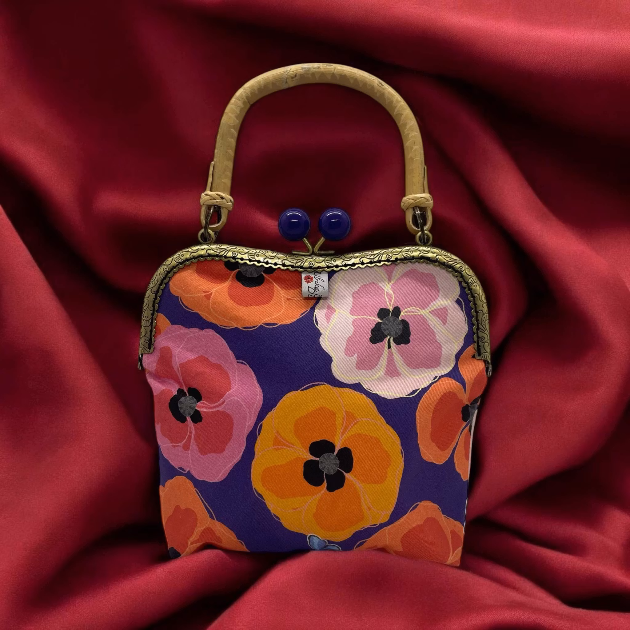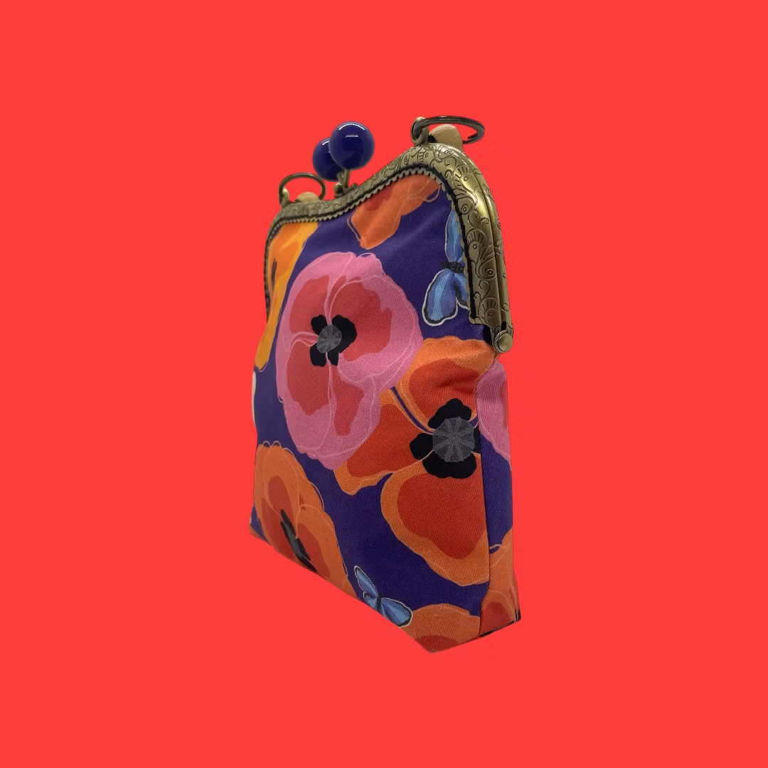 mindre toalettväska/necessär med bambuhandtag i vallmomönstret Poppy bonanza på lila