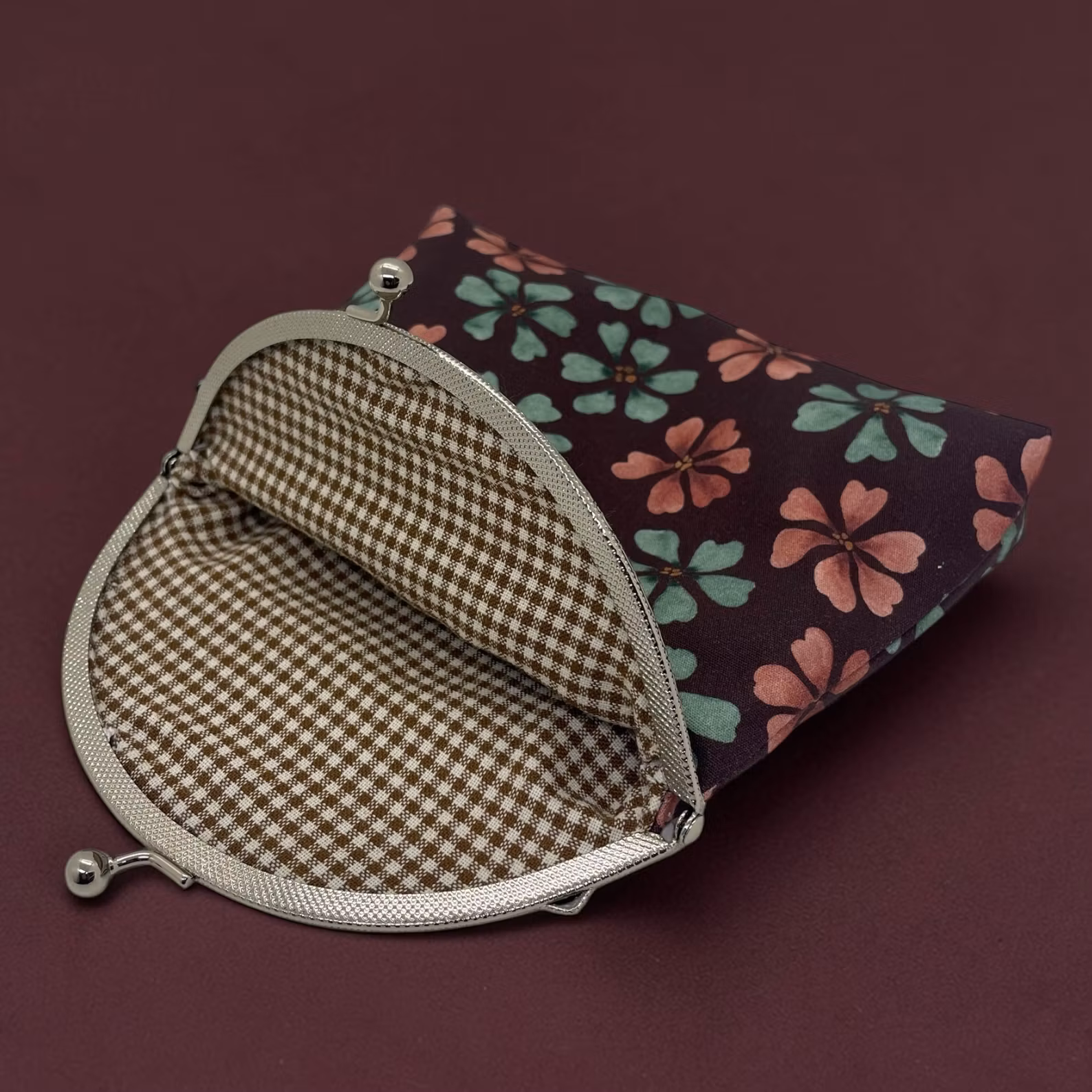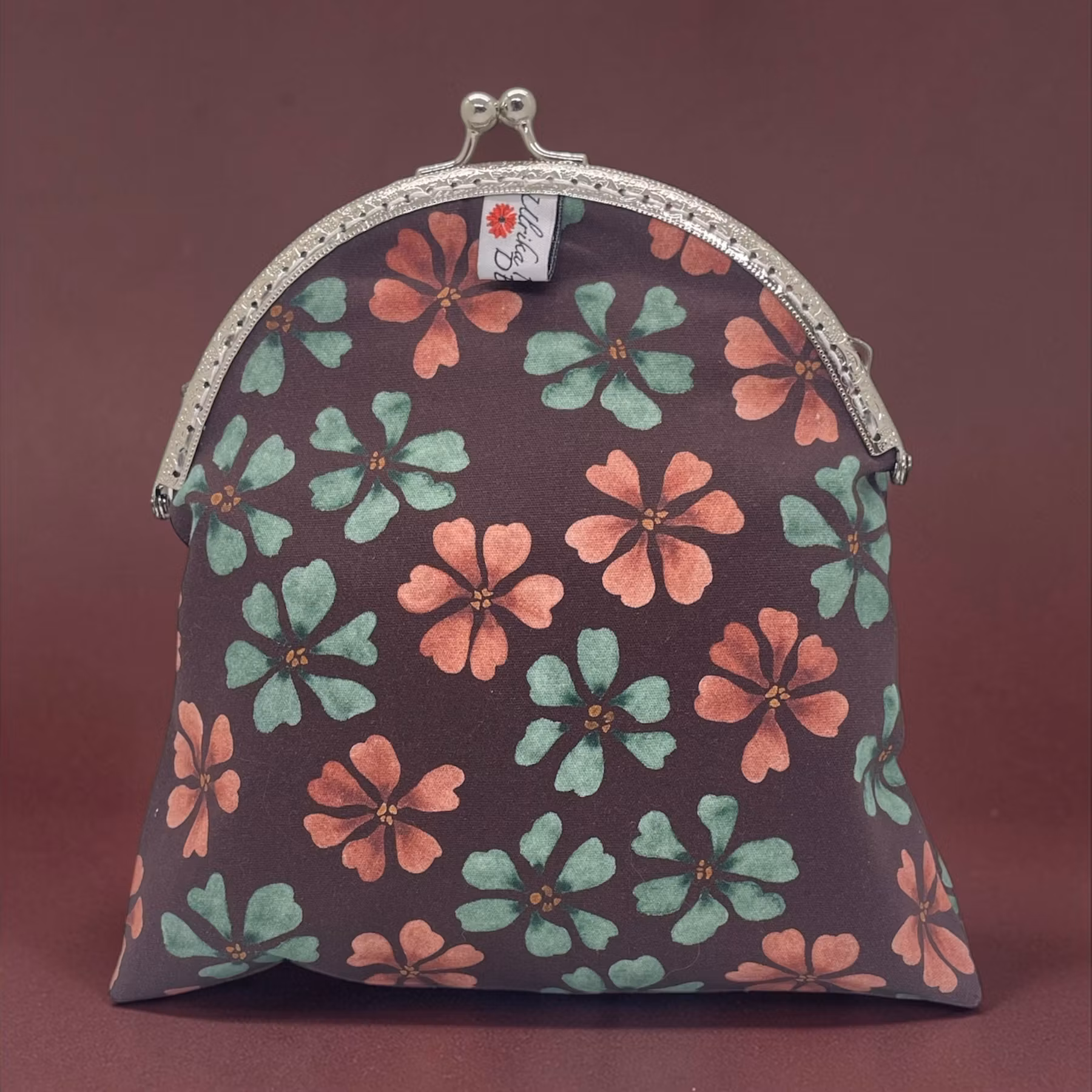 necessär/makeupväska med kyssknäppe, i mönstret Bliss på vinrött