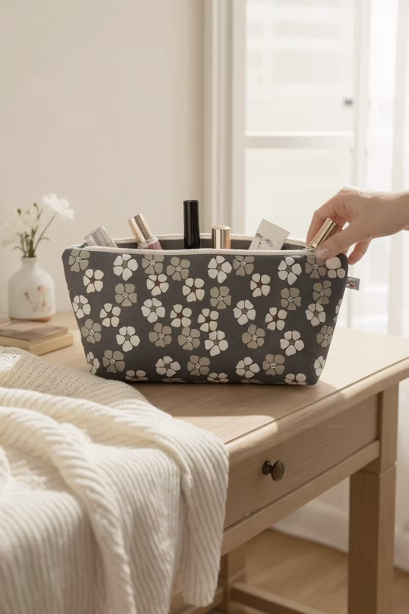 Funktion och material: Det här är min större necessär, som jag döpt till resenecessär. Den är mer lång än hög, vilket gör att man lättare ser och hittar det man ska. Dessutom är necessären smidig att packa ner i resväskan. Just den här har jag gjort djupare i botten och vidare upptill, för att det ska bli ännu enklare att hitta det man letar efter. Den här resenecessären är sydd i min fina canvas 185 g/m2. Jag syr den oftast av en så kallad "fat quarter" och tar tillvara nästan hela tygstycket, utan spill!