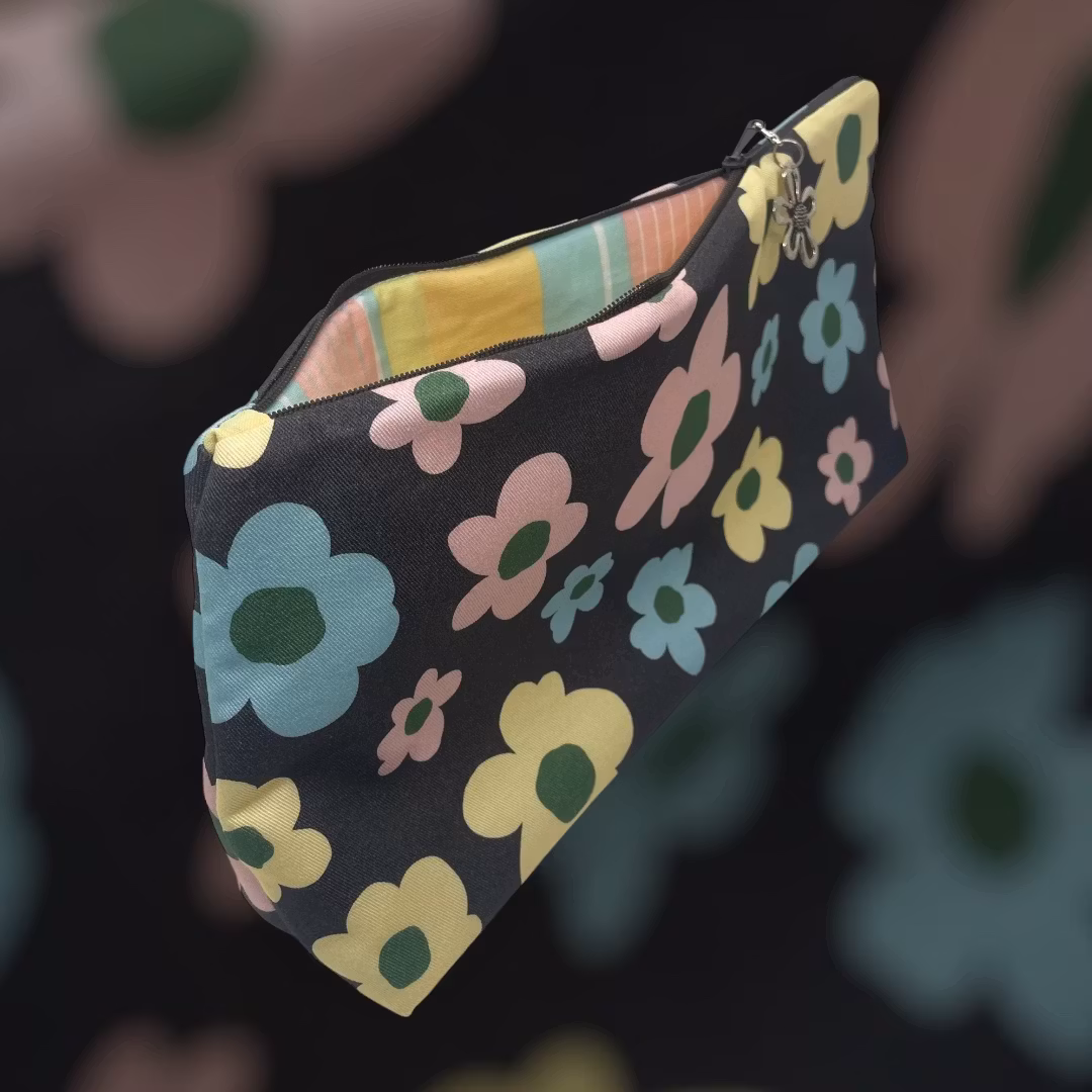 Fodret är sytt av ett pastellrandigt och matchande bomullstyg jag fyndat på loppis, oanvänt och fräscht. Metallblomman har varit ett örhänge, men fick tjäna som en passande dekoration på blixtlåset och kan lätt tas bort då den sitter med ett litet klo-lås.