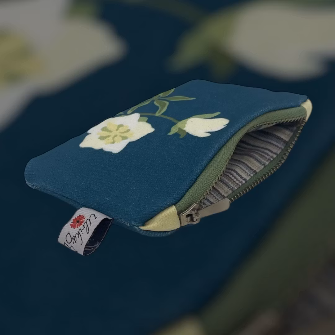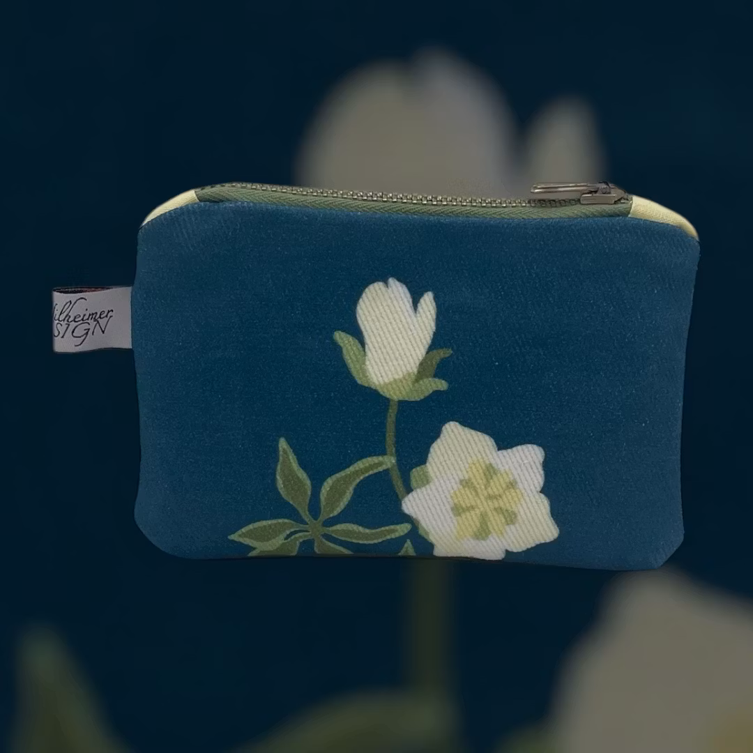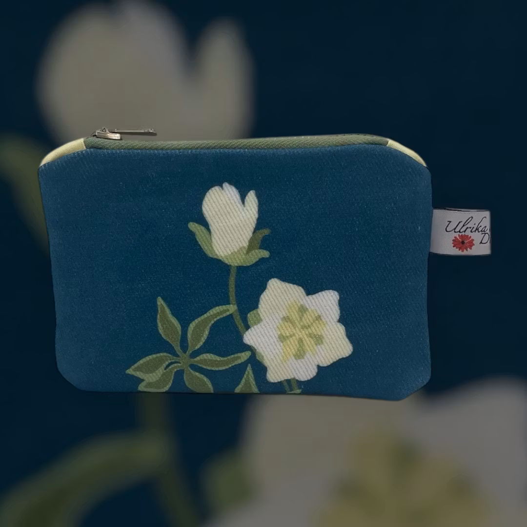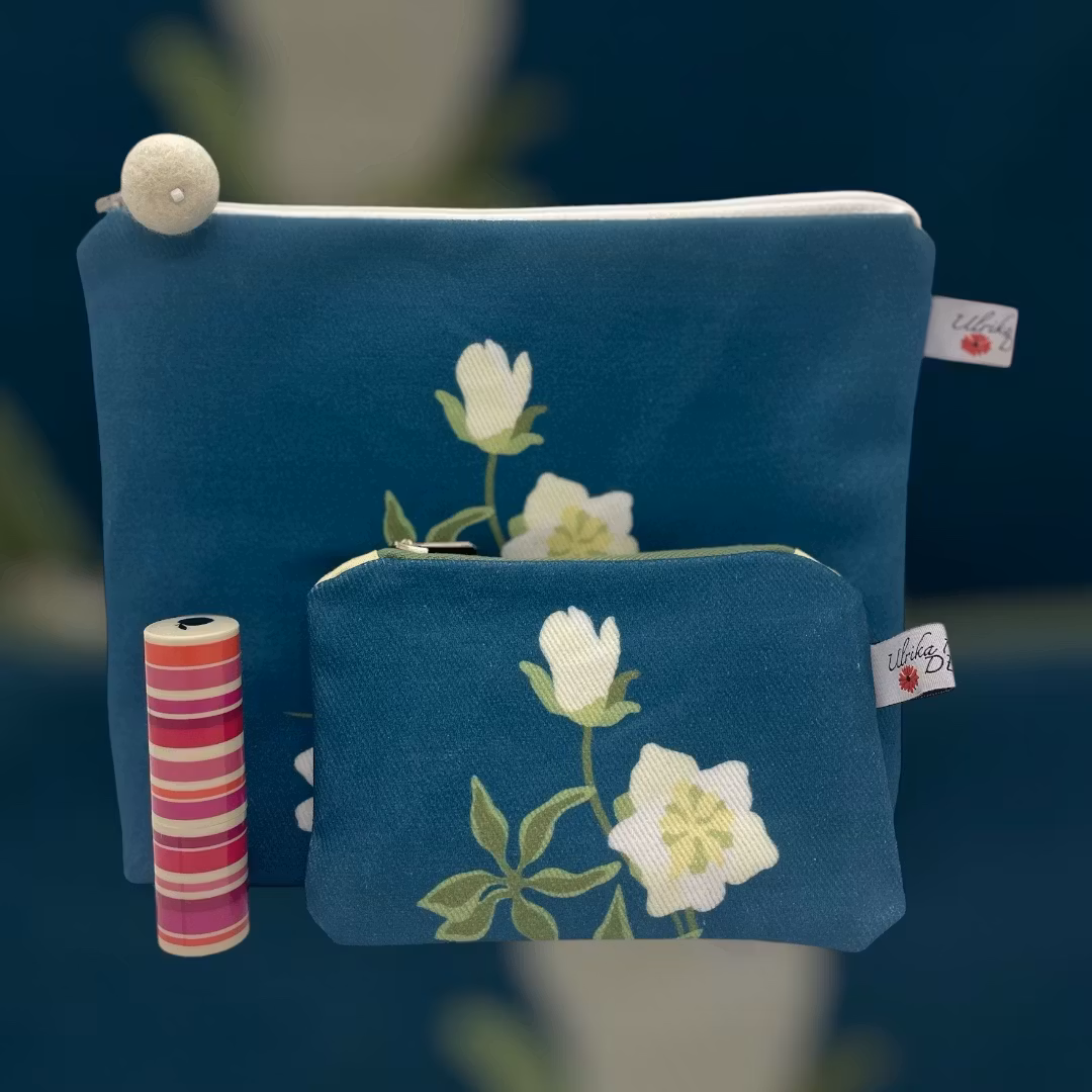 Yttertyget är sytt av rejäl GOTS-certifierad bomullstwill 375 g/m2. Det lilla fodralet mäter 13 cm på bredden och 8,5 cm på höjden. Det randiga fodret är secondhand av bomull. Blixtlåset är oanvänd secondhand även det. Makeupväskan/den mindre necessären mäter upptill 21,5 cm på bredden, 18 cm nedtill på bredden, djupet nedtill är 4 cm och höjden mäter 16 cm. Det beigegula fodertyget är secondhand och känns som bomull, möjligen blandat med linne. I blixtlåset har jag fäst en blomma i liknande form som julrosen och som lätt kan tas bort med klo-låset den är fäst i. Ny, vacker och återvunnen förvaring på en och samma gång!© 2025 Ulrika Nilheimer DESIGN – Powered by Quickbutik
