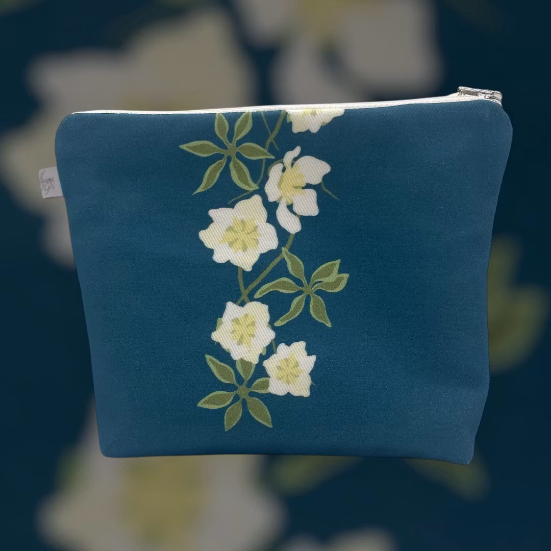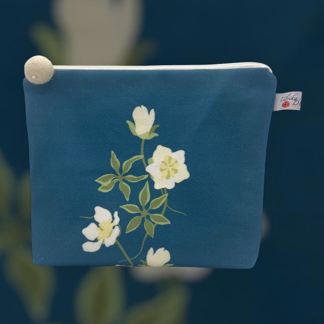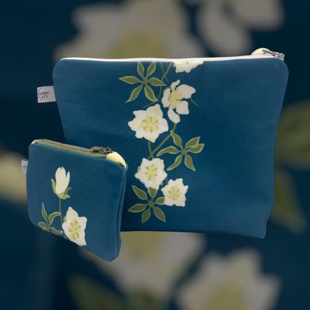 set med litet fodral och en makeup-väska/mindre necessär i mönstret Belle Helle, julrosen på färgen decembernatt