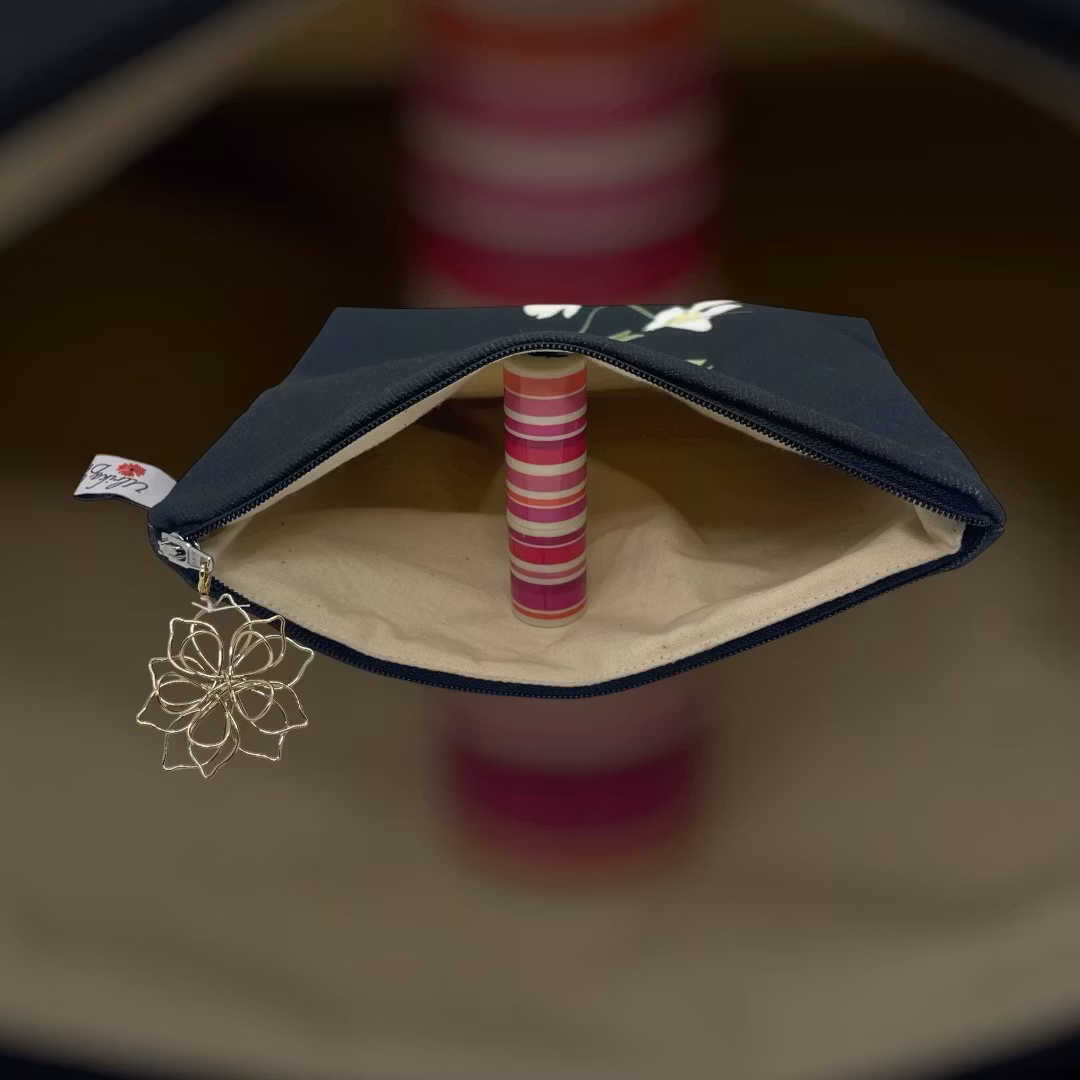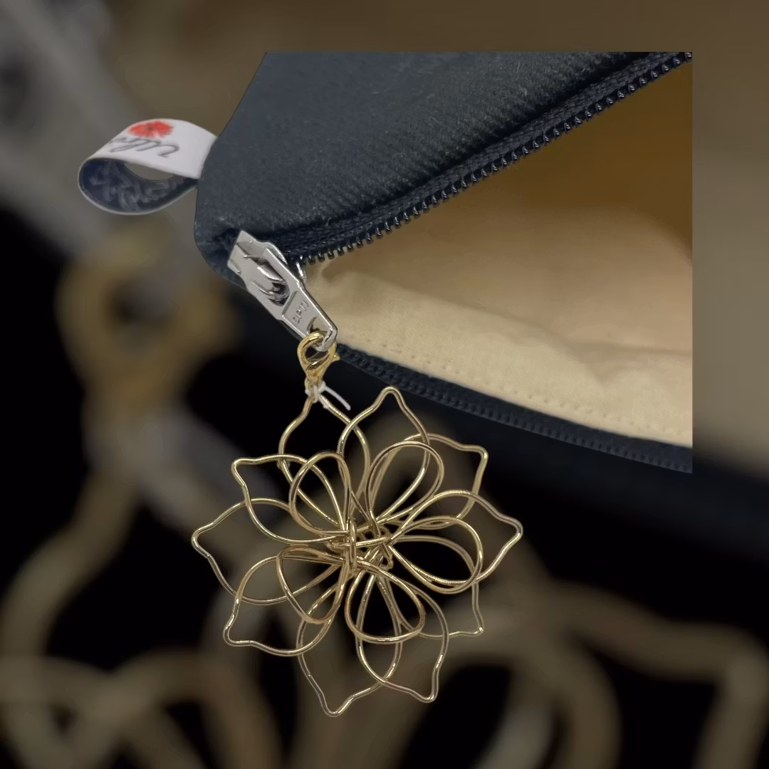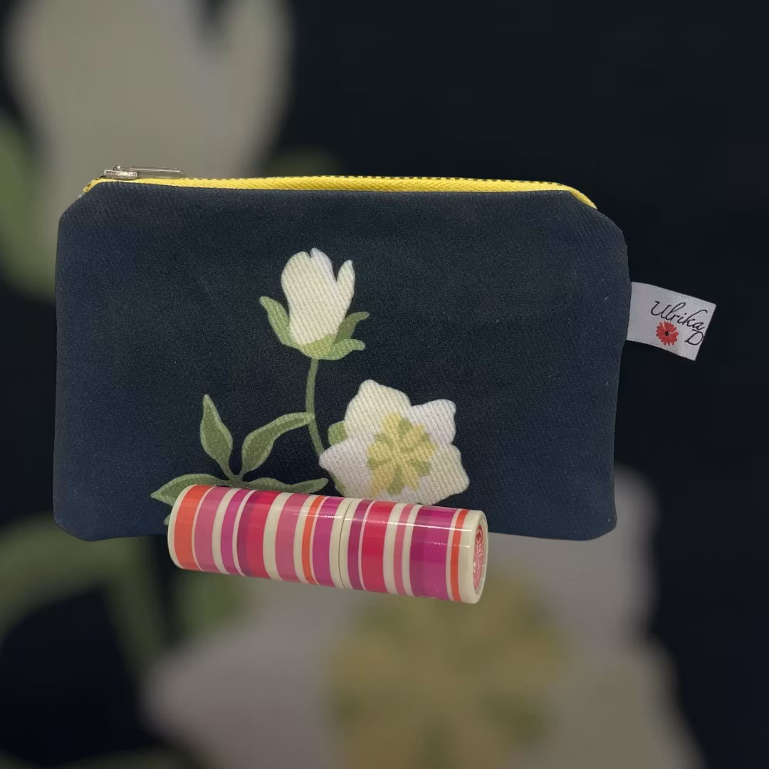 Yttertyget är sytt av rejäl GOTS-certifierad bomullstwill 375 g/m2. Det beigegula fodertyget är secondhand och känns som bomull, möjligen blandat med linne. Det lilla fodralet mäter 14 cm på bredden och 9 cm på höjden. Blixtlåset är oanvänd secondhand. Makeupväskan/den mindre necessären mäter upptill 21 cm på bredden, 18 cm nedtill på bredden, djupet nedtill är 3,5 cm och höjden mäter 16 cm. I blixtlåset har jag fäst en blomma i liknande form som julrosen och som lätt kan tas bort med klo-låset den är fäst i. Ny, vacker och återvunnen förvaring på en och samma gång!© 2025 Ulrika Nilheimer DESIGN – Powered by Quickbutik