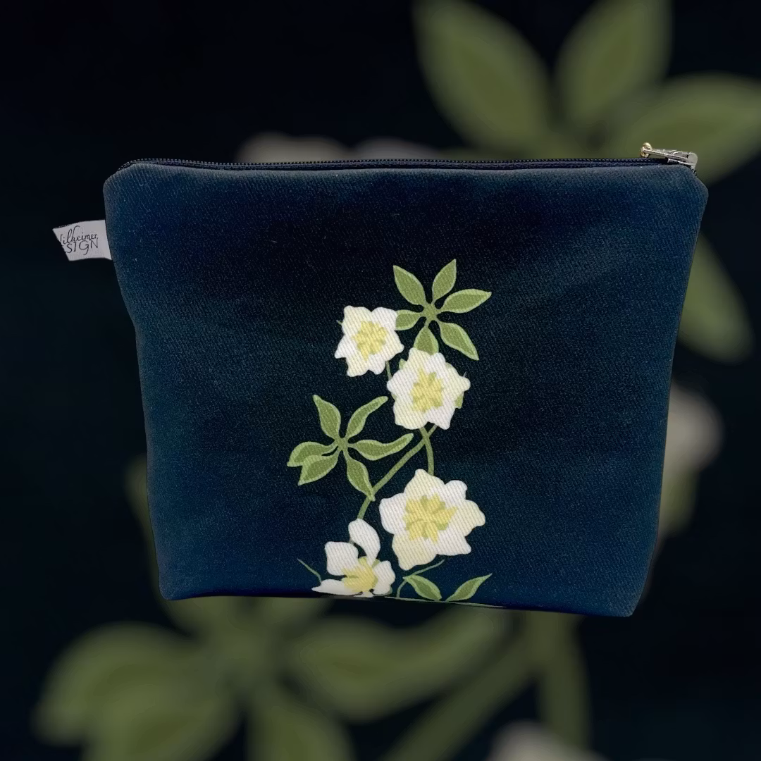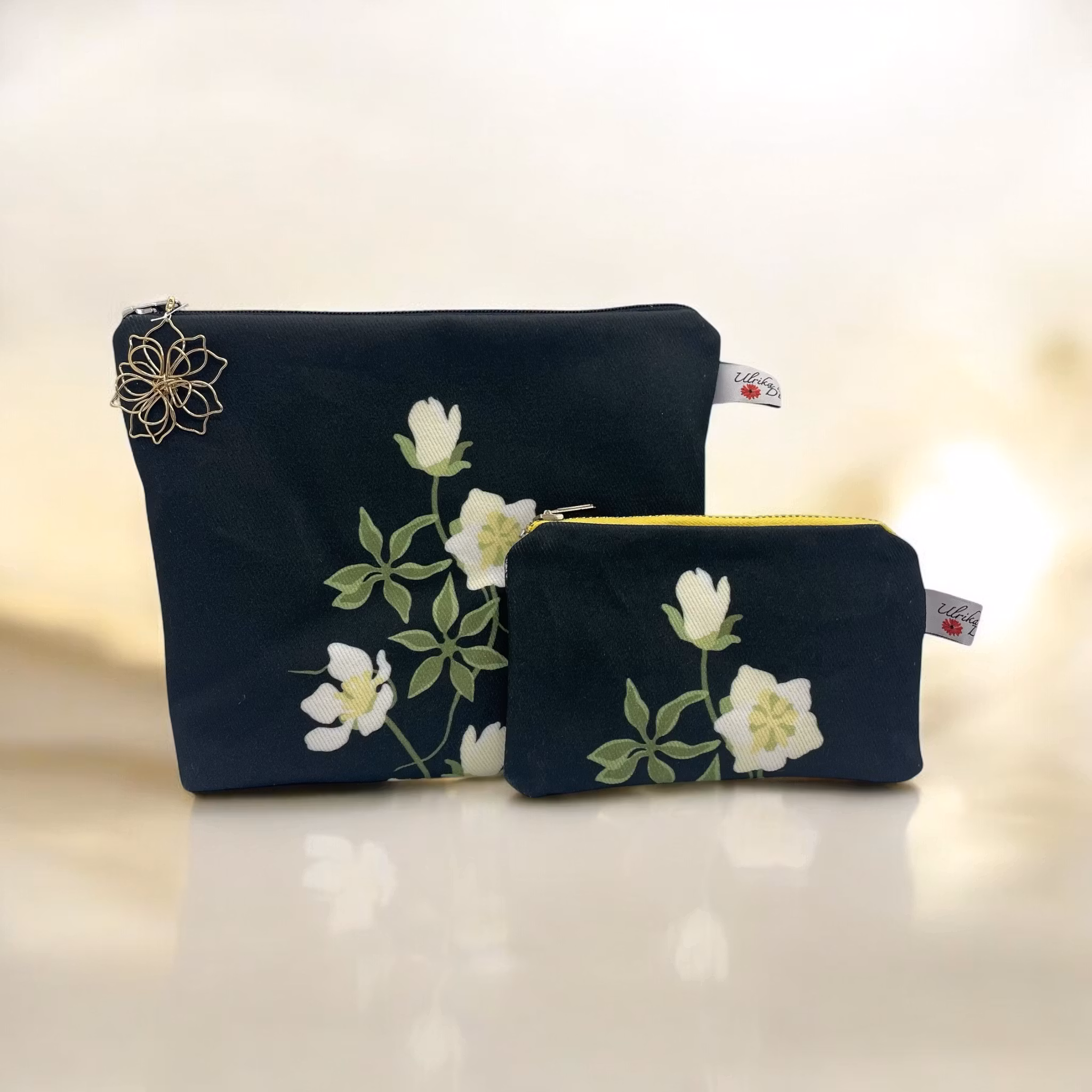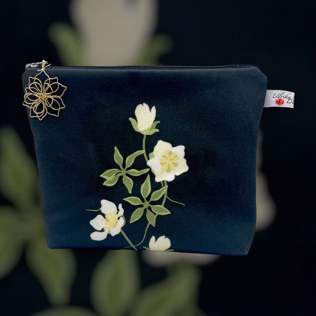 set med litet fodral och en makeup-väska/mindre necessär i mönstret Belle Helle, julrosen på decembernatt