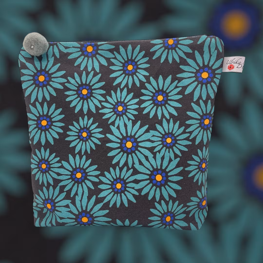 En större makeup-väska alternativt mindre necessär, sydd av min fina twill 240 g/m2. Fodret består av bomullspoplin 130 g/m2. Ullbollen kan lätt tas bort, den sitter med ett litet klo-lås. Måtten är cirka, jag har sytt efter en och samma mall men måtten kan variera något litet. Höjden mäter 20 cm, bredden nedtill är 17-18 cm, upptill 21 cm och djupet nedtill 4 cm. Yttertyget är inte förstärkt, jag bedömde att twillen och i det här fallet fodret i sig, gav tillräcklig stadga för en liten makeup-väska eller till annan förvaring.