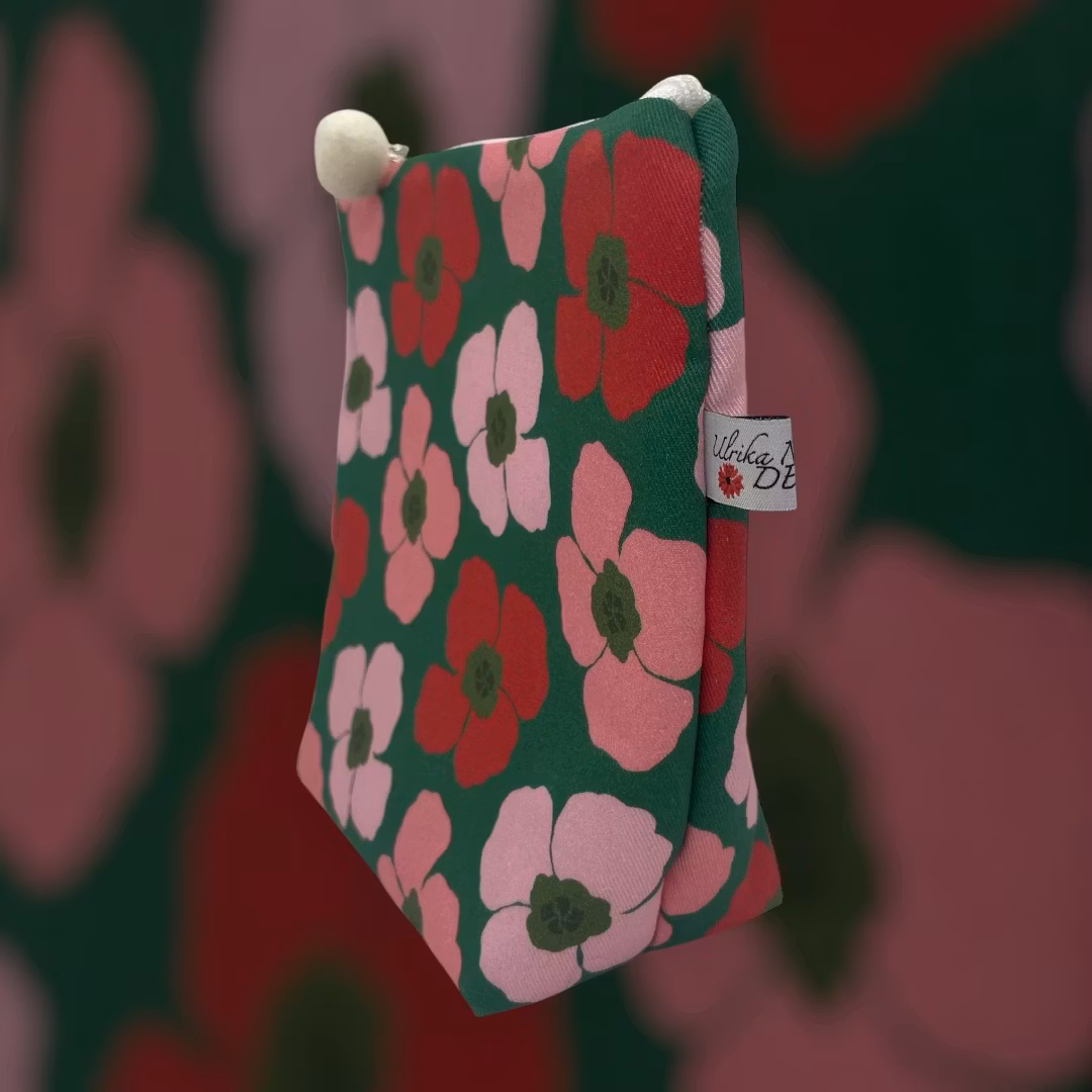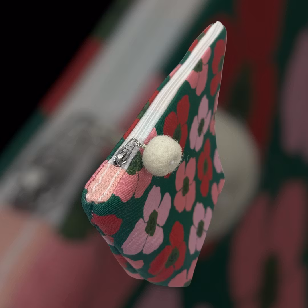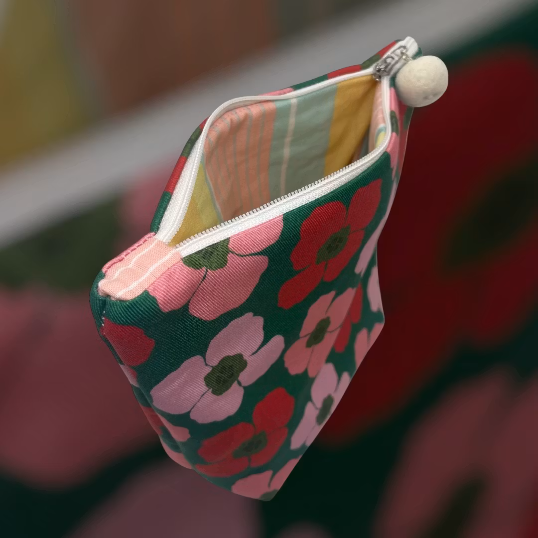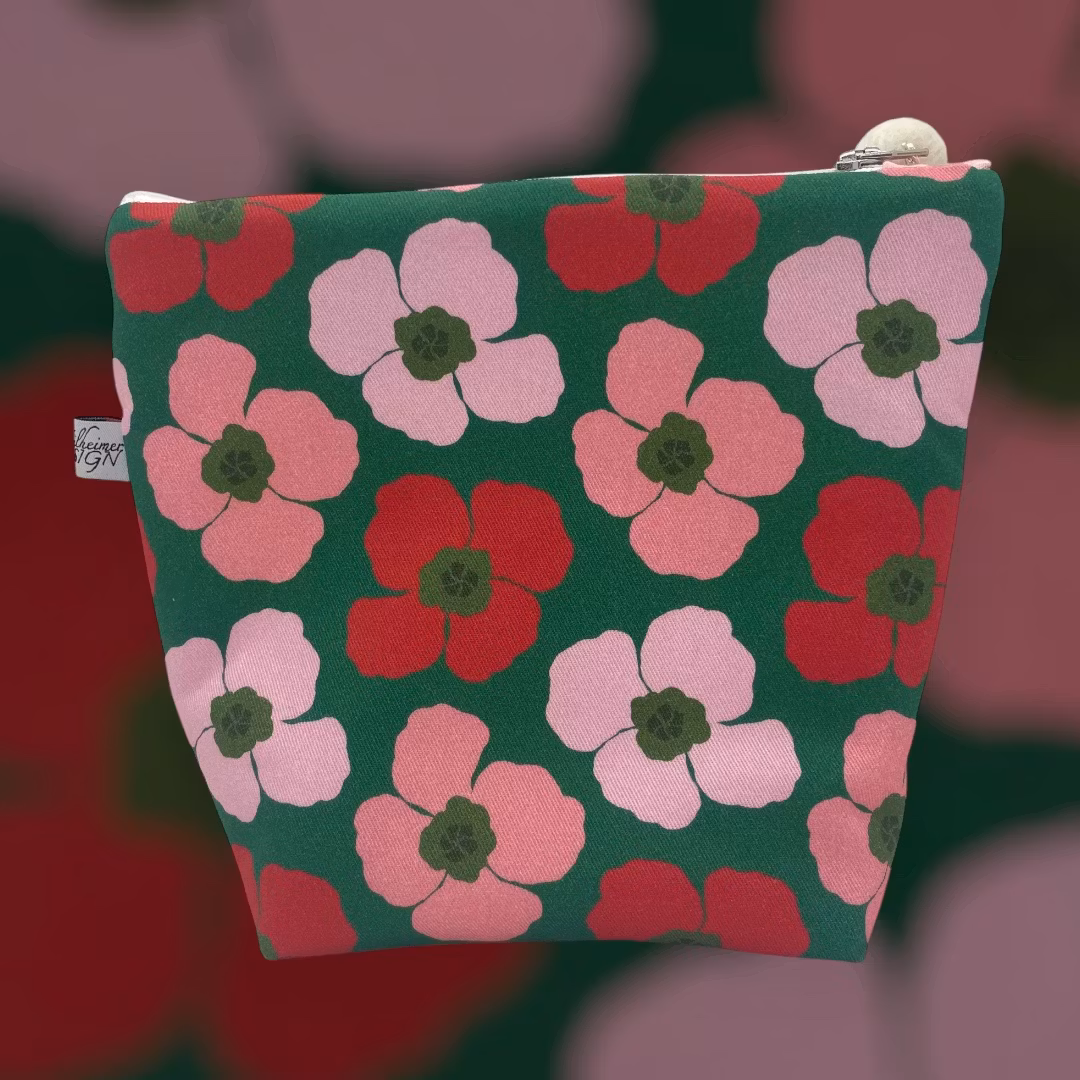 större makeup-väska/mindre necessär i det rosaröda vallmomönstret Keshi på grönt
