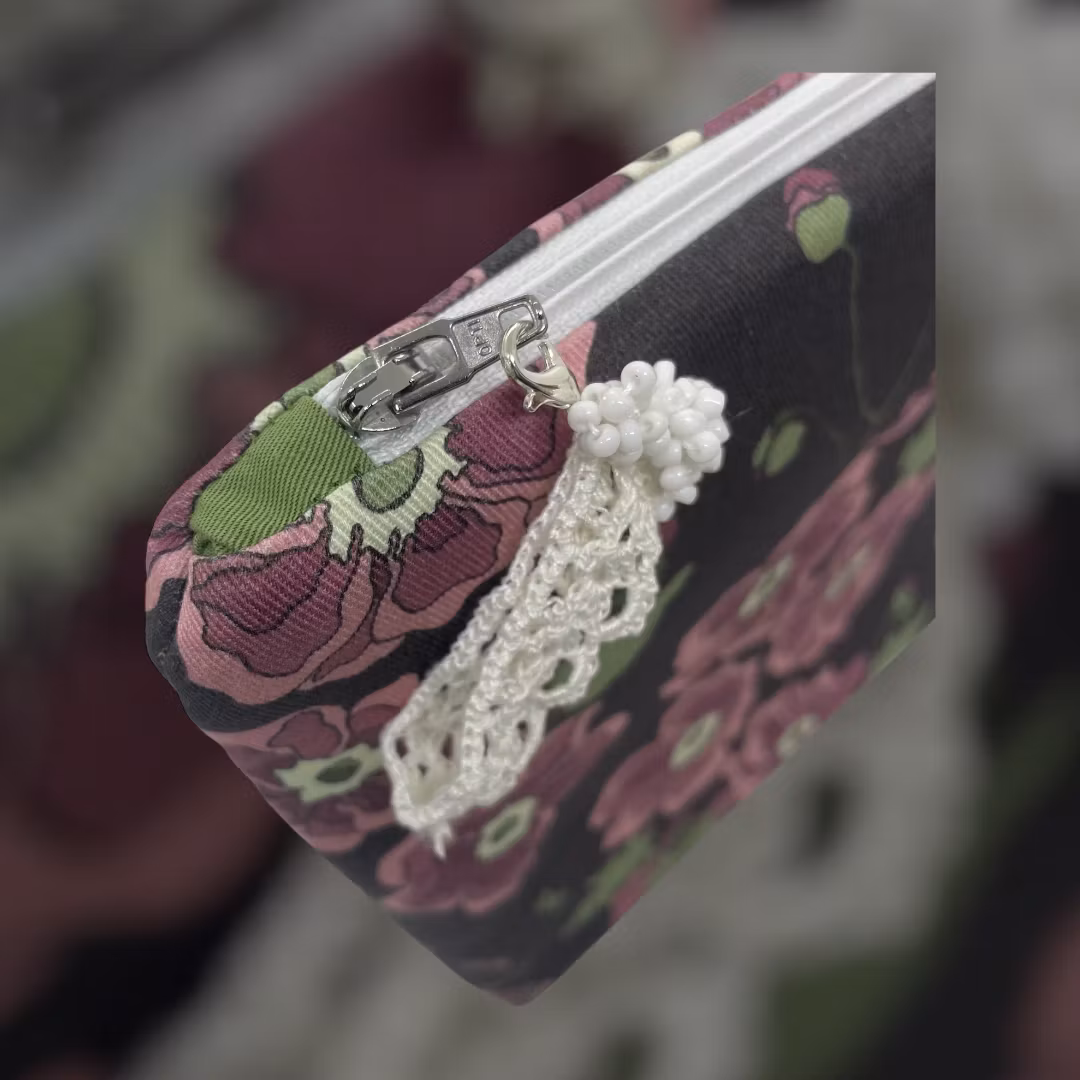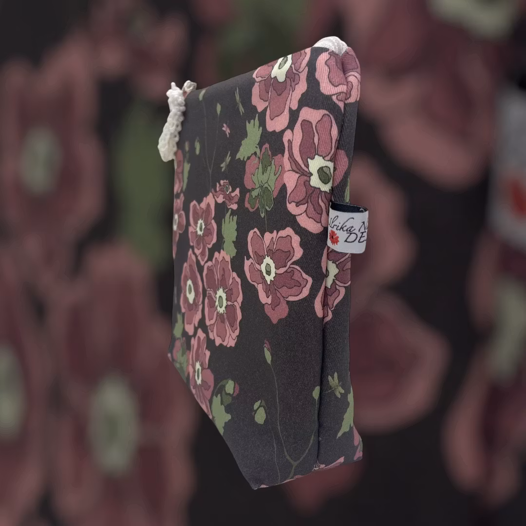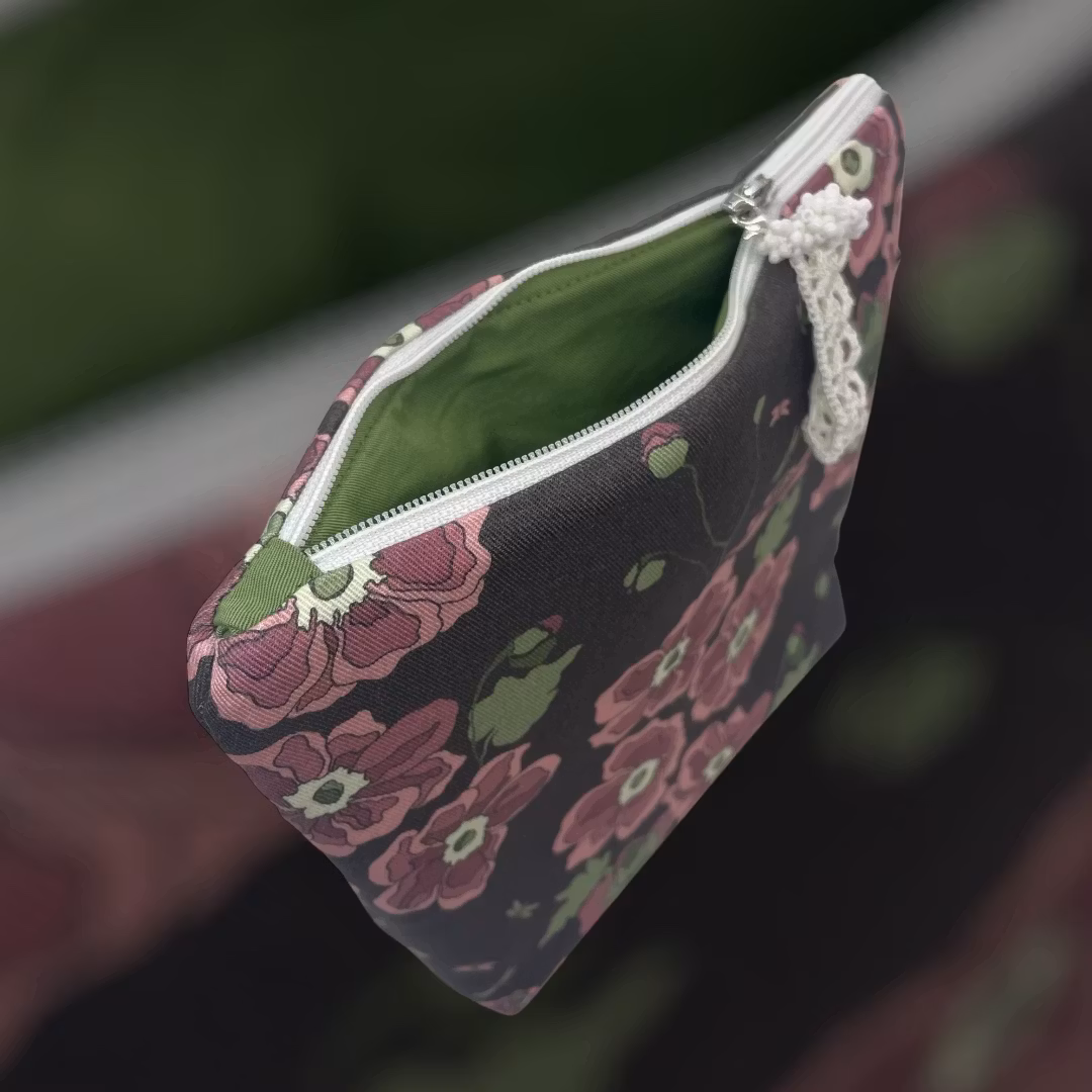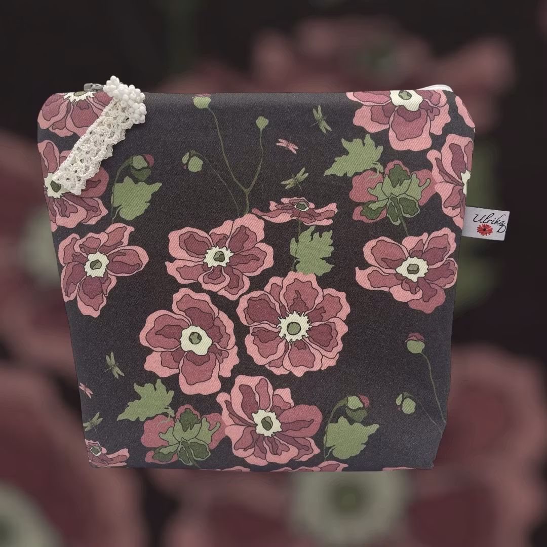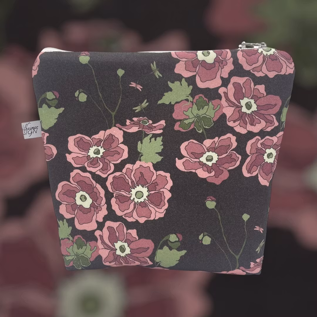större makeup-väska/mindre necessär i mönstret Anemona, med höstanemoner på brunt