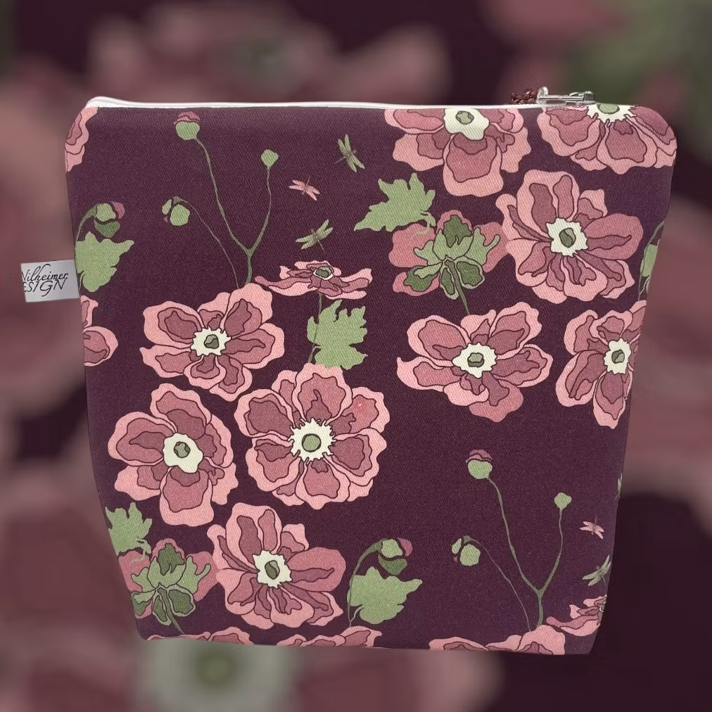 större makeup-väska/mindre necessär i mönstret Anemona, med höstanemoner på plommon