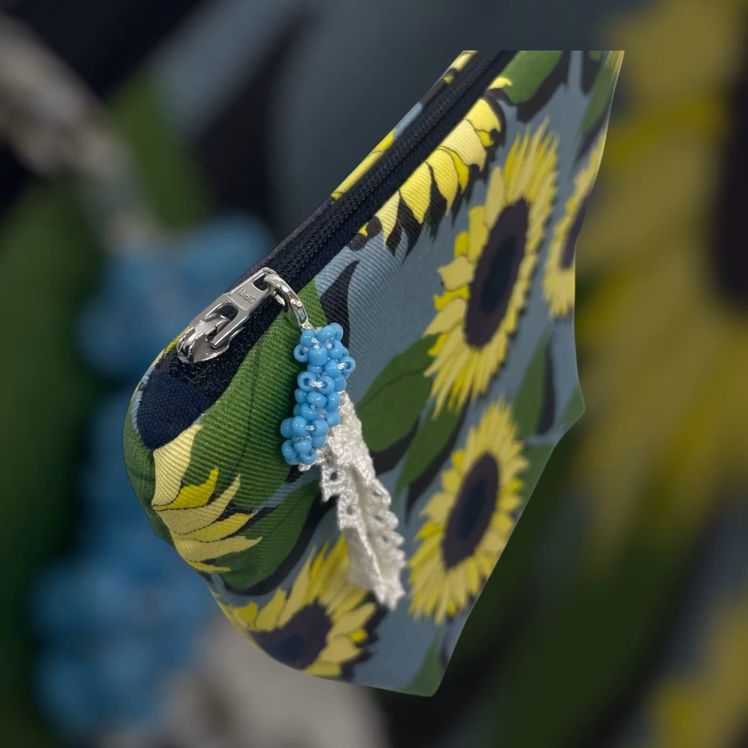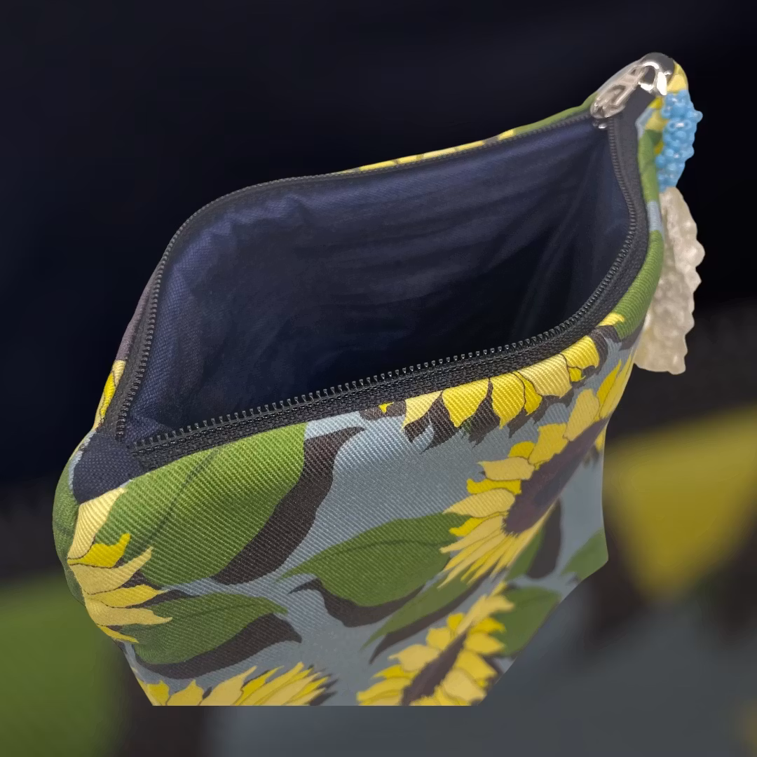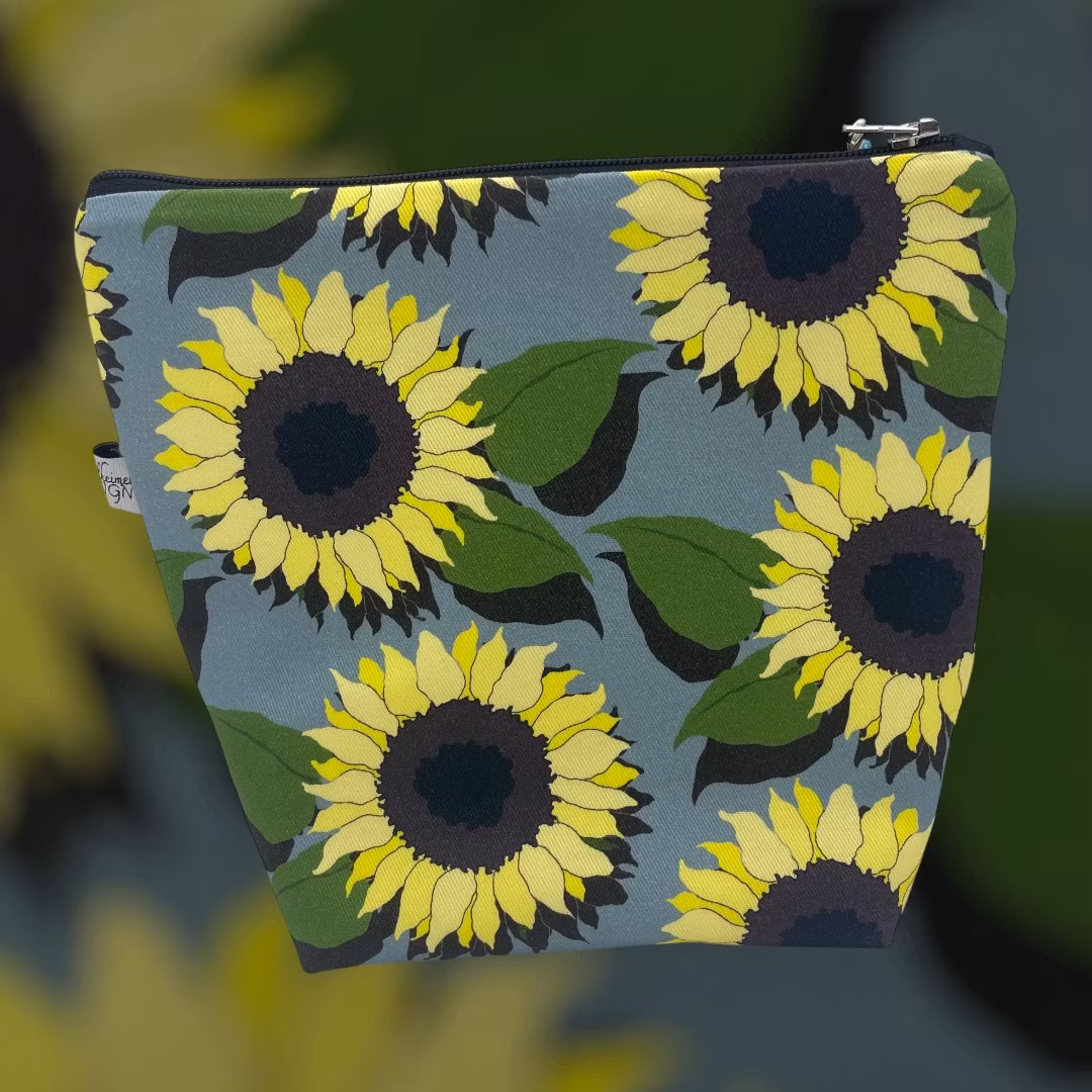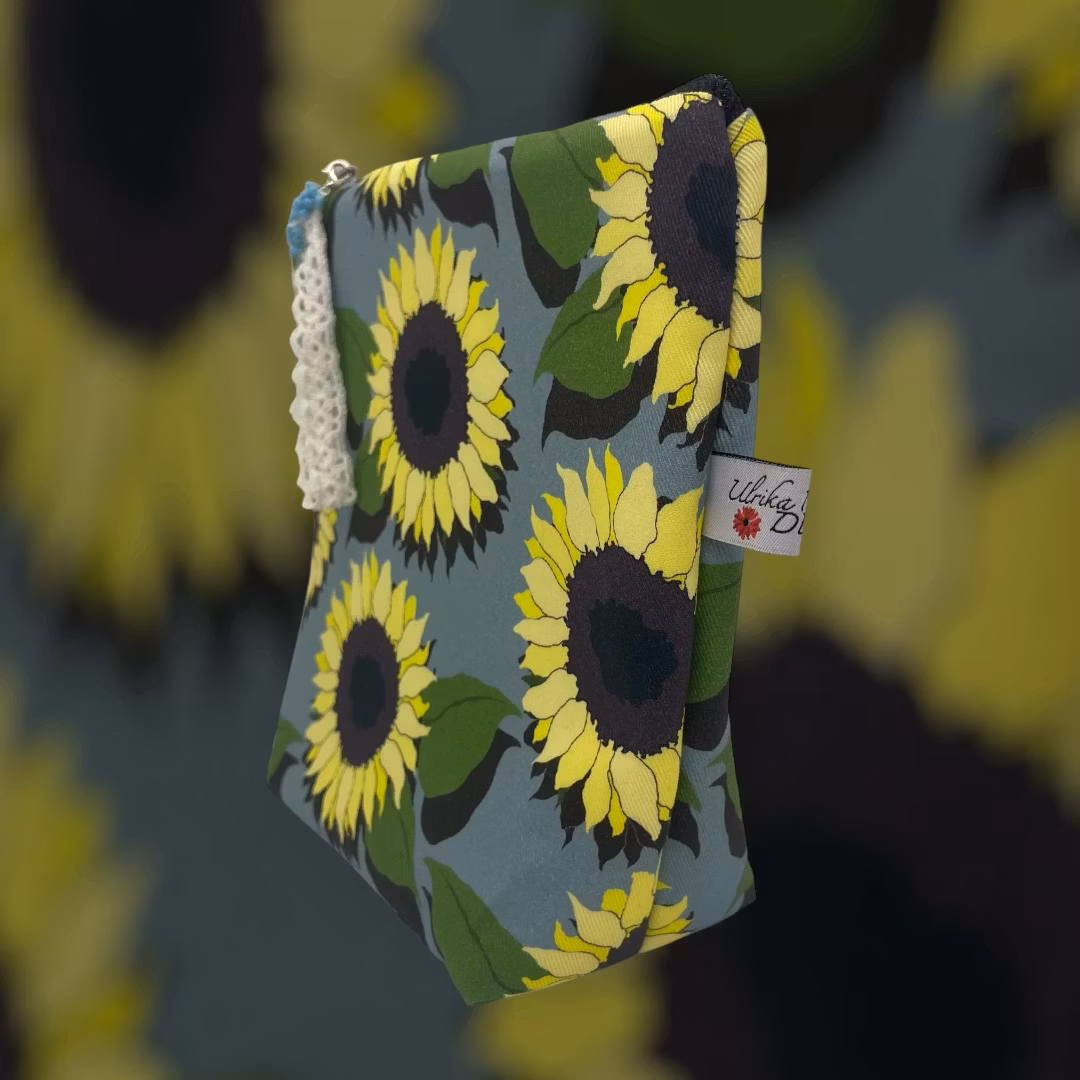 större makeup-väska/mindre necessär i mönstret Soliga solrosor på blått