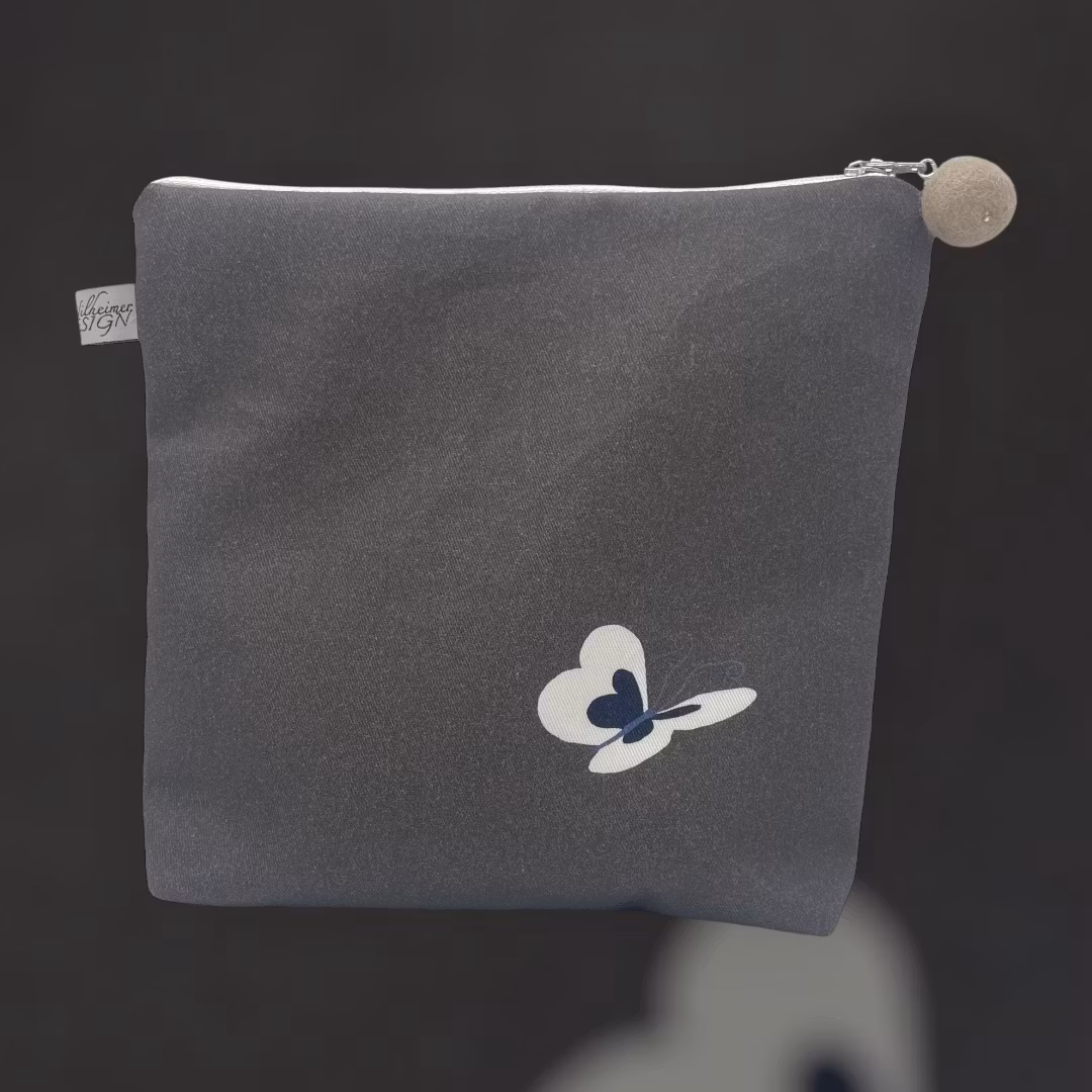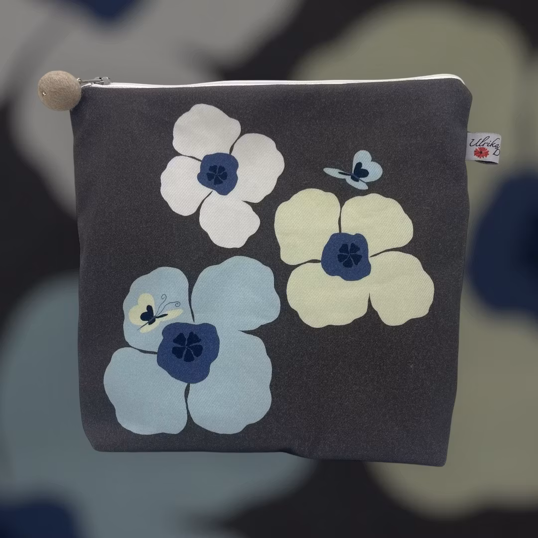 Yttertyget är sytt av GOTS-certifierad bomullstwill 240 g/m2 och ihopsytt med stark kapelltråd. Necessären mäter cirka 22 cm på bredden, djupet nedtill är 4 cm och höjden mäter cirka 20 cm. Fodertyget är bomullspoplin 130 g/m2. På blixtlåset har jag fäst en ullboll med pärla och som lätt kan tas bort med klo-låset den är fäst i.