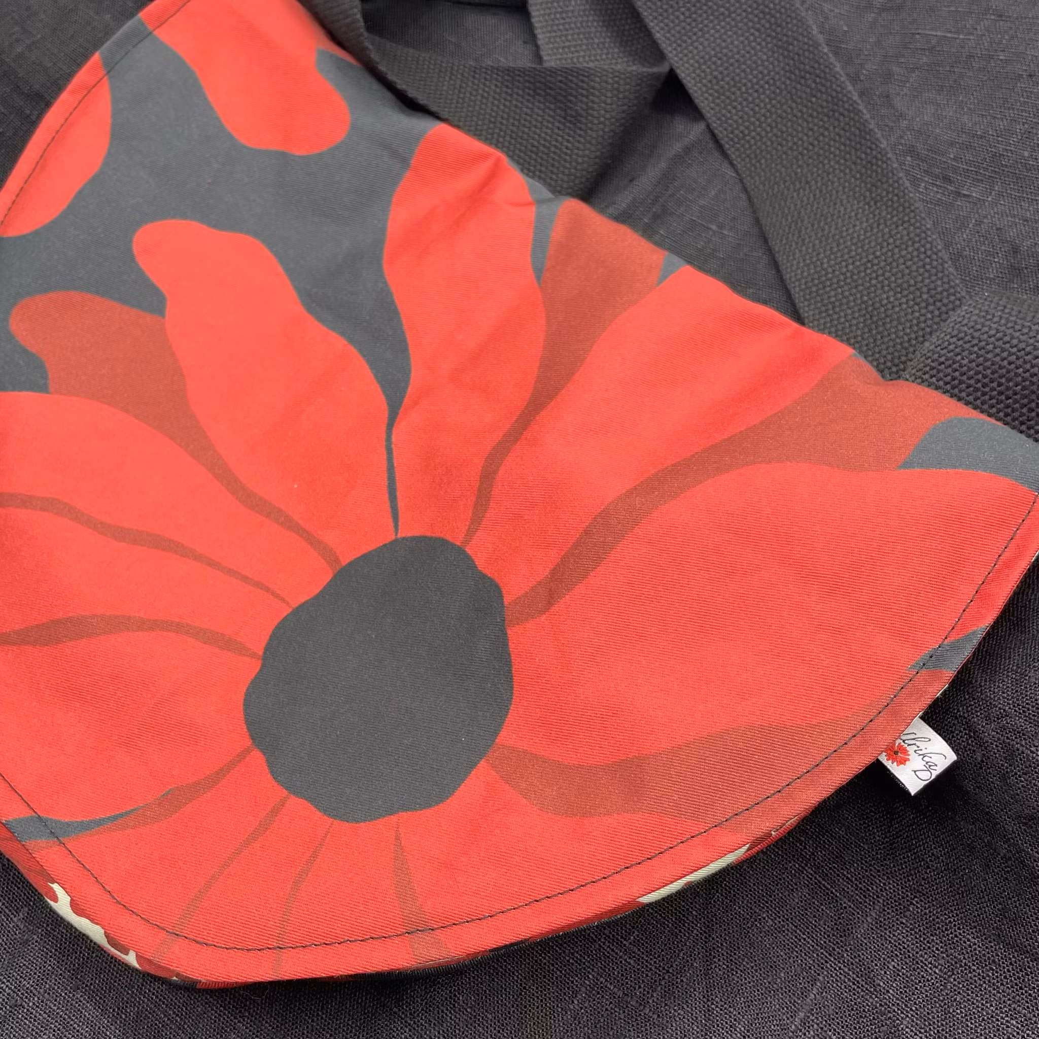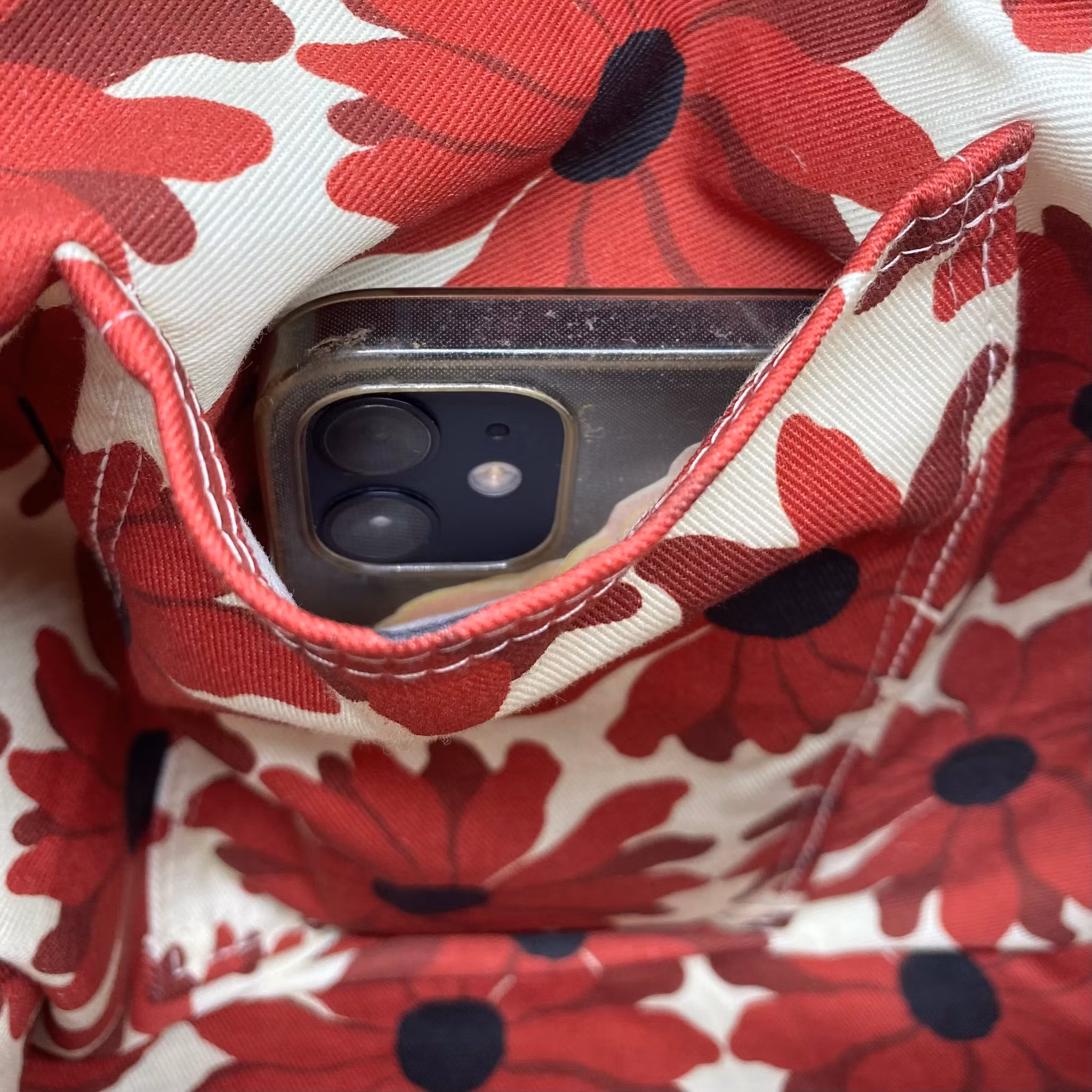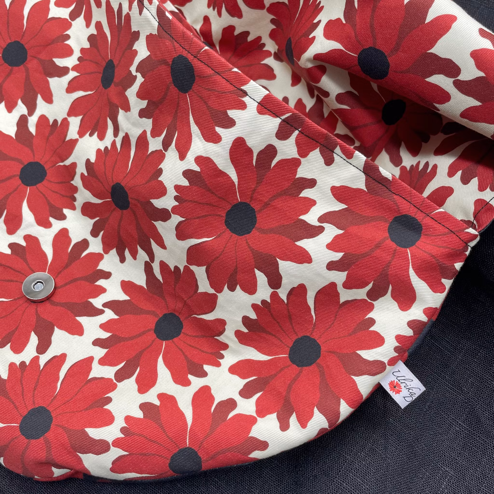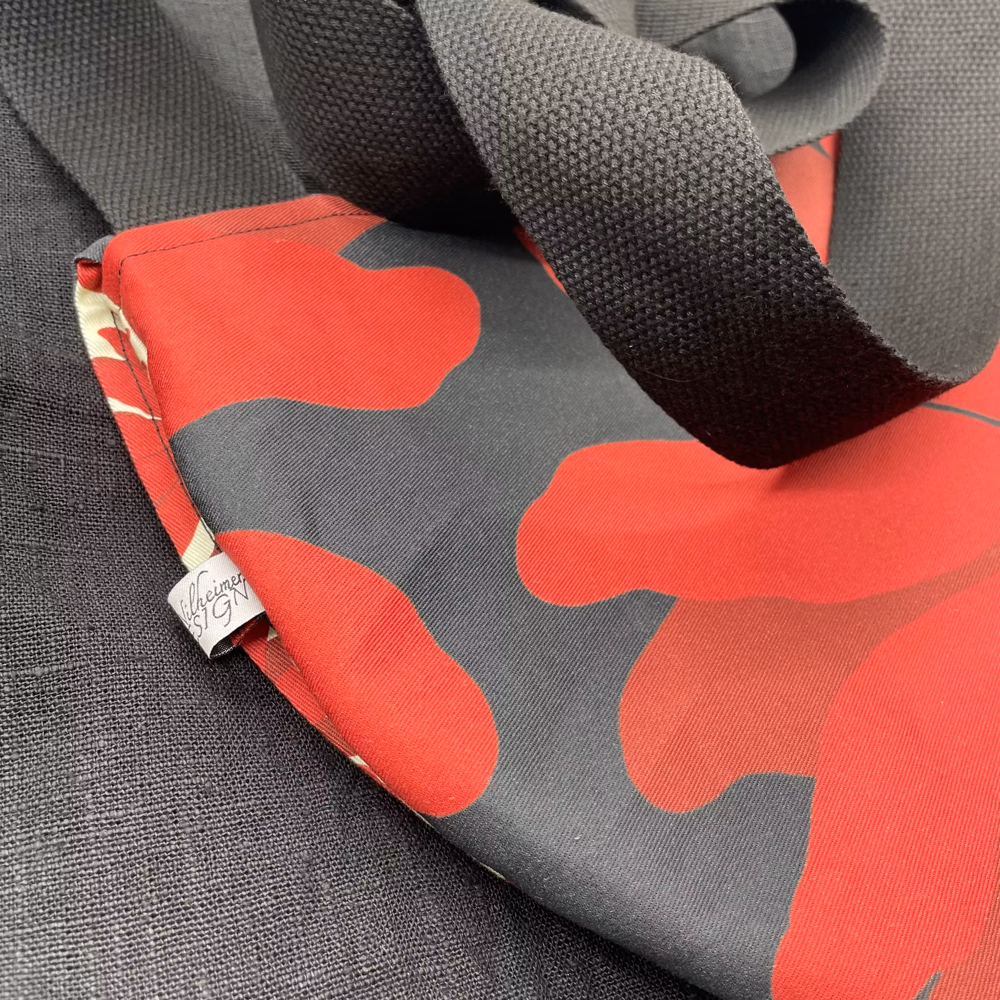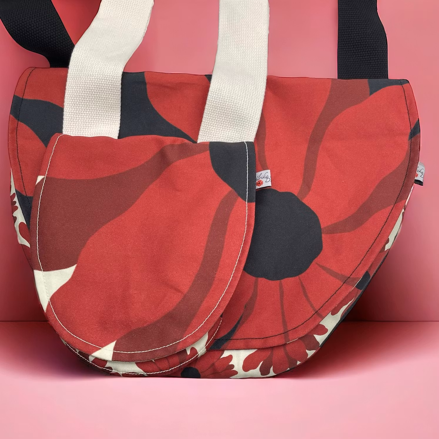 Väskan är en beställningsvara! Mina handväskor sys i twill av god kvalitet 240 g/m2 eller 265 g/m2, beroende på vilket tryckeri som trycker det mönster just du fastnar för. Twillen 265 g/m2 innehåller utöver bomull, även 3 % elastan. Fodret i denna lite större väska, sys även det i twill för extra stadga och tålighet. Därför förstärker jag inte särskilt med vliseline eller annat. Väskan har ett litet fack precis under locket och som du kan se på bilderna. Facket på bilden mäter cirka 11 x 17 cm, precis lagom för min mobil. Din storlek på mobil får styra storleken på facket på din väska. Hela axelbandet mäter närmare 120 cm, väskans bredd mäter kring 36 cm och höjden mäter kring 28 cm. Axelbanden består av vävd bomullscanvas och kan väljas i enfärgad svart, vit eller beige. Locket på den större väskan, stängs med en litet större magnetknapp.