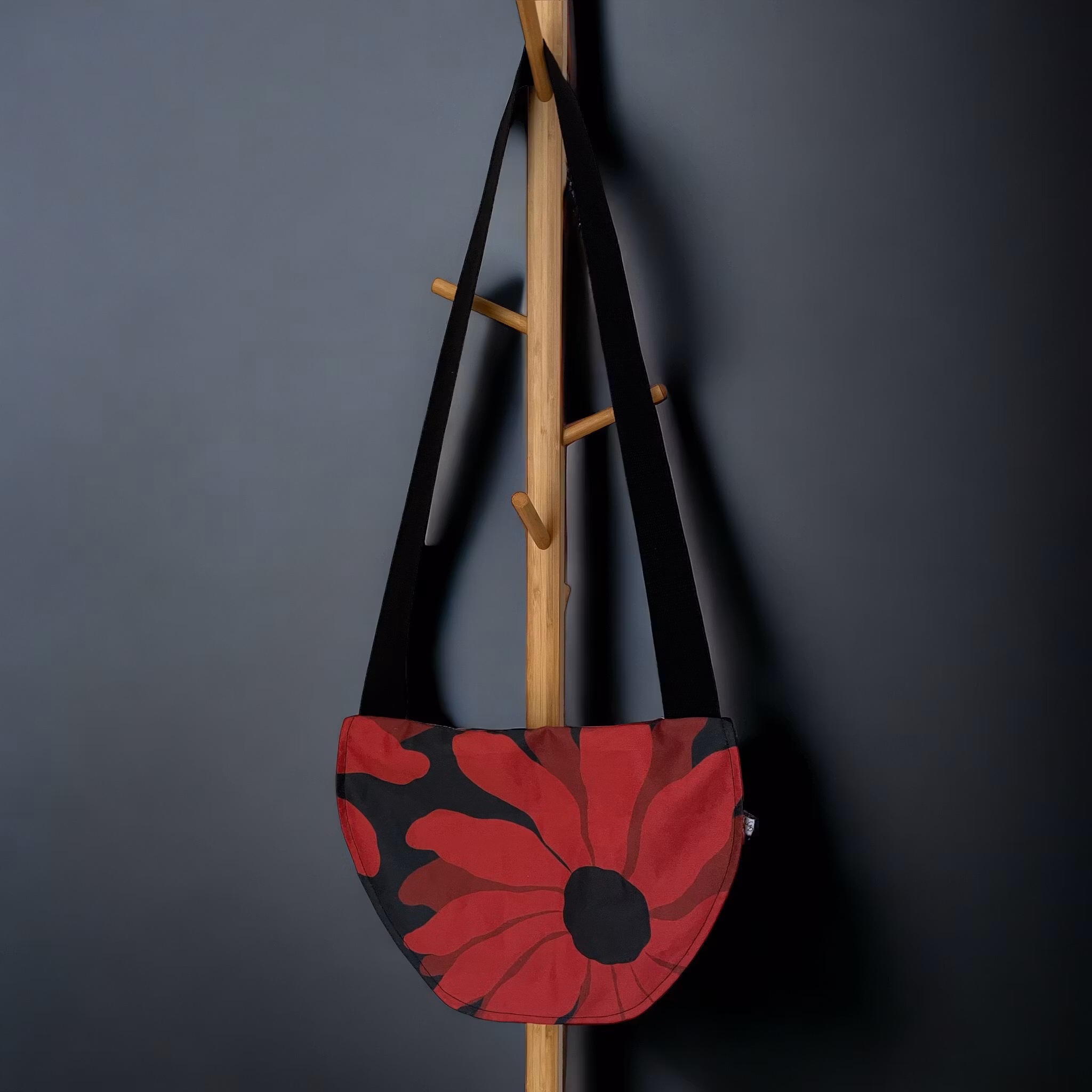 Min egen design av en cross body/axelremsväska. Väskan är grund och rymlig på en och samma gång. I den här ska du kunna bära med dig det du behöver under en dag, som du vill ha nära dig, lättillgängligt och bekvämt vilande på höften. Se mina två filmer på Instagram och Facebook, där du kan se exempel på vad jag packar ner i mina två olika axelremsväskor, så att du får en uppfattning. Väskan har ingen botten. Jag själv vill till exempel att den väska jag bär med mig, ska vara lätt att hitta i. Och vill jag bära med mig ett flertal småsaker i väskan, stoppar jag ner dem i en liten börs/necessär, som i sin tur stoppas ner i väskan.