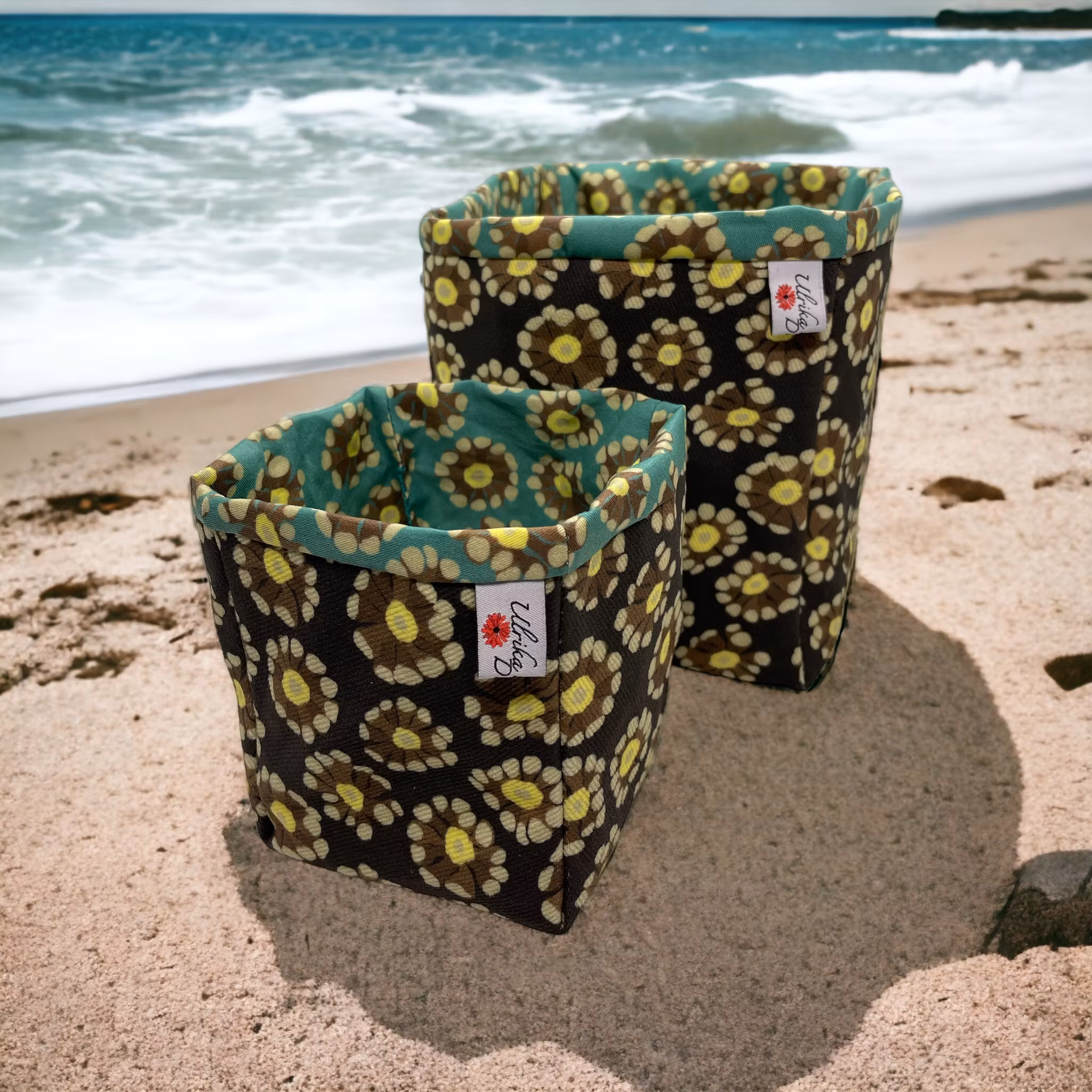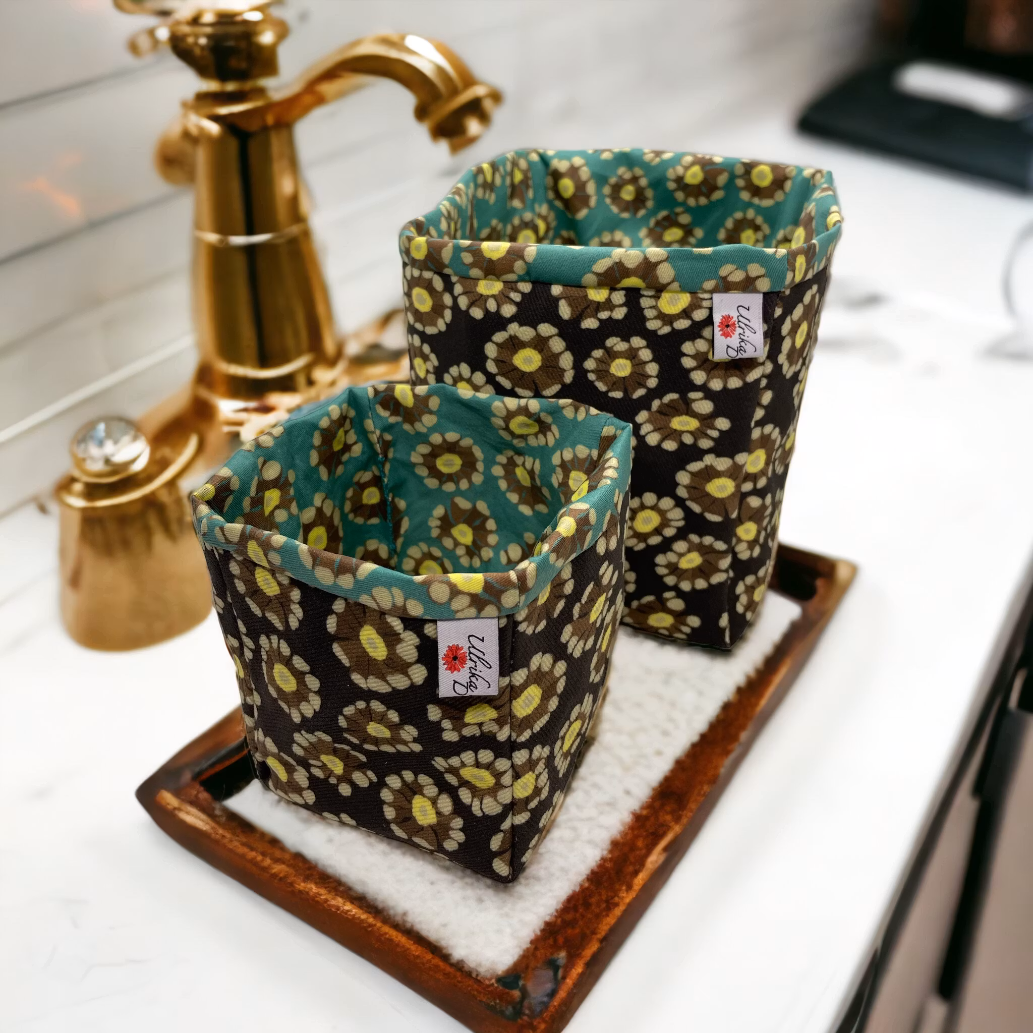 Korgarnas yttertyg är sytt av kraftig bomullstwill 375 g/m2 och fodret är sytt av klassisk bomull 145 g/m2. Yttertyget är förstärkt med vliseline. Den stora korgen mäter cirka 16 cm på höjden och 14 cm längs alla fyra sidor. Och den lilla korgen är cirka 11 cm hög och mäter 9 cm längs sidorna. Att stoppa ner ett tråkigt ytterfoder i eller i badrummet, för allsköns hudvård, tops och bomull. Jag har en korg med servetter på matbordet. Vill du ställa ner prylar i korgarna som inte kan stå upp själva, behöver du ha en behållare inuti korgen, som kan bära tyngden. Återvinn någon plåt- eller glasburk vetja´, eller använd någon av de skålar eller burkar du har någonstans i dina skåp. I den lilla korgen, går en vanlig honungsburk ner till exempel.