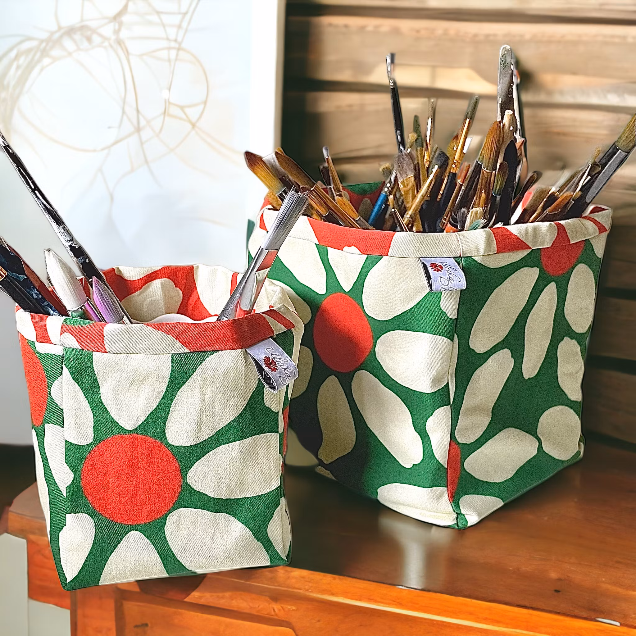 Korgarnas yttertyg är sytt av bomullstwill 265 g/m2 och fodret är sytt av klassisk bomull 145 g/m2. Yttertyget är förstärkt med vliseline. Den stora korgen mäter 14,5 cm på höjden och 13,5 cm längs alla fyra sidor. Och den lilla korgen är 11 cm hög och mäter 9,5 cm längs sidorna. Att stoppa ner ett tråkigt ytterfoder i eller i badrummet, för allsköns hudvård, tops och bomull. Jag har en korg med servetter på matbordet. Vill du ställa ner prylar i korgarna som inte kan stå upp själva, behöver du ha en behållare inuti korgen, som kan bära tyngden. Återvinn någon plåt- eller glasburk vetja´, eller använd någon av de skålar eller burkar du har någonstans i dina skåp. I den lilla korgen, går en vanlig honungsburk ner till exempel.