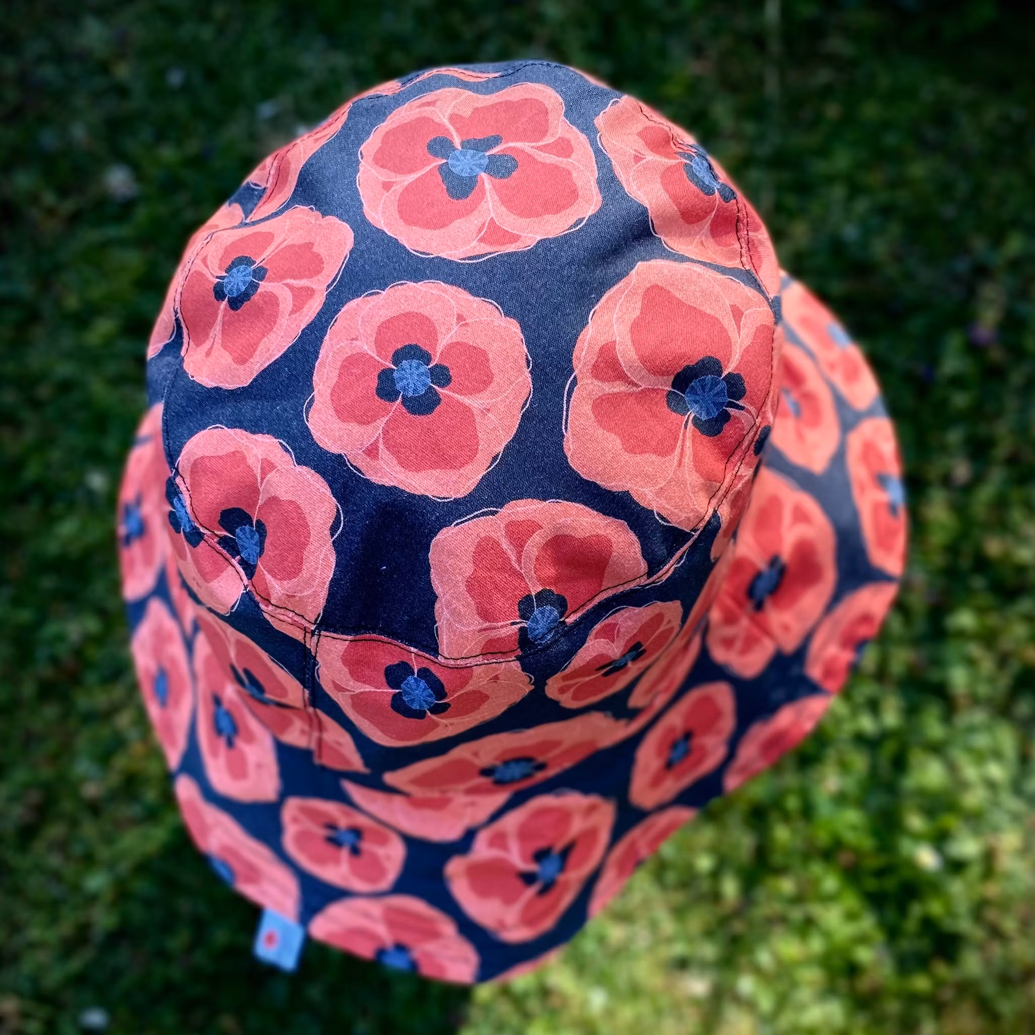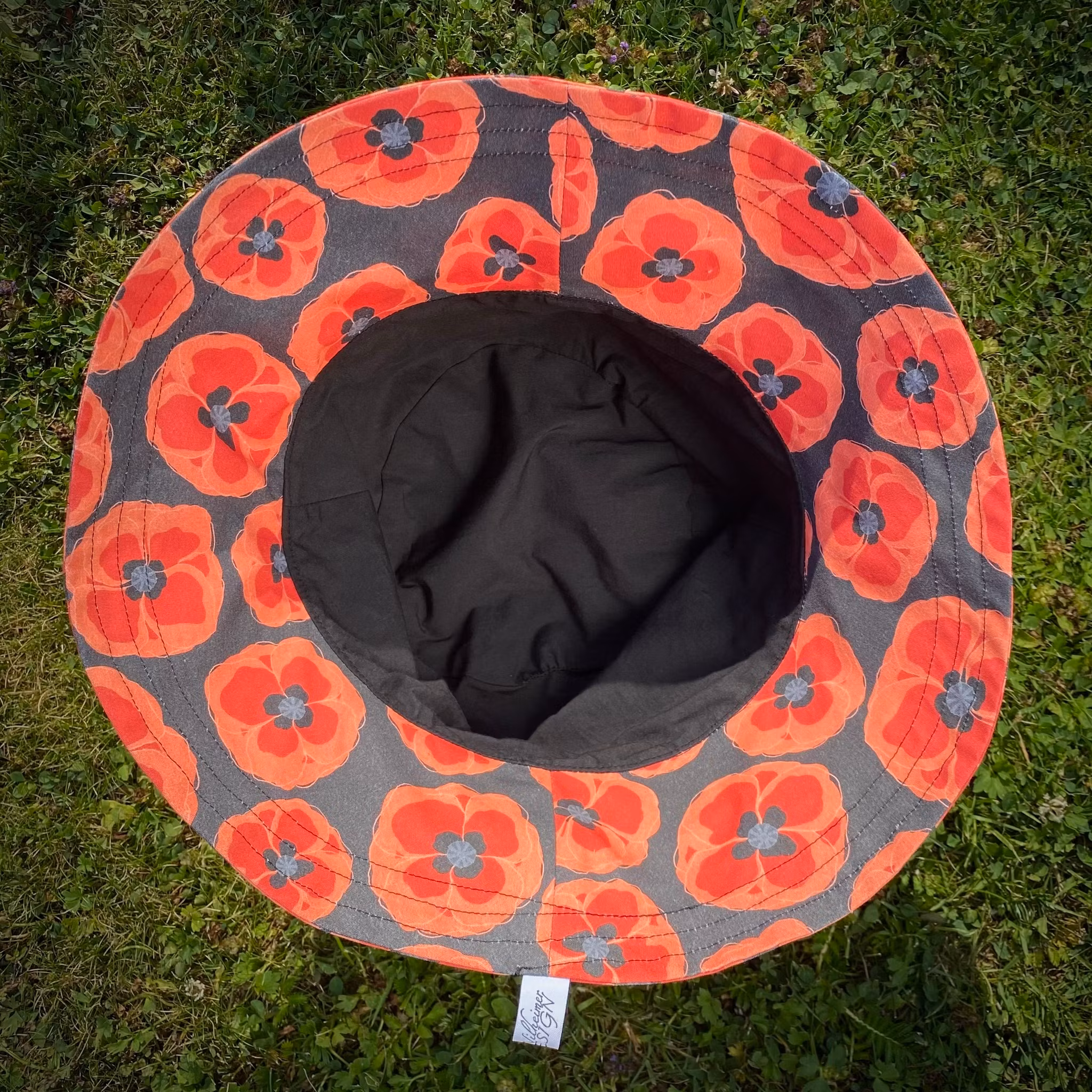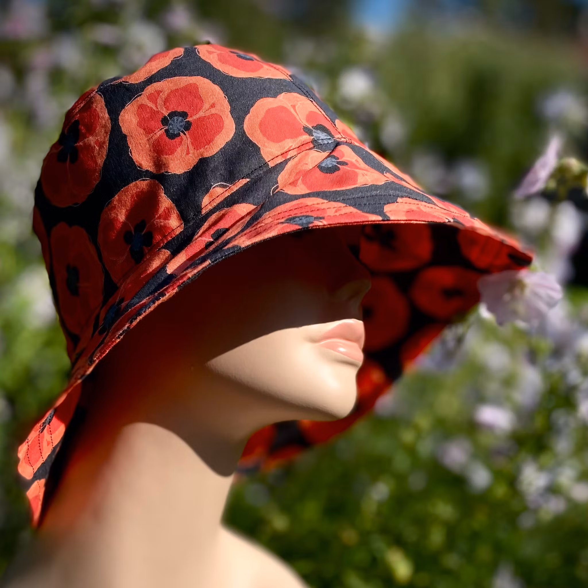 Material och storlek: Hatten är sydd av min canvas (185 g/m2) och passar dig med något större huvud och som mäter 60 cm kring huvudets bredaste ställe. Den kan passa även dig med ett något mindre huvud, om du trivs bäst med en lösare passform på din hatt. Det svarta fodret i hattens kulle är sytt av GOTS-certifierad svart och rejäl bomullspoplin.(130 g/m2)