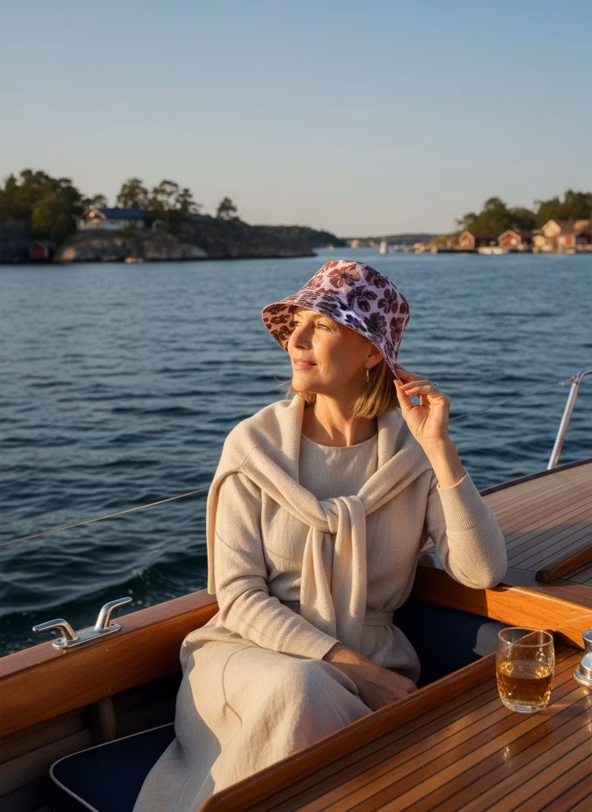 Material och storlek: Hatten är sydd av min canvas (185 g/m2) och passar dig som mäter 58 cm kring huvudets bredaste ställe. Den kan även passa dig med ett något mindre huvud, om du trivs bäst med en lösare passform på din hatt. Det rosa fodret i hattens kulle är sytt av GOTS-certifierat bomullspoplin. (130 g/m2) Hatten är sydd utan mellanlägg och känns mjuk och sval på huvudet.