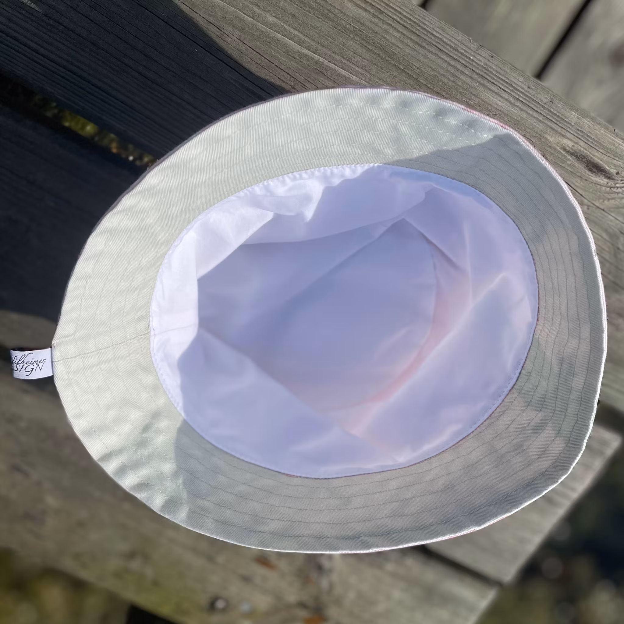 Material och storlek: Hatten är sydd av min twill (240 g/m2) och passar dig med något större huvud och som mäter 60 cm kring huvudets bredaste ställe. Den kan även passa dig med ett något mindre huvud, om du trivs bäst med en lösare passform på din hatt. Det vita fodret i hattens kulle är sytt av GOTS-certifierad och rejäl bomullspoplin.(130 g/m2) Tanken när jag gjorde modellen var att spara in på antalet sömmar, att göra hatten mer enkel och stilren än vanliga Bucket-hattar. Sömmar och skarvar stör mönstrade hattar, tycker jag, som gillar den enkla. Då det rosa Maarit-tyget tog slut, fick jag använda en salviagrön bit twill jag hade i gömmorna och som matchade det gröna på sländorna helt perfekt. Effekten blir fin när brättet viks upp lite! En helt unik hatt som du är ensam om!