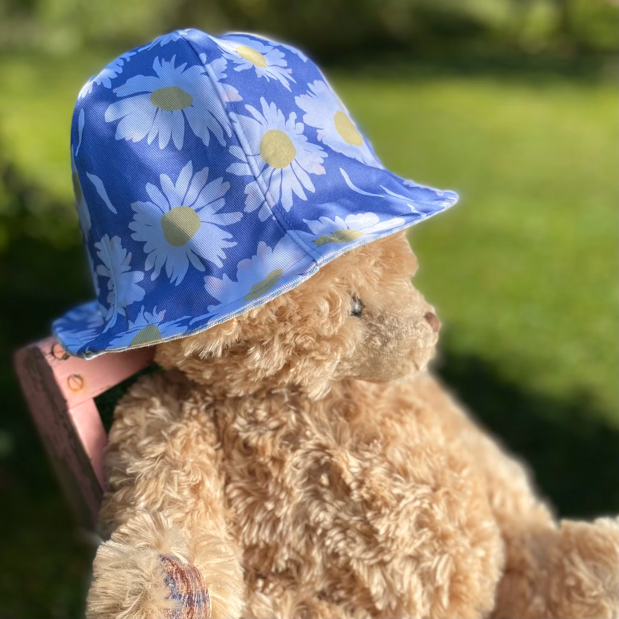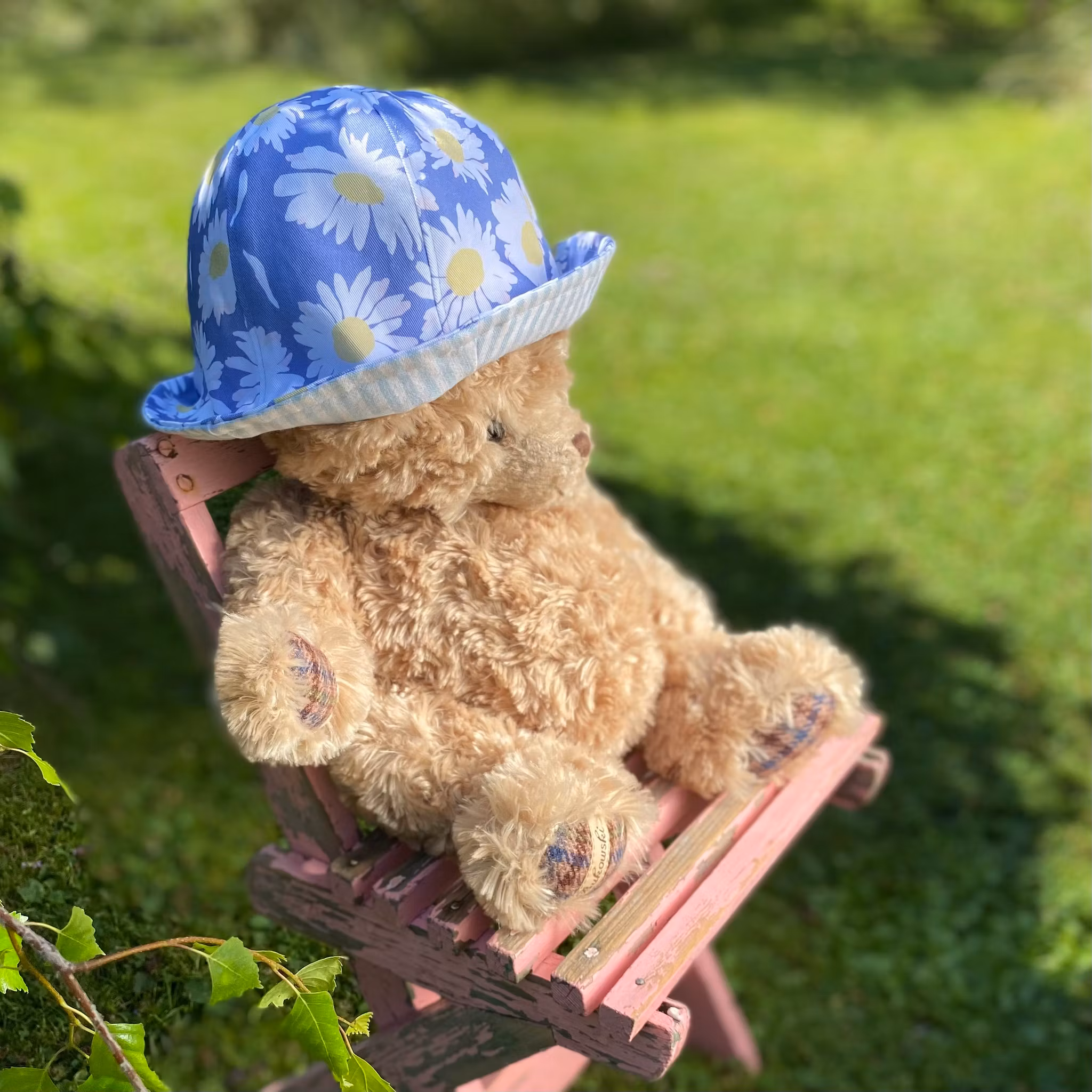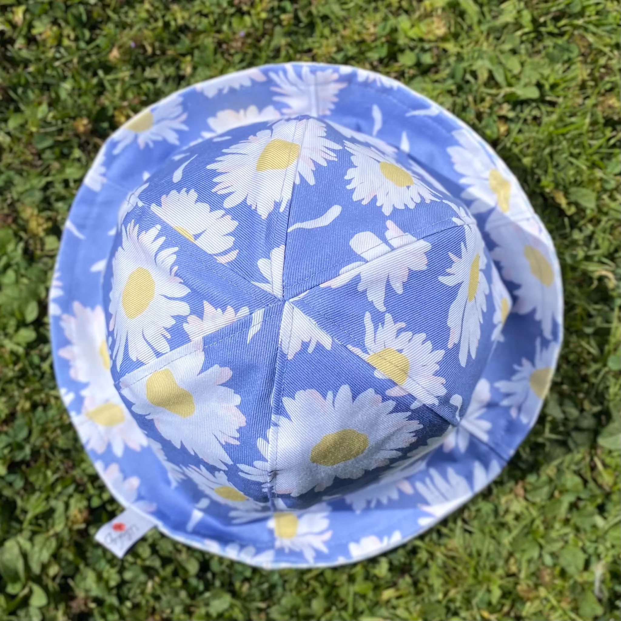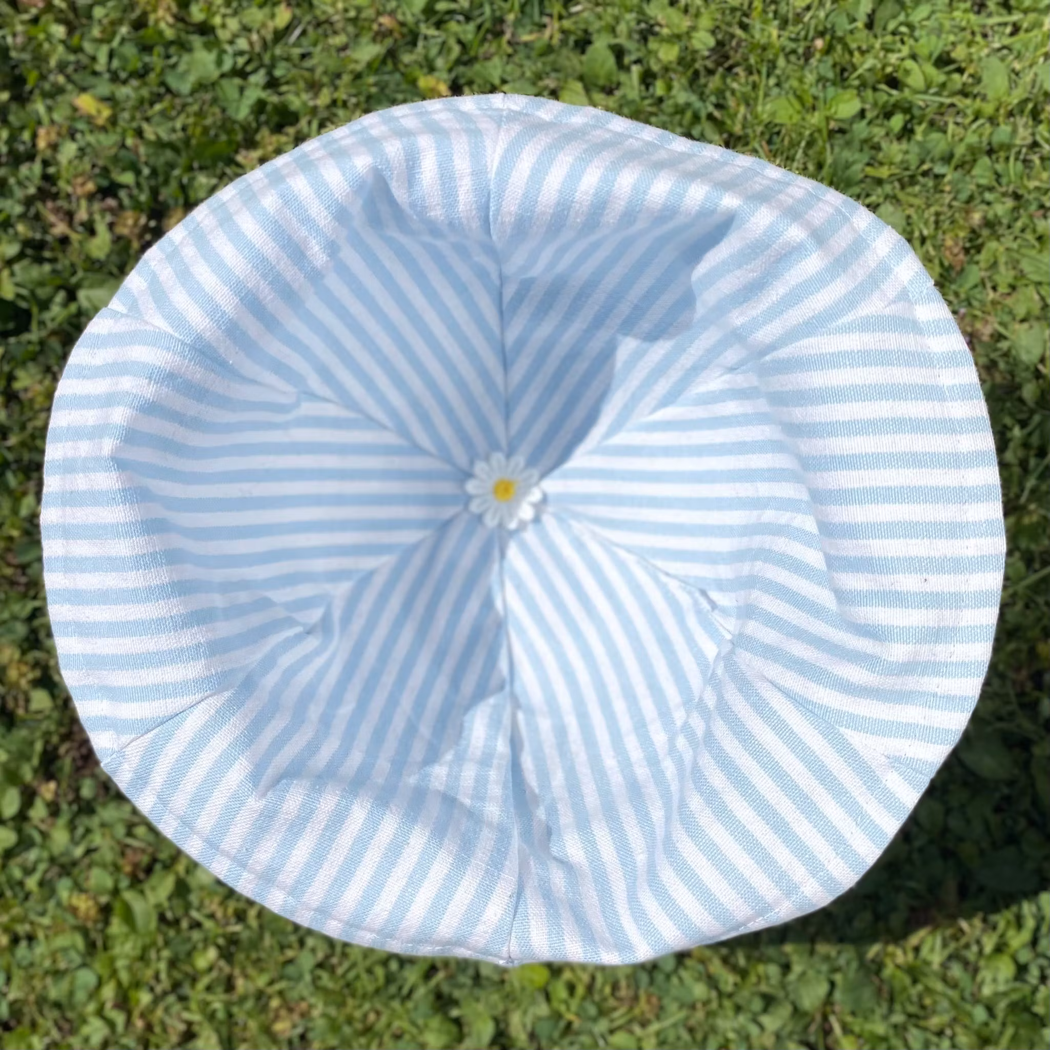Material och storlek: Hatten är sydd av min twill (240 g/m2) och passar ett barn som mäter cirka 50 cm kring huvudets bredaste ställe, till ett barn +2 år alltså. Modellen är dock generös och kan passa även ett barn med litet större huvud. Mät huvudknoppen på barnet för att vara på den säkra sidan. Det blå- och vitrandiga innerfodret är sytt av ett tidigare oanvänt bomullstyg jag fyndat på loppis. I fodret har jag fäst en spetsblomma.