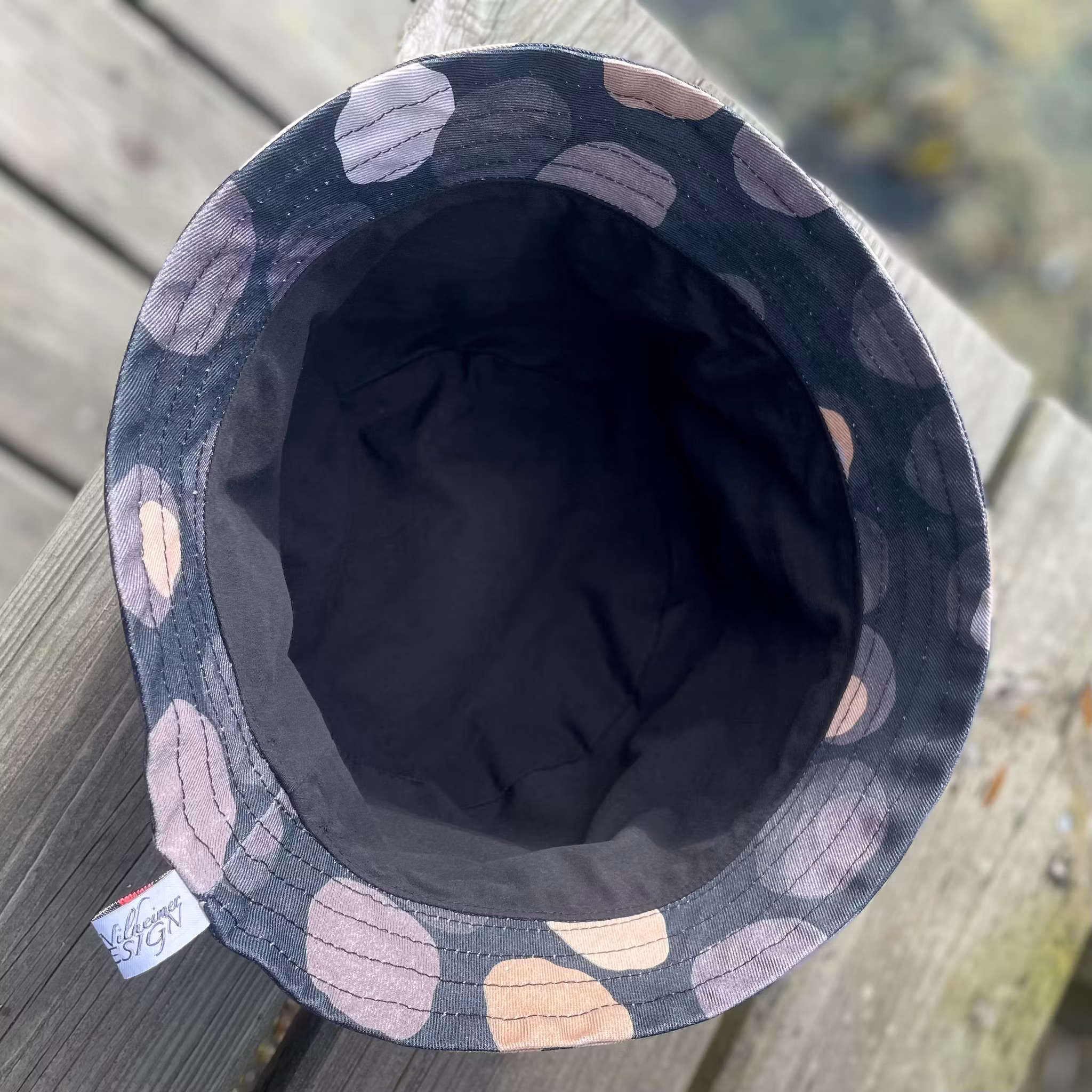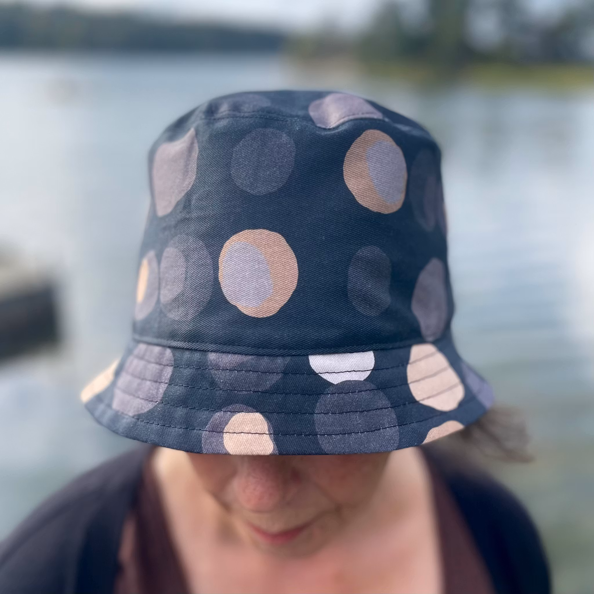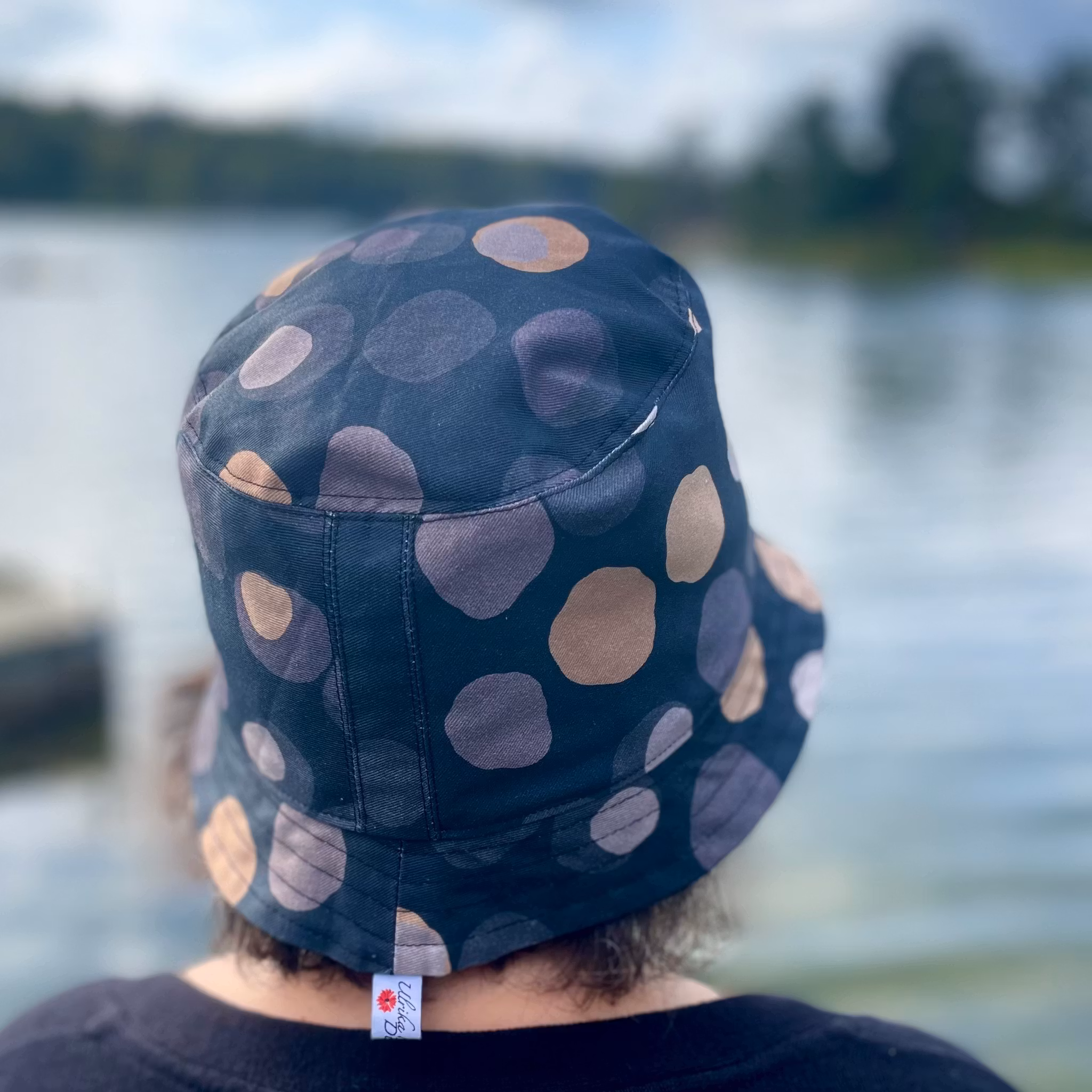 Material och storlek: Hatten är sydd av min twill (240 g/m2) och passar dig med något större huvud och som mäter 60 cm kring huvudets bredaste ställe. Den kan även passa dig med ett något mindre huvud, om du trivs bäst med en lösare passform på din hatt. Det svarta fodret i hattens kulle är sytt av GOTS-certifierad och rejäl bomullspoplin.(130 g/m2) Just på den här hatten har jag skarvat in en kil i den bakre sömmen på yttertyget, när jag skapade mallen och testade mig fram. Jag tycker att det blev en snygg detalj, men så sys inte mina kommande "sassy n swags". Tanken när jag gjorde modellen var också att spara in på antalet sömmar, att göra hatten mer enkel och stilren än vanliga Bucket-hattar. Sömmar och skarvar stör mönstrade hattar tycker jag, som gillar den enkla.