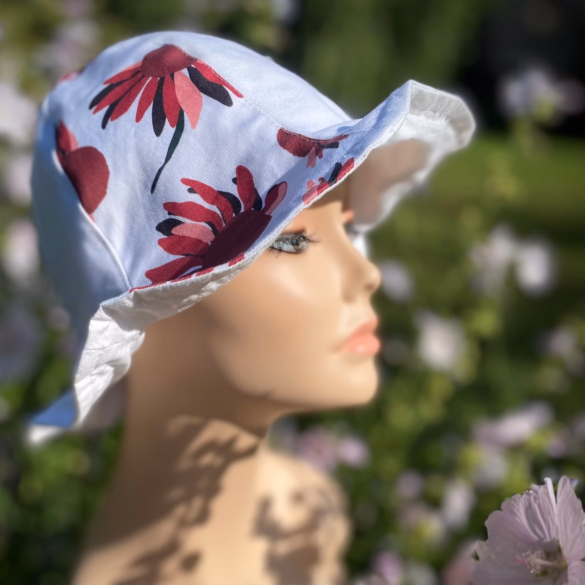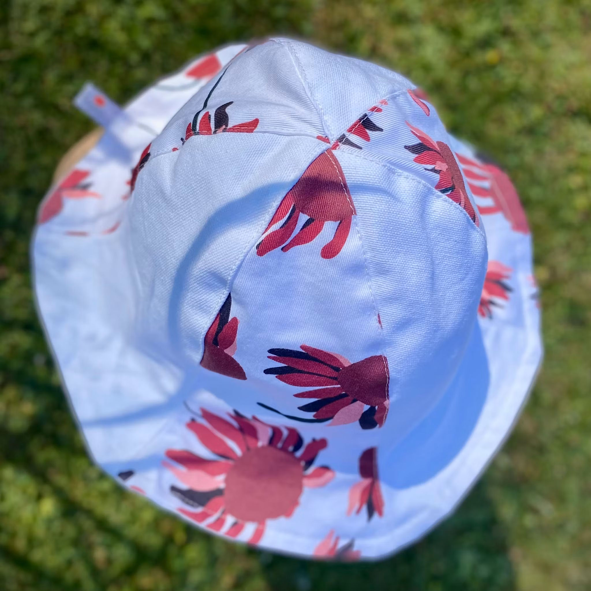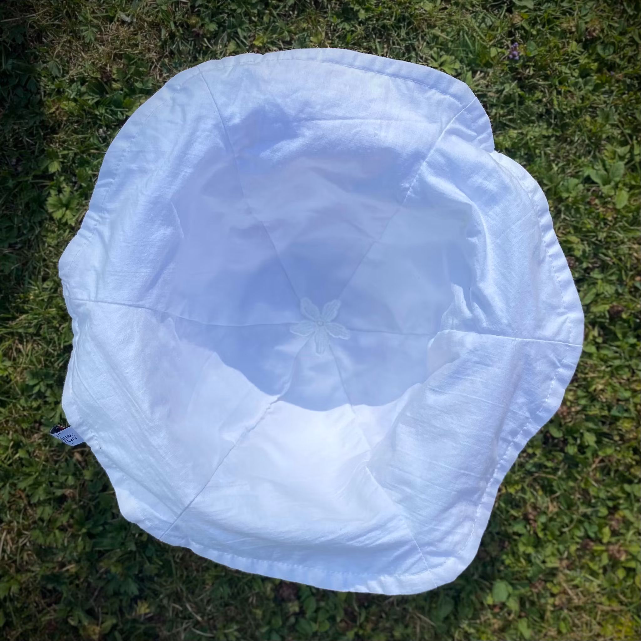 Material och storlek: Hatten är sydd av min twill (240 g/m2) och passar dig som mäter 58 cm kring huvudets bredaste ställe. Jag har varvat Salut! med ett vitt, oanvänt och kraftigare bomullstyg jag hade i gömmorna. Det vita innerfodret är sytt av ett fräscht och tidigare oanvänt bomullstyg jag fyndat på loppis. Hatten har en vit spetsblomma fäst inuti fodertyget.