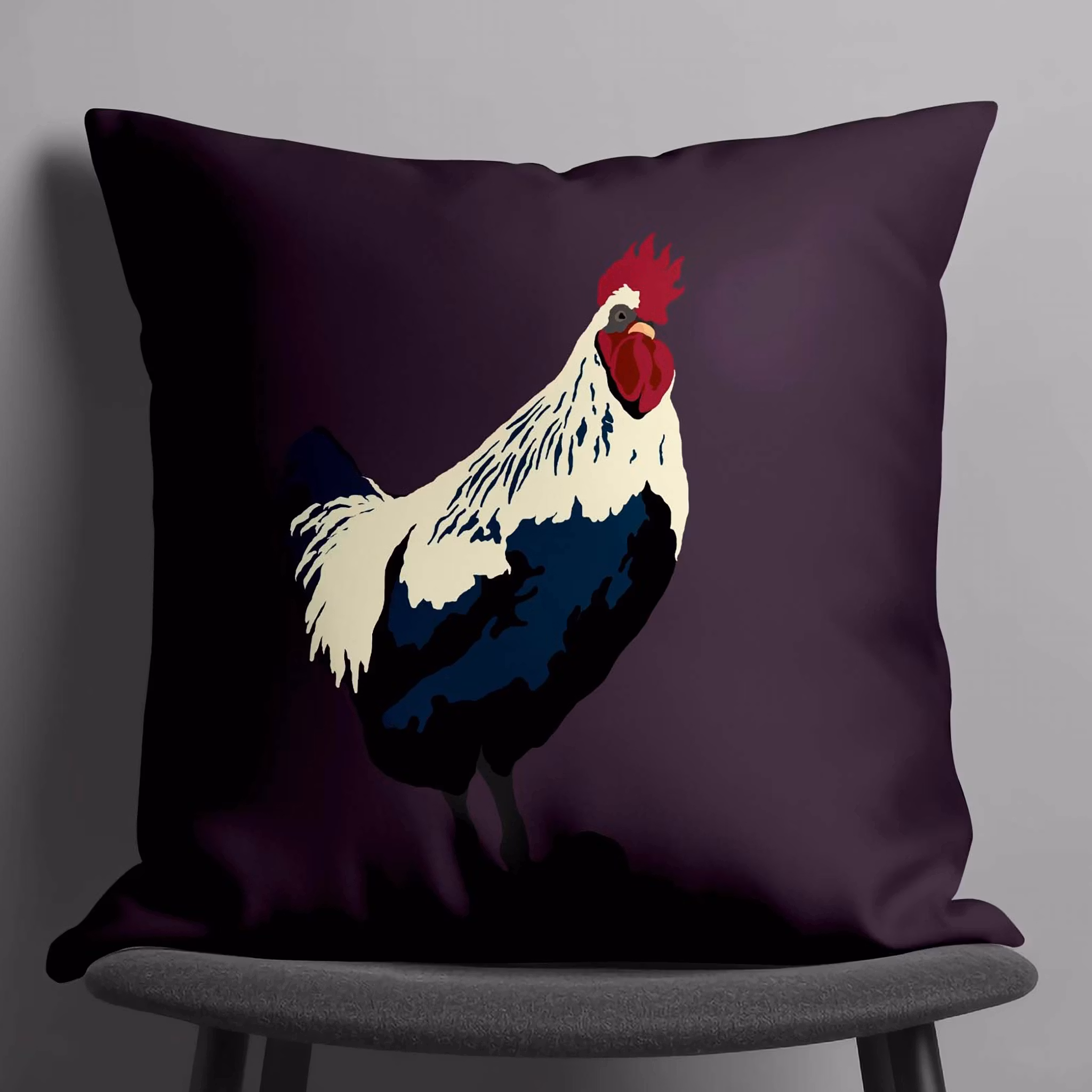 en stilig och stolt tupp, på ett lila kuddfodral!