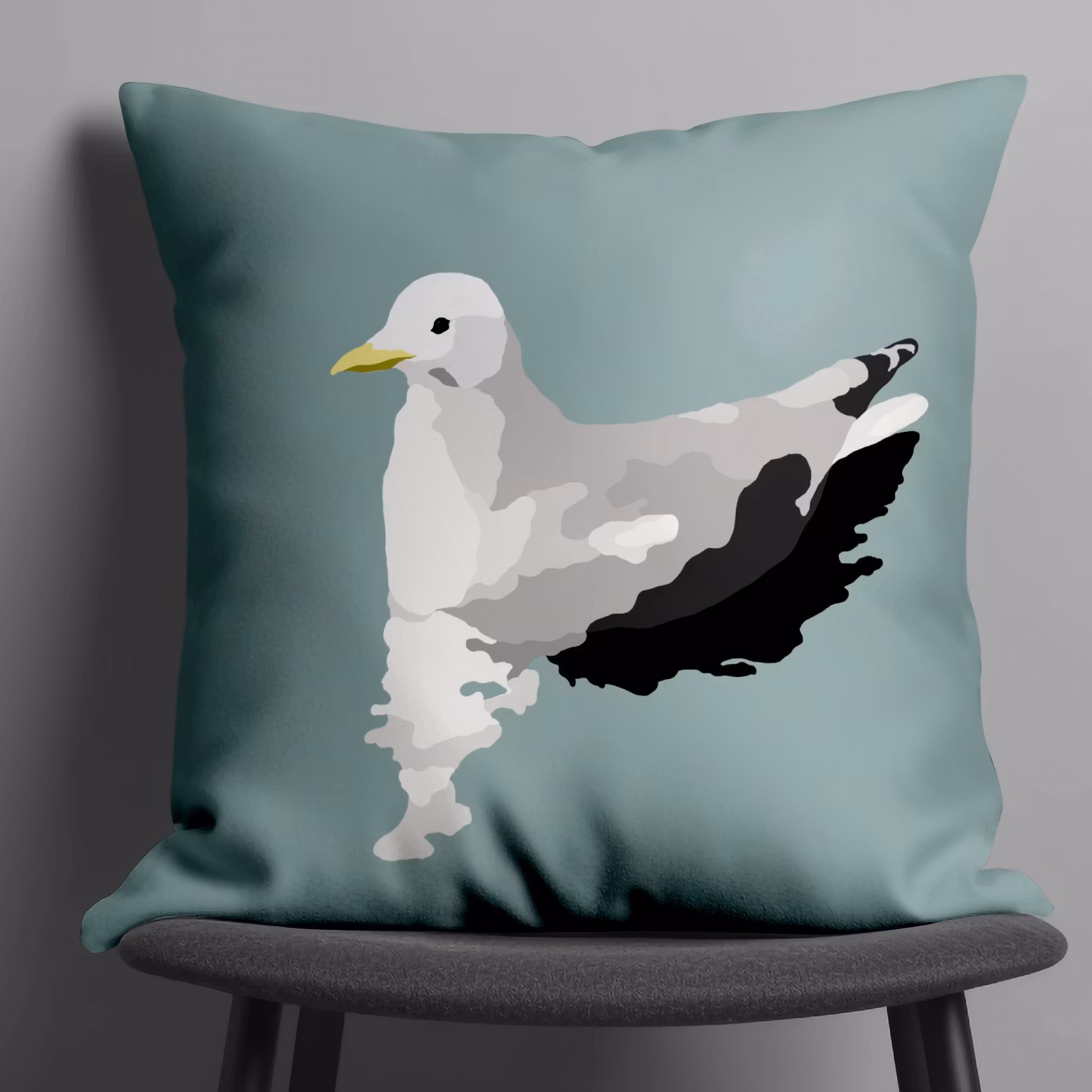 En mås som jag en gång målade och sålde prints av, här på kuddfodral! Som man ofta kan se dem härute i skärgården, liggande i sjön, i solen, väntande..
