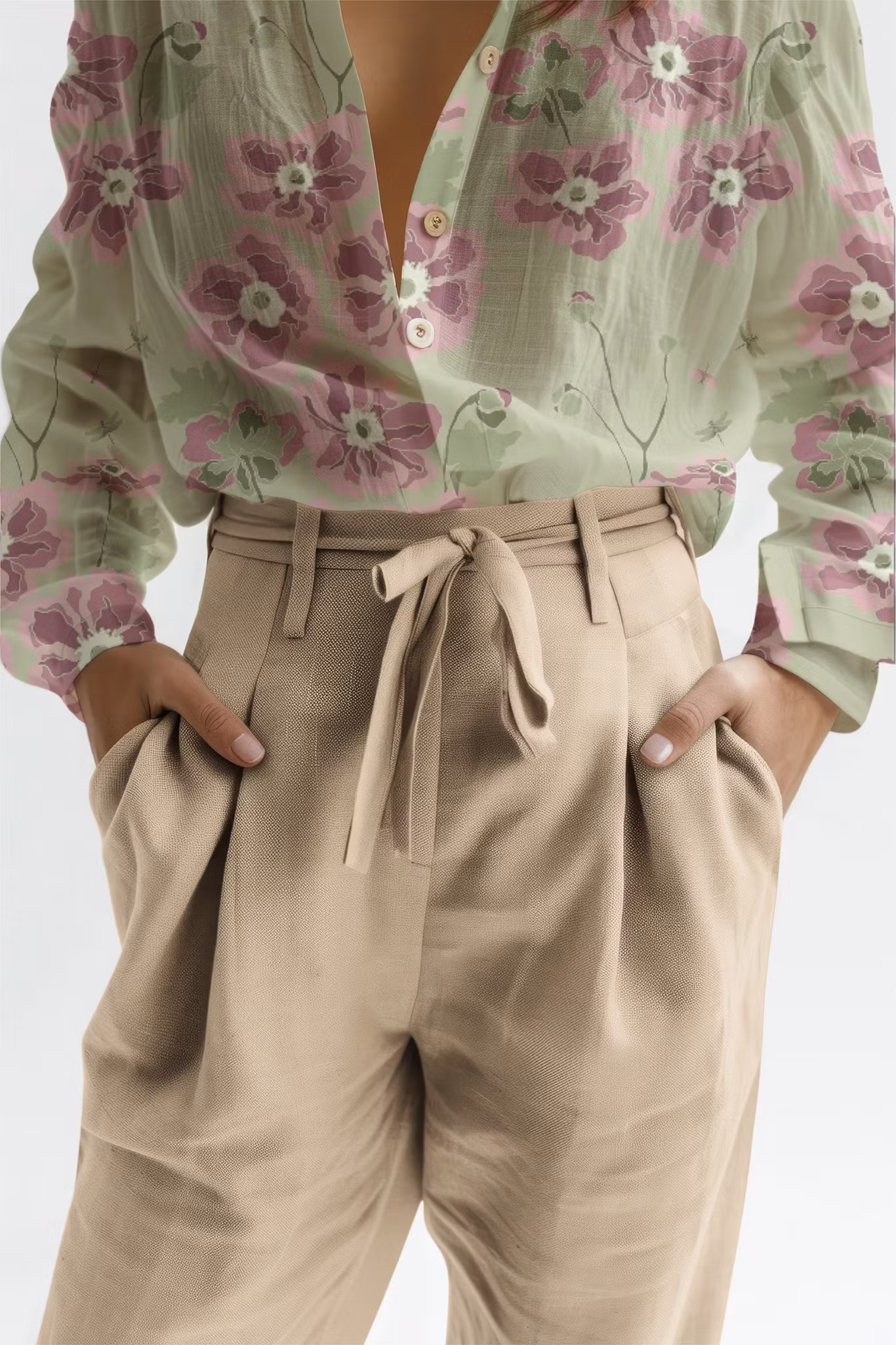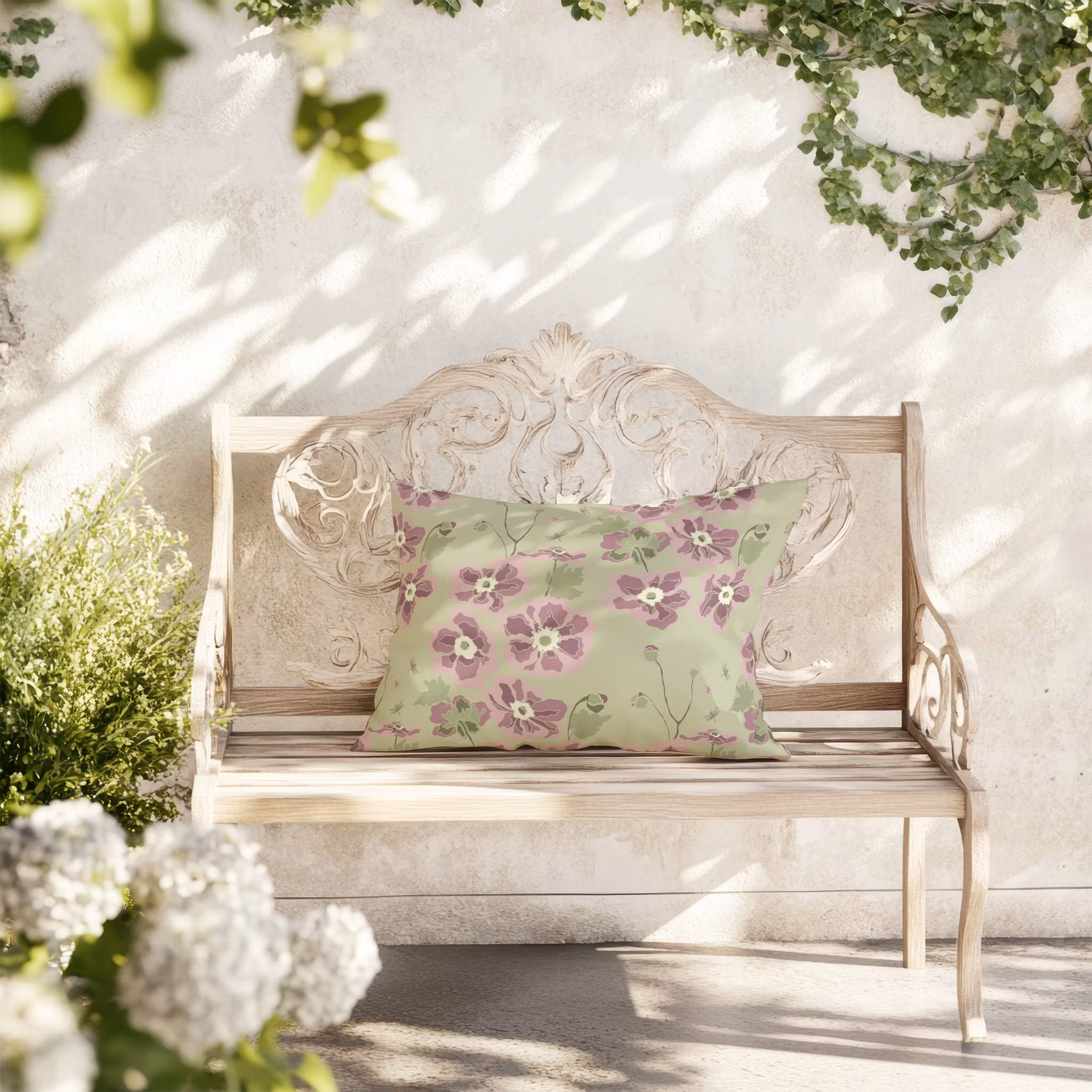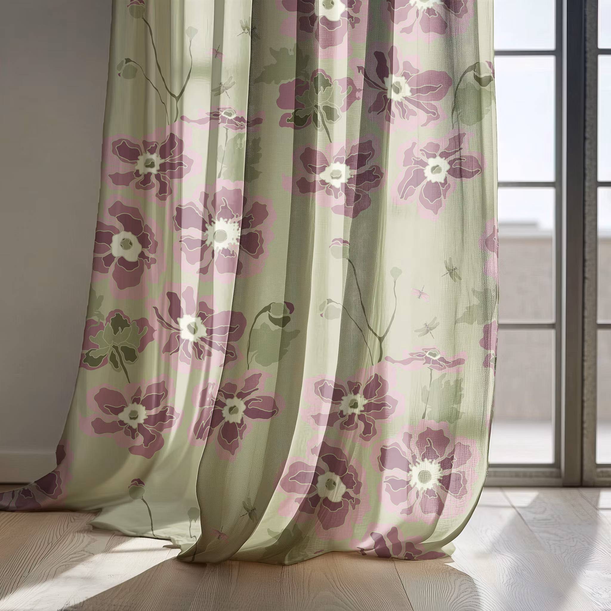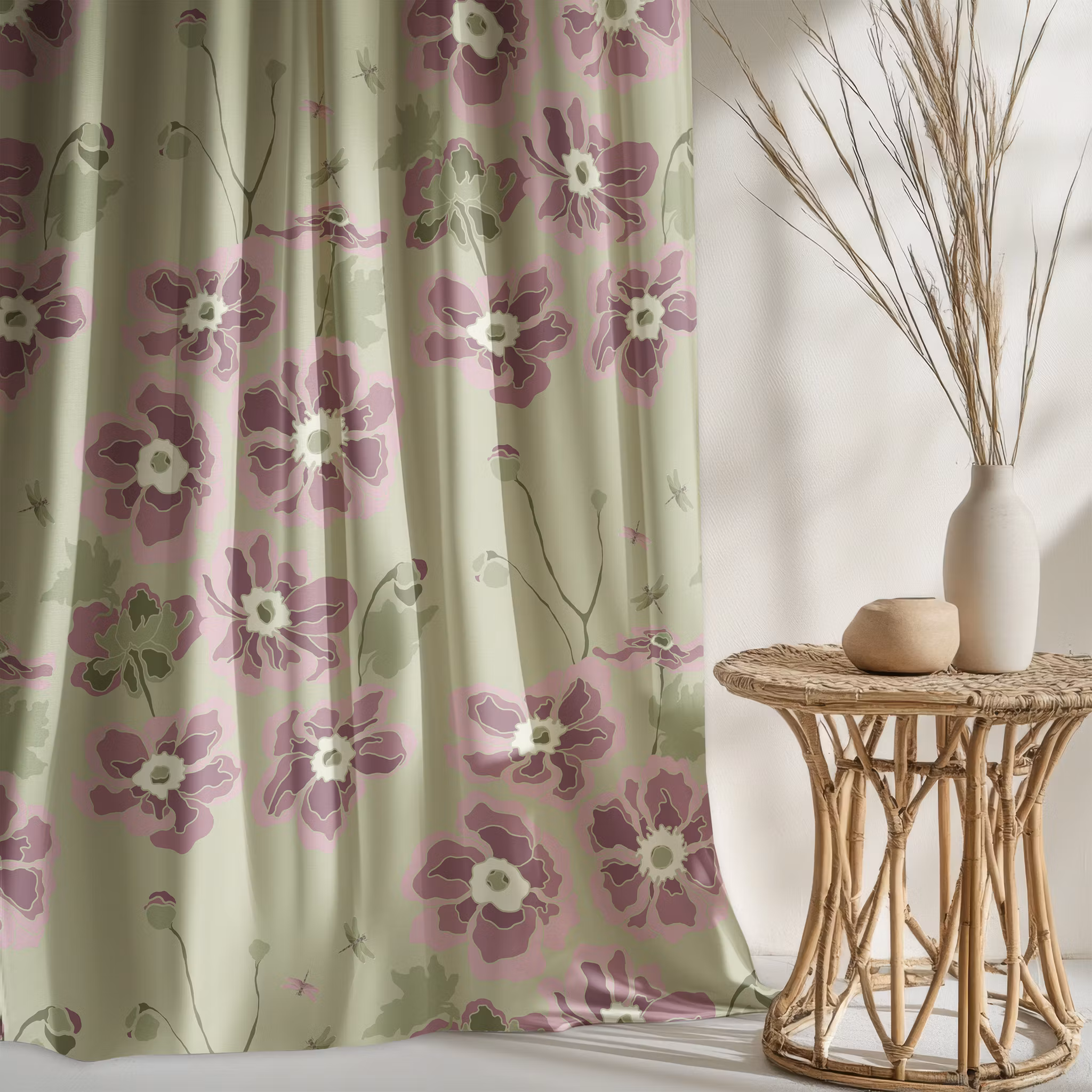 Anemona, höstanemoner på olivgrön bomull