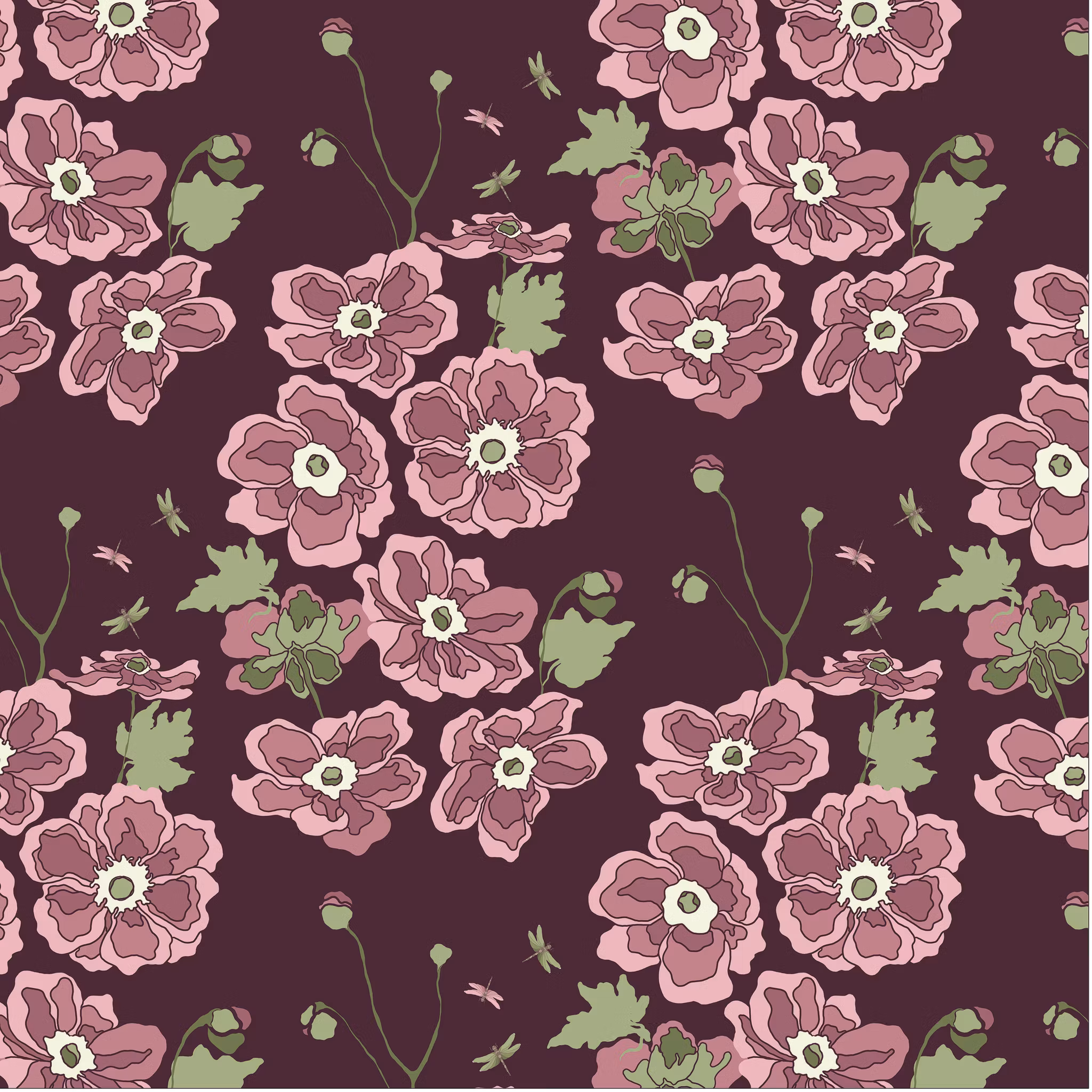 Höstanemonerna! Med sländor svirrandes i mönstret, hos oss dyker de upp i mängder i augusti. Och kort därefter blommar höstanemonen. Anemonen är så utsökt vacker, bara namnet känns så mjukt och härligt i munnen! Här har jag lekt med dess former och uttryck! Samma bakgrundsfärger och palett finns i mönstret Maarit och de båda mönstren är tänkta att kunna mixas och matchas.