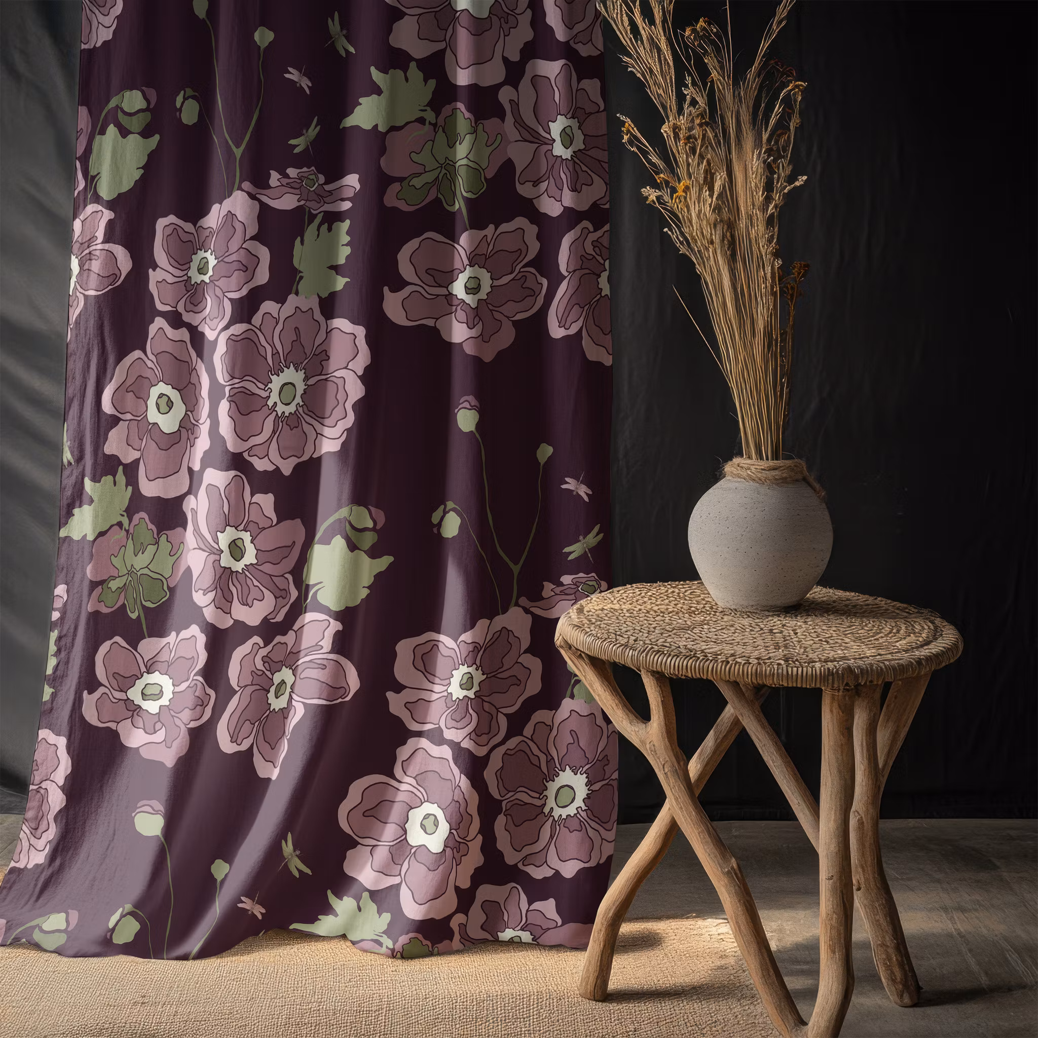 Anemona, höstanemoner på plommonfärgad bomull