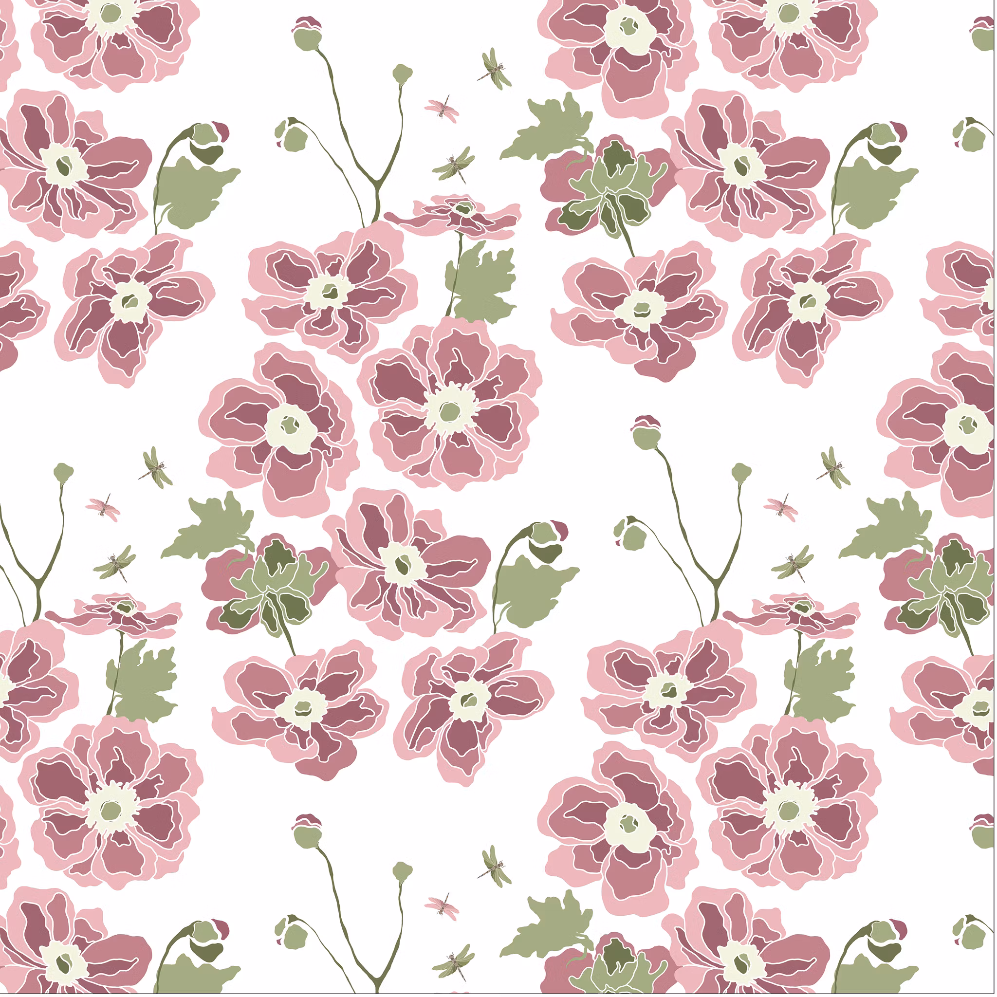 Höstanemonerna! Med sländor svirrandes i mönstret, hos oss dyker de upp i mängder i augusti. Och kort därefter blommar höstanemonen. Anemonen är så utsökt vacker, bara namnet känns så mjukt och härligt i munnen! Här har jag lekt med dess former och uttryck! Samma bakgrundsfärger och palett finns i mönstret Maarit och de båda mönstren är tänkta att kunna mixas och matchas.