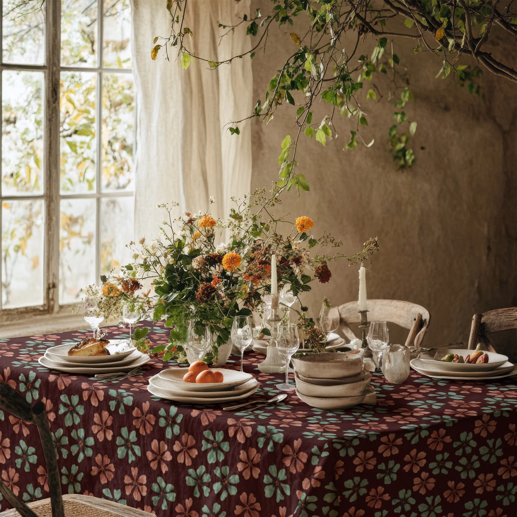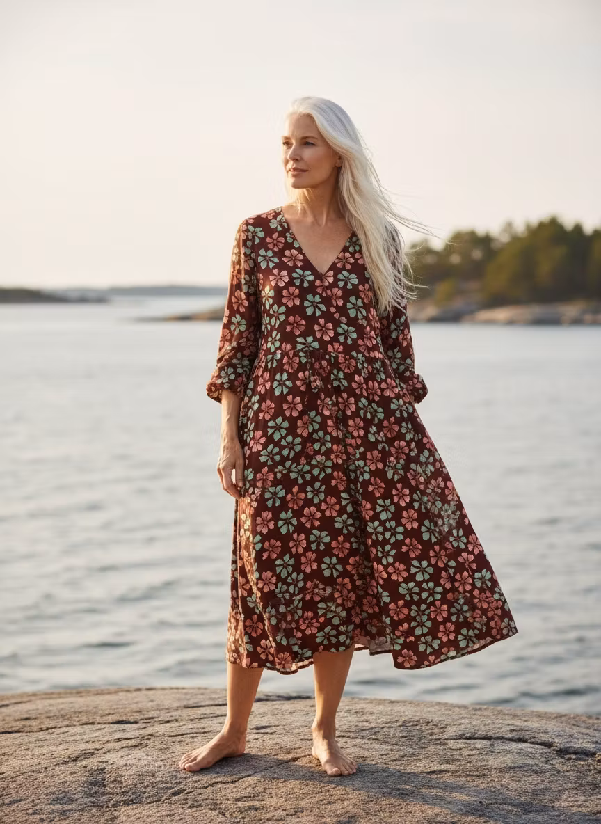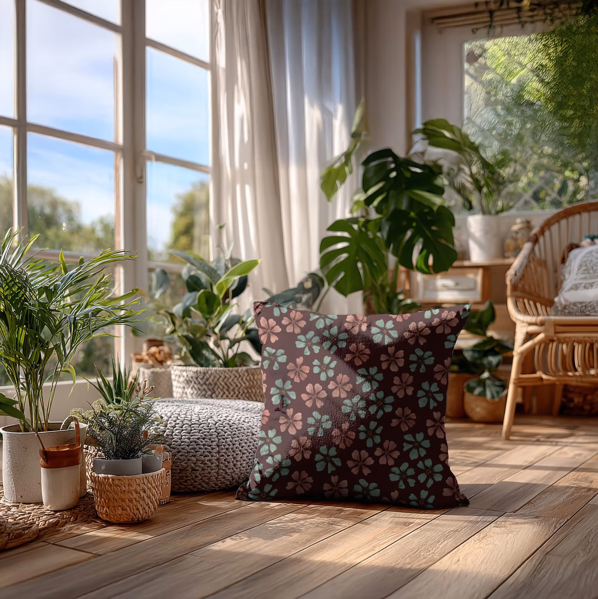 Bliss! Akvarellmålade blommor på brunröd bomull