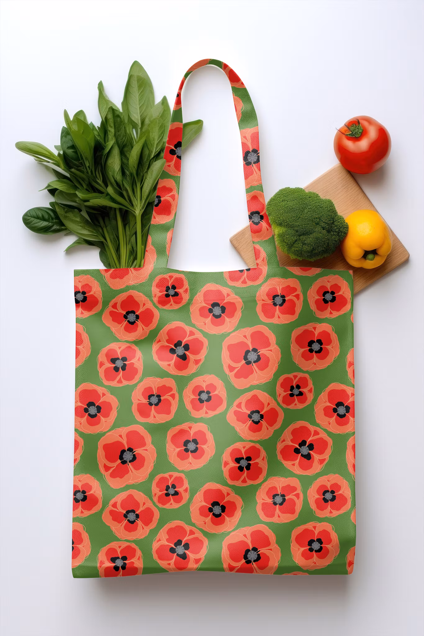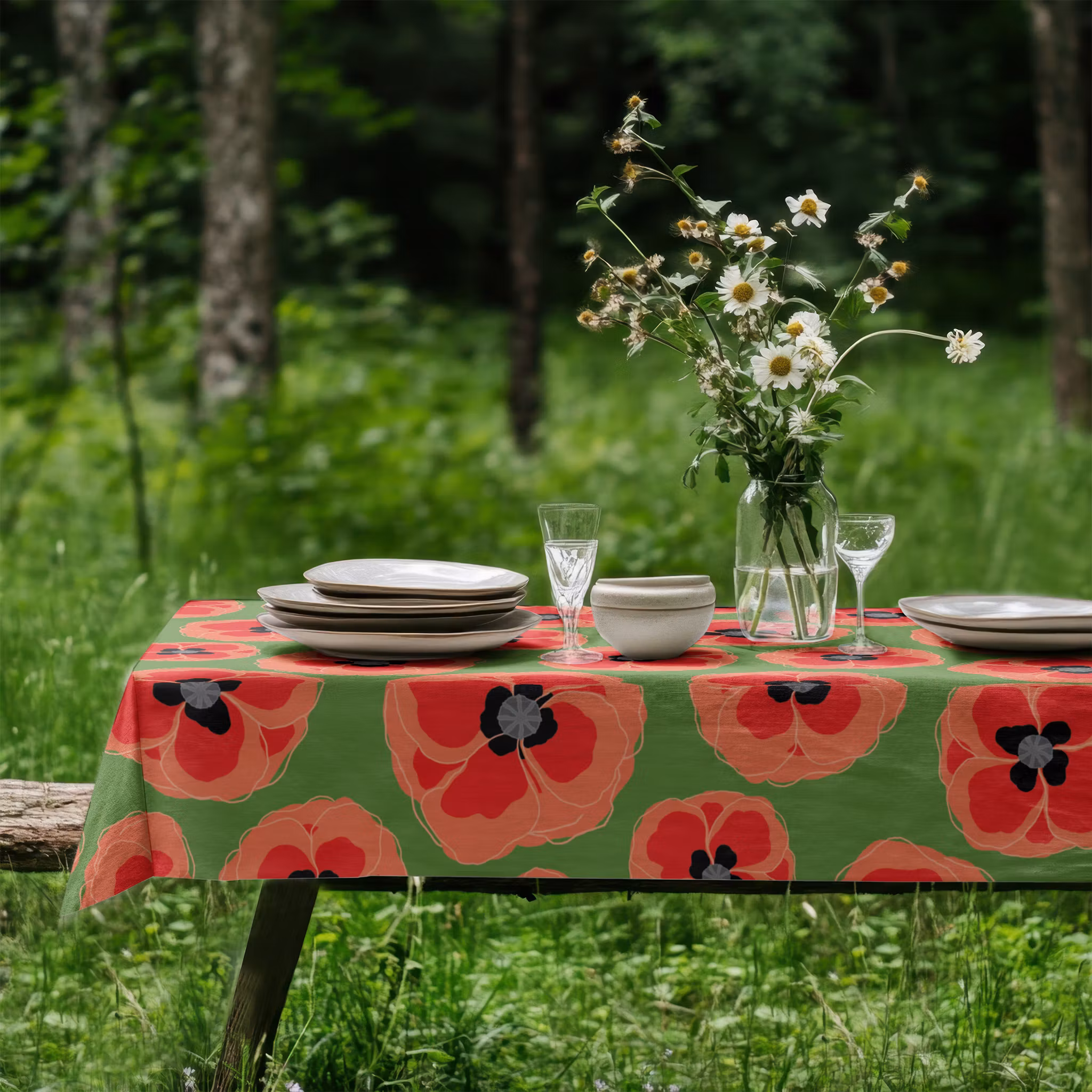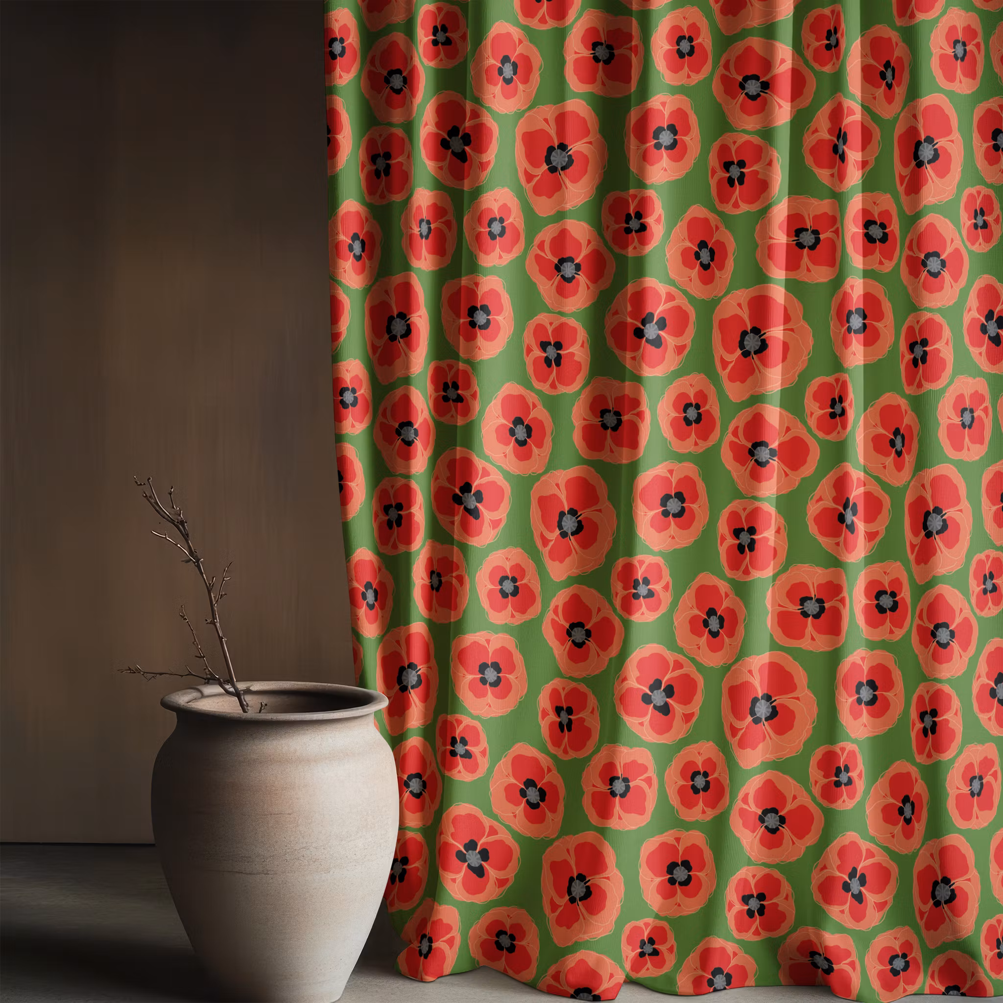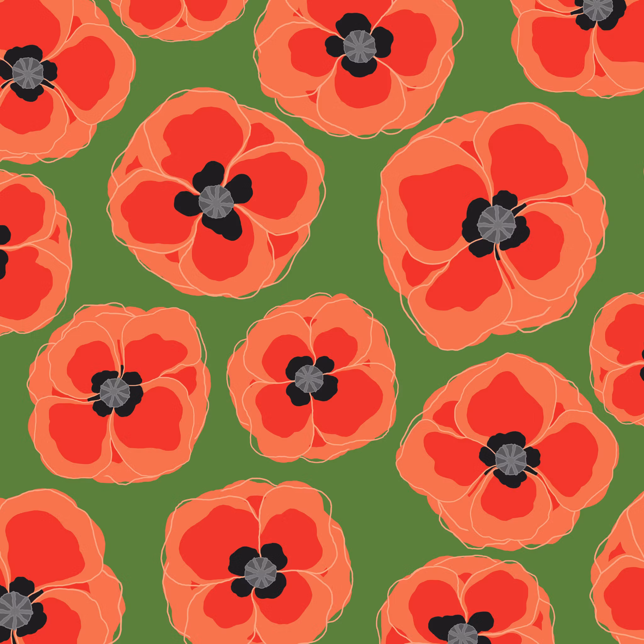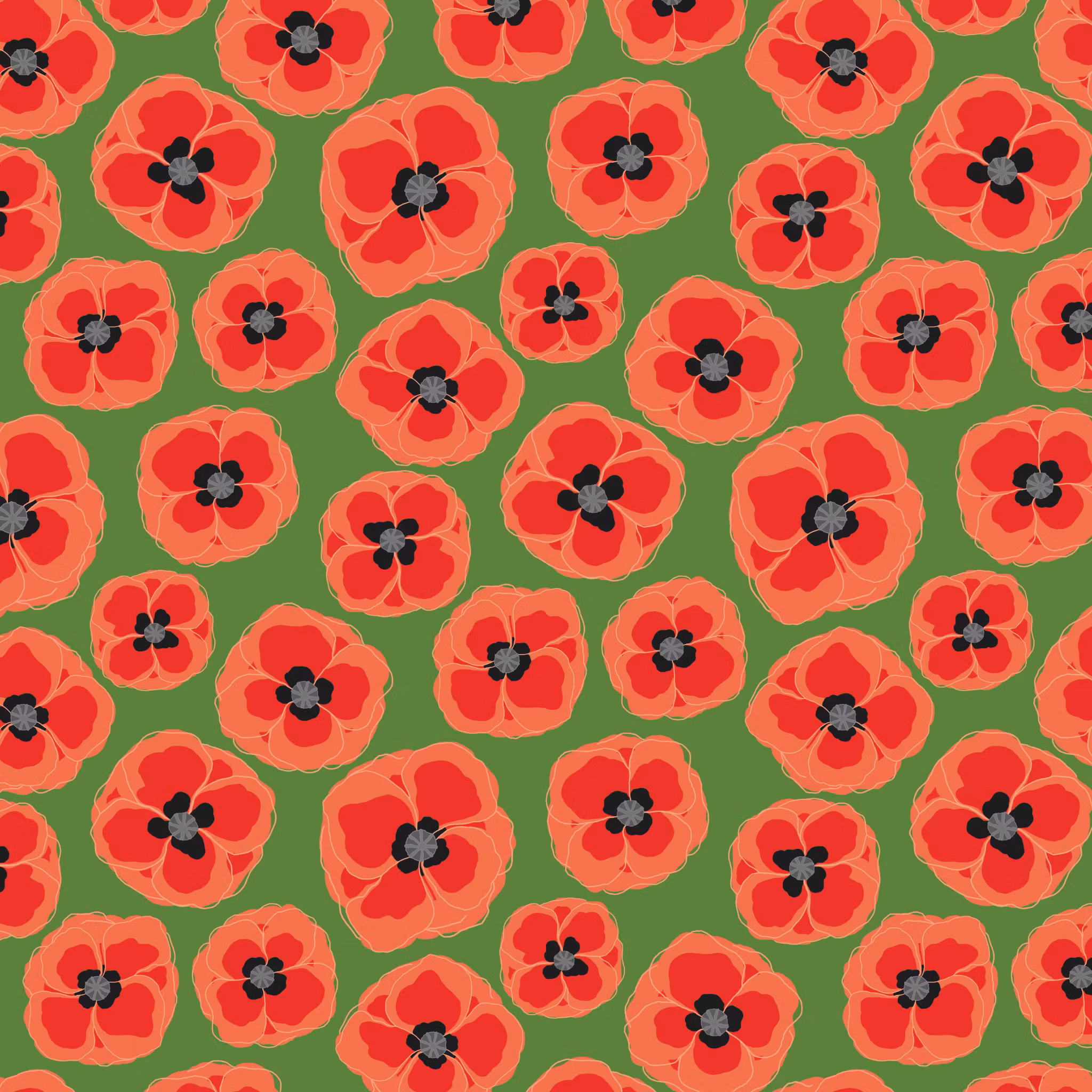Red n grey poppies på grönaste grön bomull