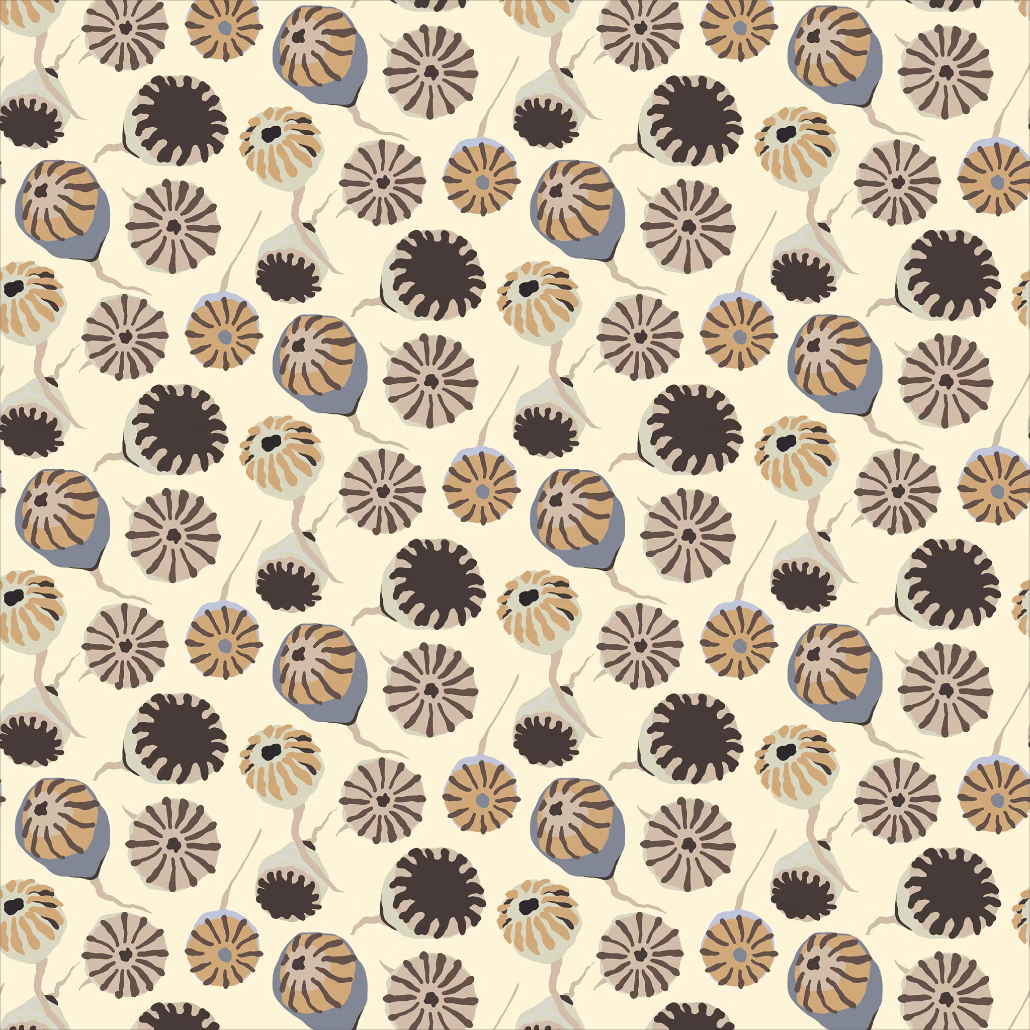 Jag avbildade de frökapslar av rågvallmo som jag plockade och torkade från sädesfältens dikeskanter när jag besökte en vän på Gotland en sommar. De blev så vackra och jag var bara tvungen att avbilda- och göra mönster av dem! Denna vetegula ska förstås minna om sädesfältens!
