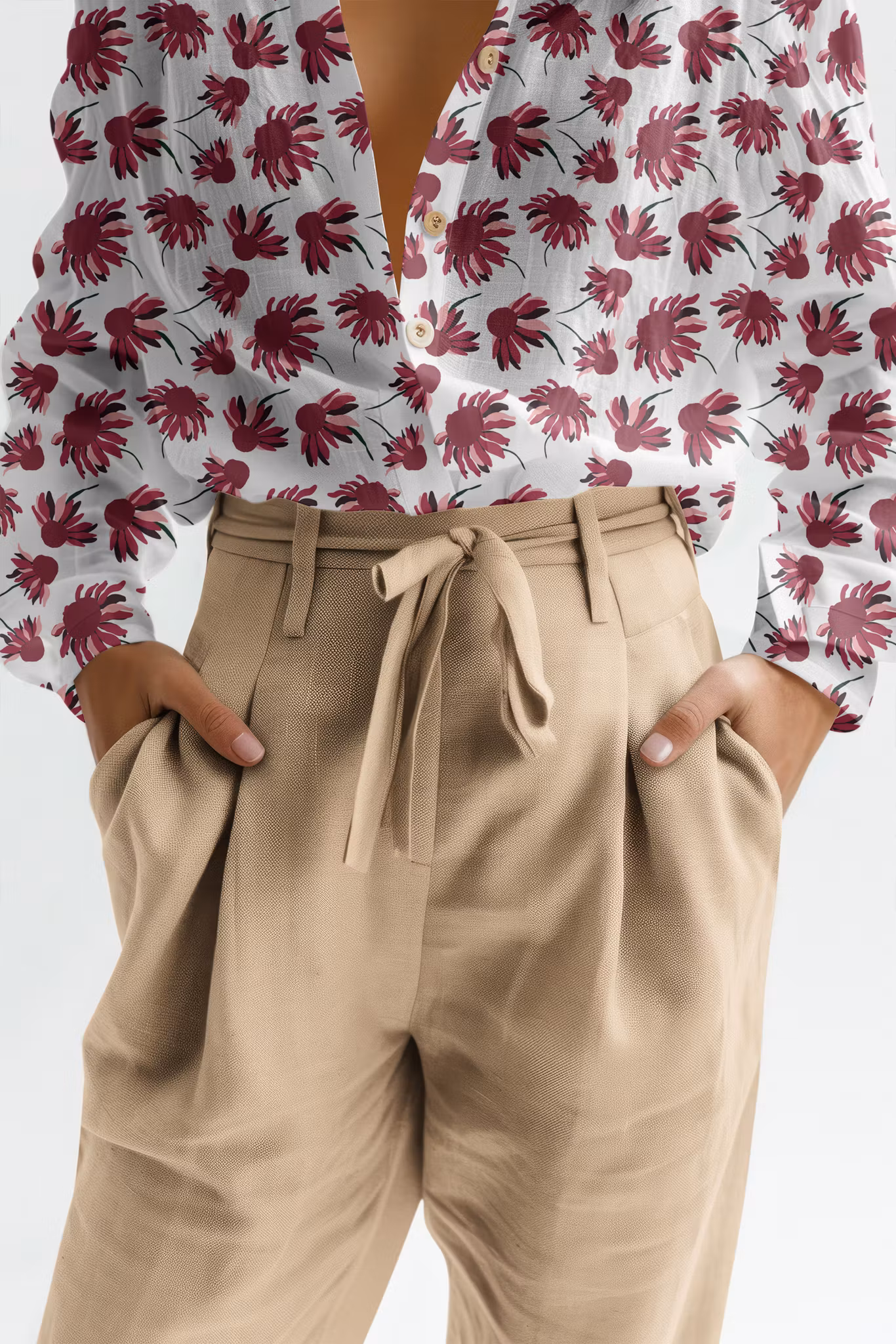 Mönstret Salut!, som är en hyllning till oss kvinnor! Magenta- och rosafärgade solhattar på krispig vit.