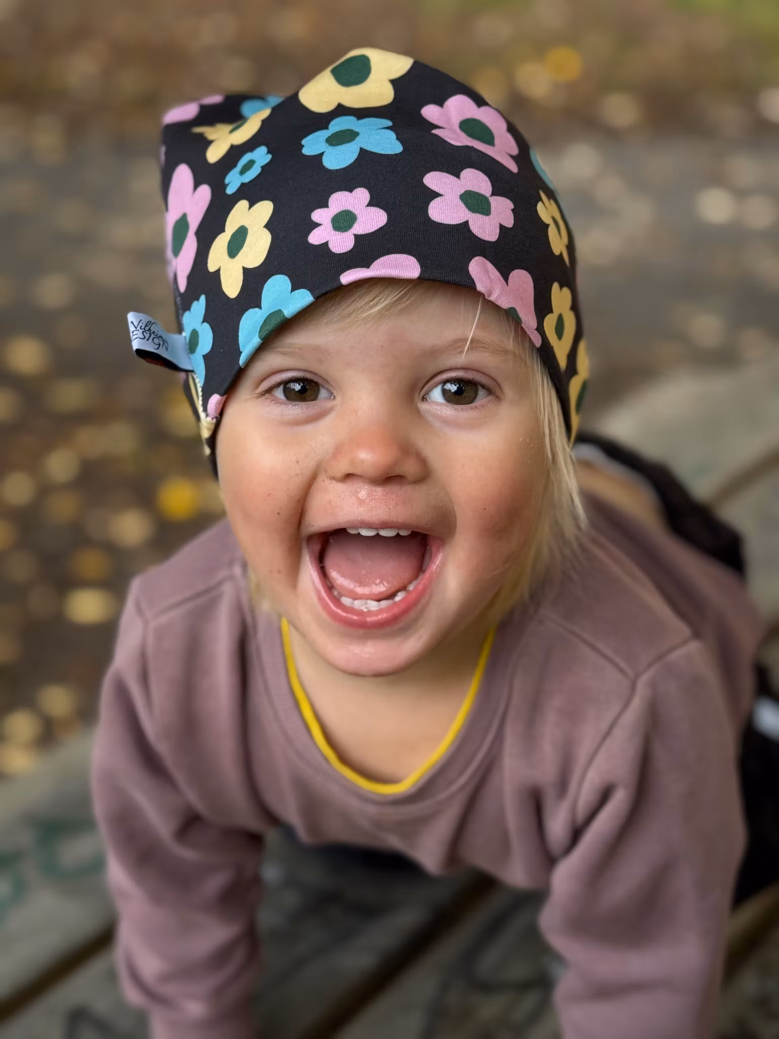 Mössan är sydd i min mjuka jersey 200 g/m2, i underbar kvalitet! Jerseyn är mycket stretchig och mössan kan säkert hänga med ett tag, även efter både 2- och 4 års ålder, möjligen blir mössan något för kort på höjden därefter.