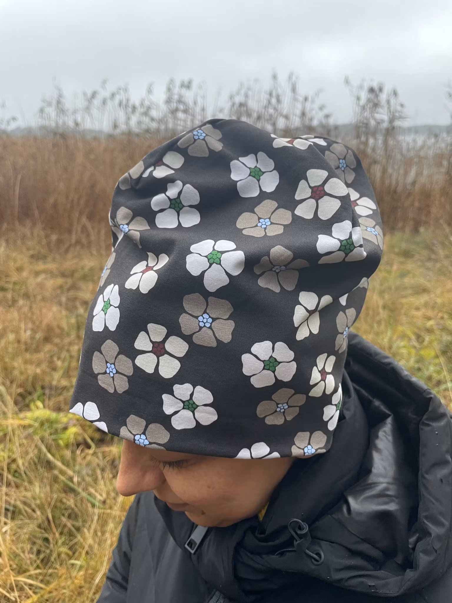Mössan är sydd i min mjuka jersey 200 g/m2, i underbar kvalitet! Du väljer din storlek genom att klicka på den lilla rullgardinen. Jag syr mina mössor så att de blir tillräckligt långa för att kunna vikas upp. Själv gillar jag att bära mössan som du ser på bilden och gillar mina mössor rymliga i storleken och lite lösa upptill.