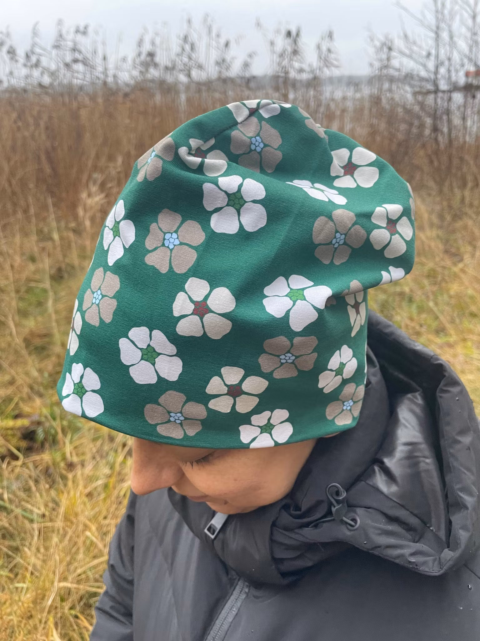 jerseymössa i Dille, stiliserade vallmos på grönt i storlek small/ medium och medium/large!