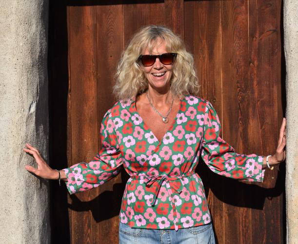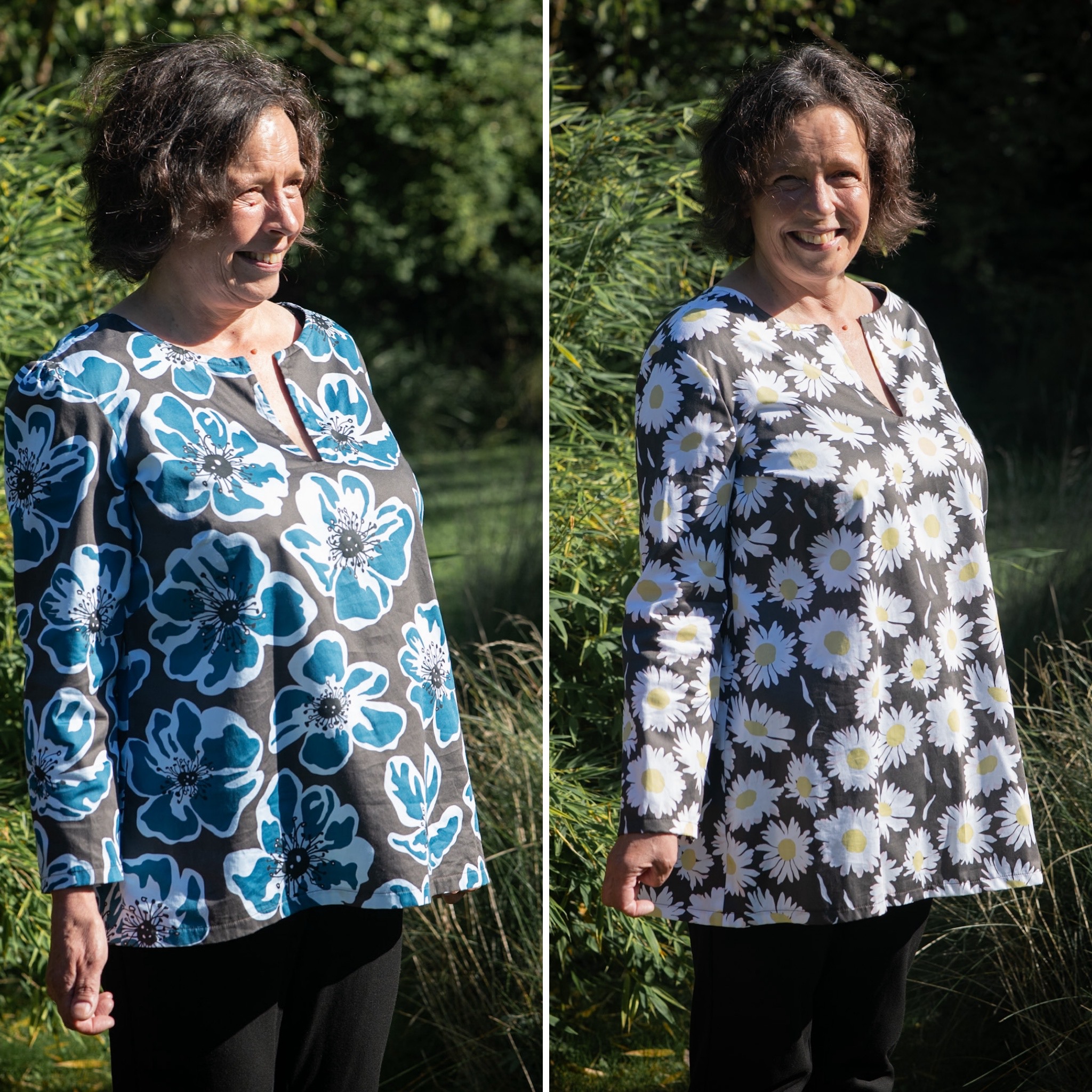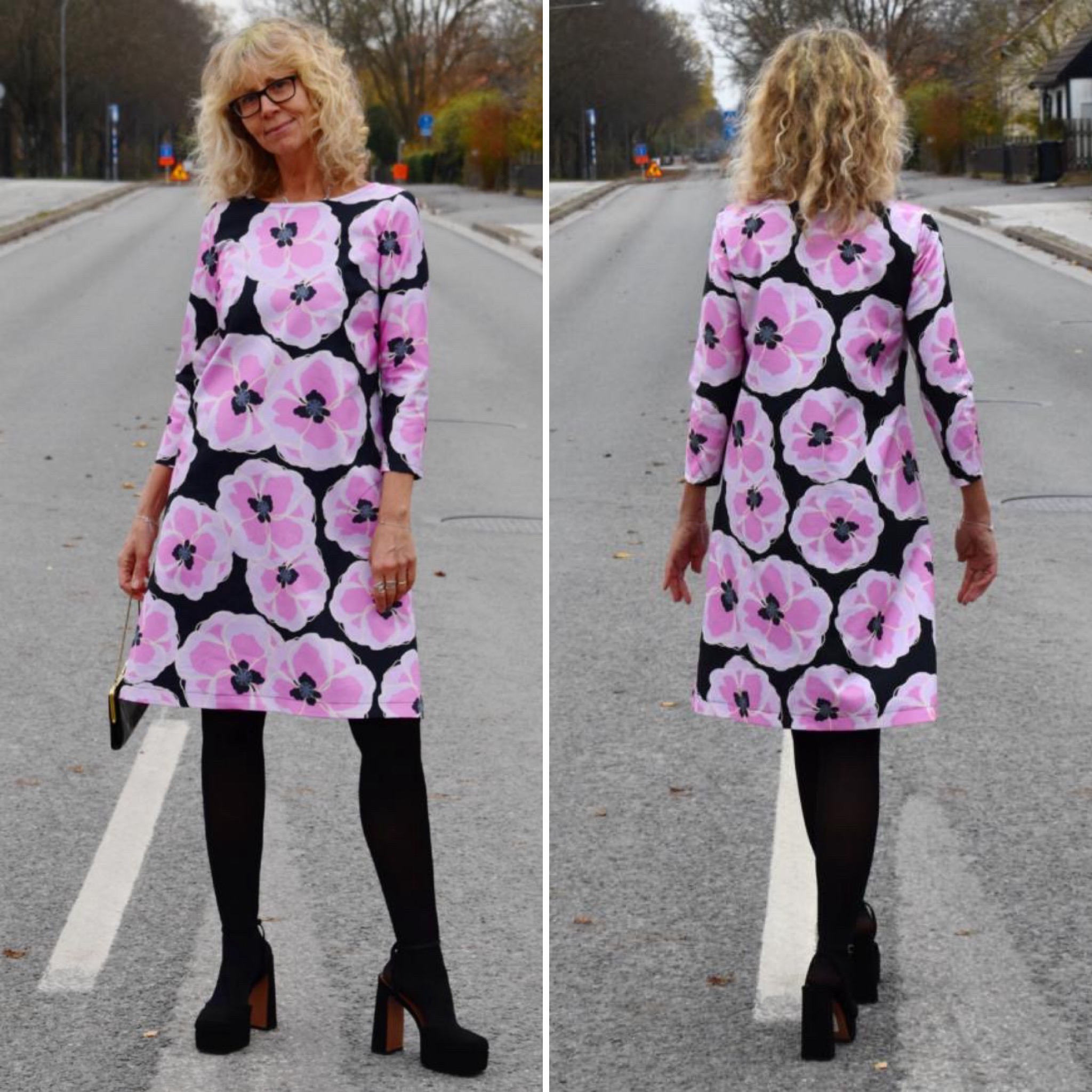 Den är sydd av min vackra, lyxiga satin i mönstret "big n bloomin" som jag släpper den 1 november i två färgställningar och som kommer att återkomma i fler varianter. Skalan kan du som kund vara med och styra, stor- eller småblommigt är en smaksak och ter sig olika på olika plagg. Ser du att ärmarna är lite puffiga på just den här tunikan?!