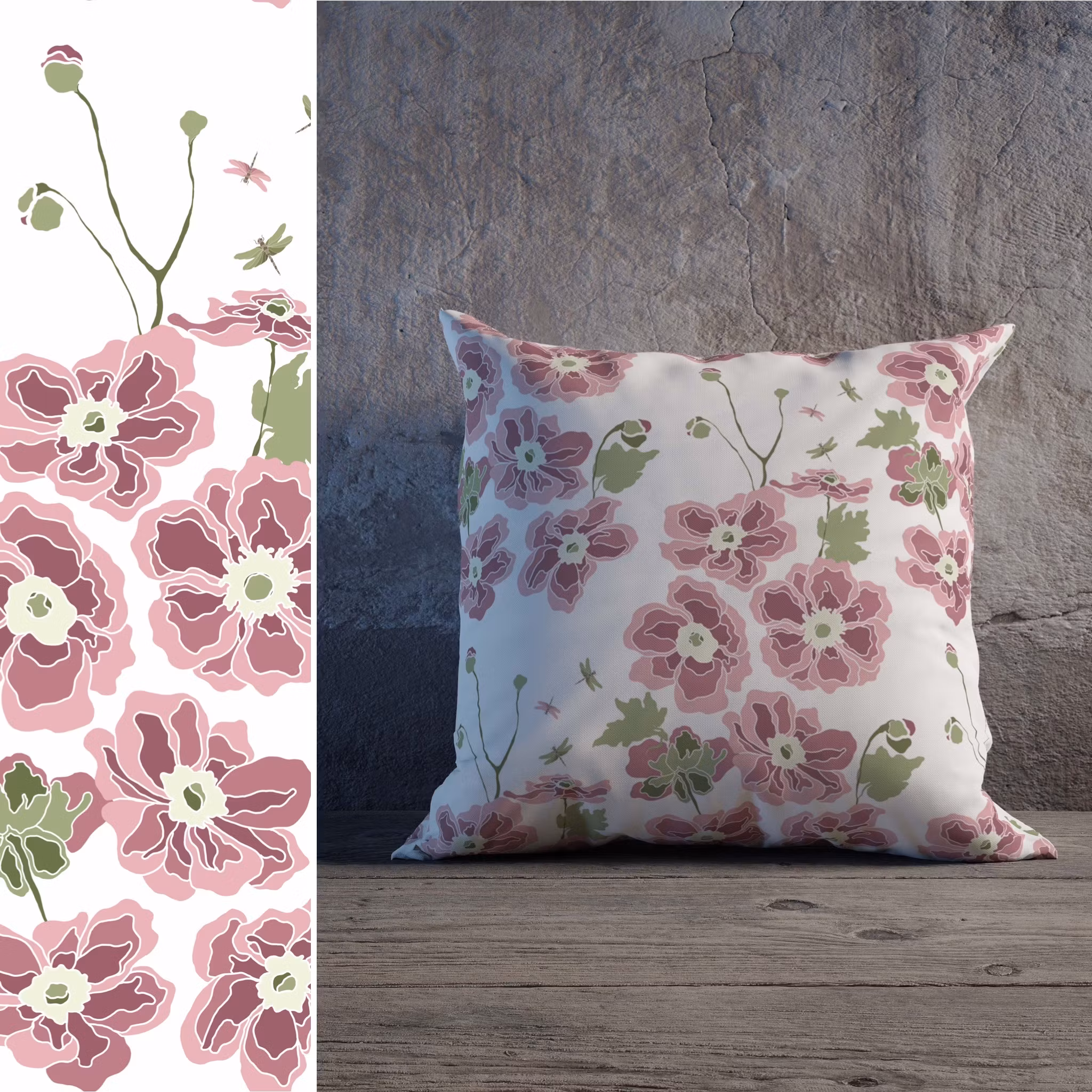 Höstanemonerna! Med sländor svirrandes i mönstret, hos oss dyker de upp i mängder i augusti. Och kort därefter blommar höstanemonen. Anemonen är så utsökt vacker, bara namnet känns så mjukt och härligt i munnen! Här har jag lekt med dess former och uttryck! Samma bakgrundsfärger och palett finns i mönstret Maarit och de båda mönstren är tänkta att kunna mixas och matchas.