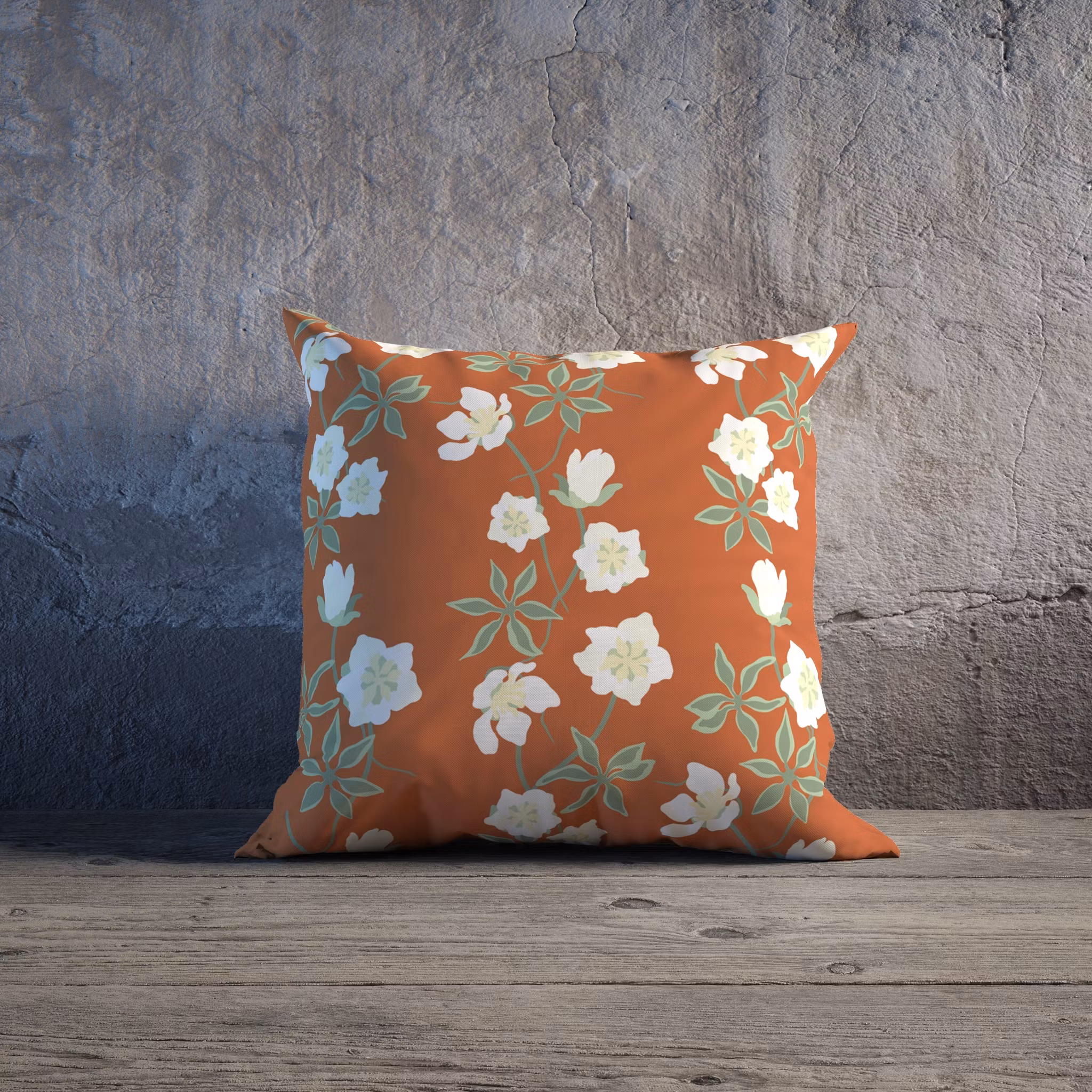 Vackra Helleborus, julrosen i min tolkning på kuddfodral. Här på stugvarm tegelröd.