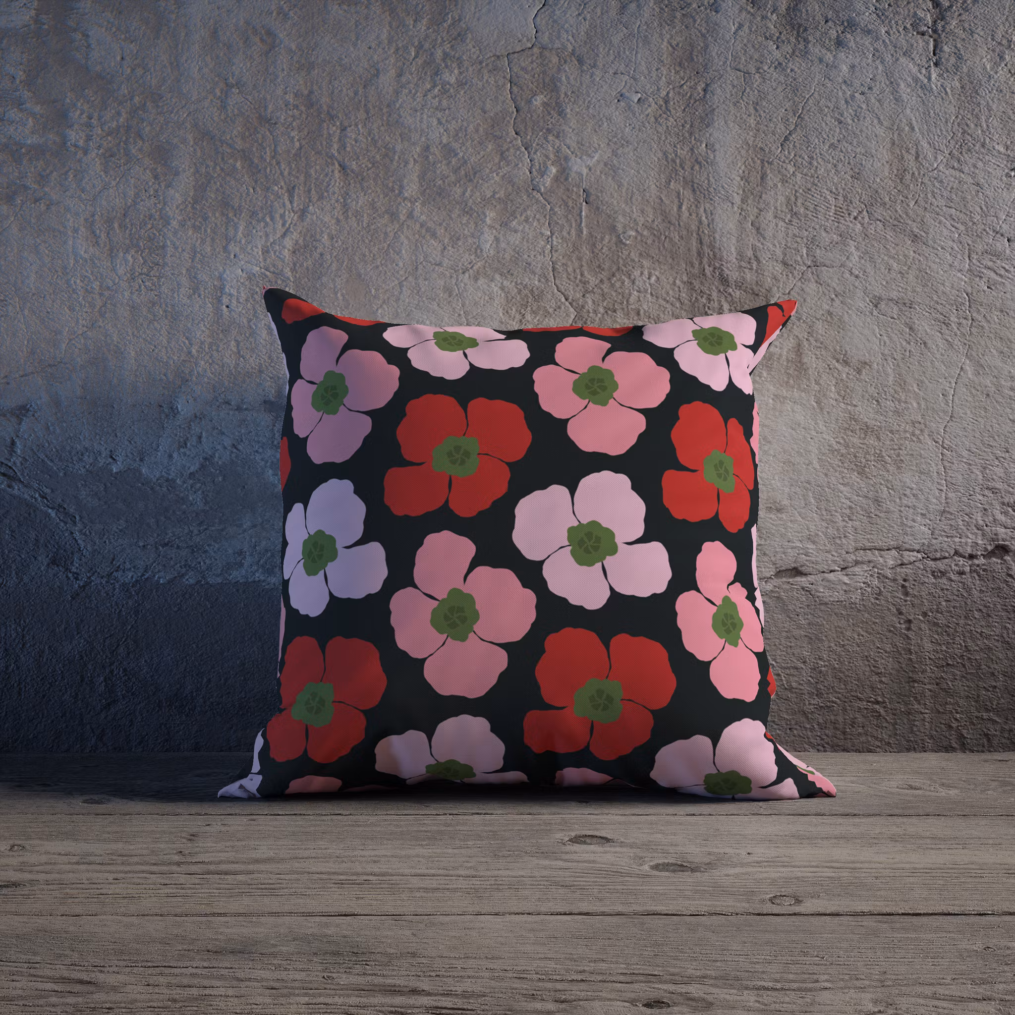 Rosaröda Keshi, vallmos på svart kuddfodral