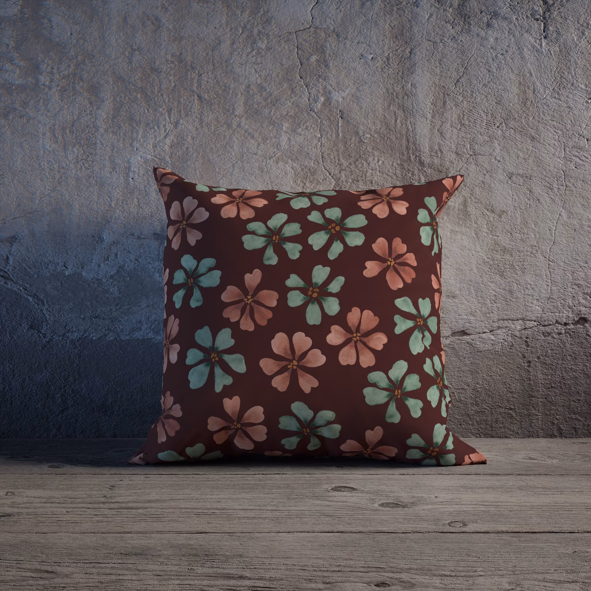 Bliss! Akvarellmålade blommor på brunrött kuddfodral