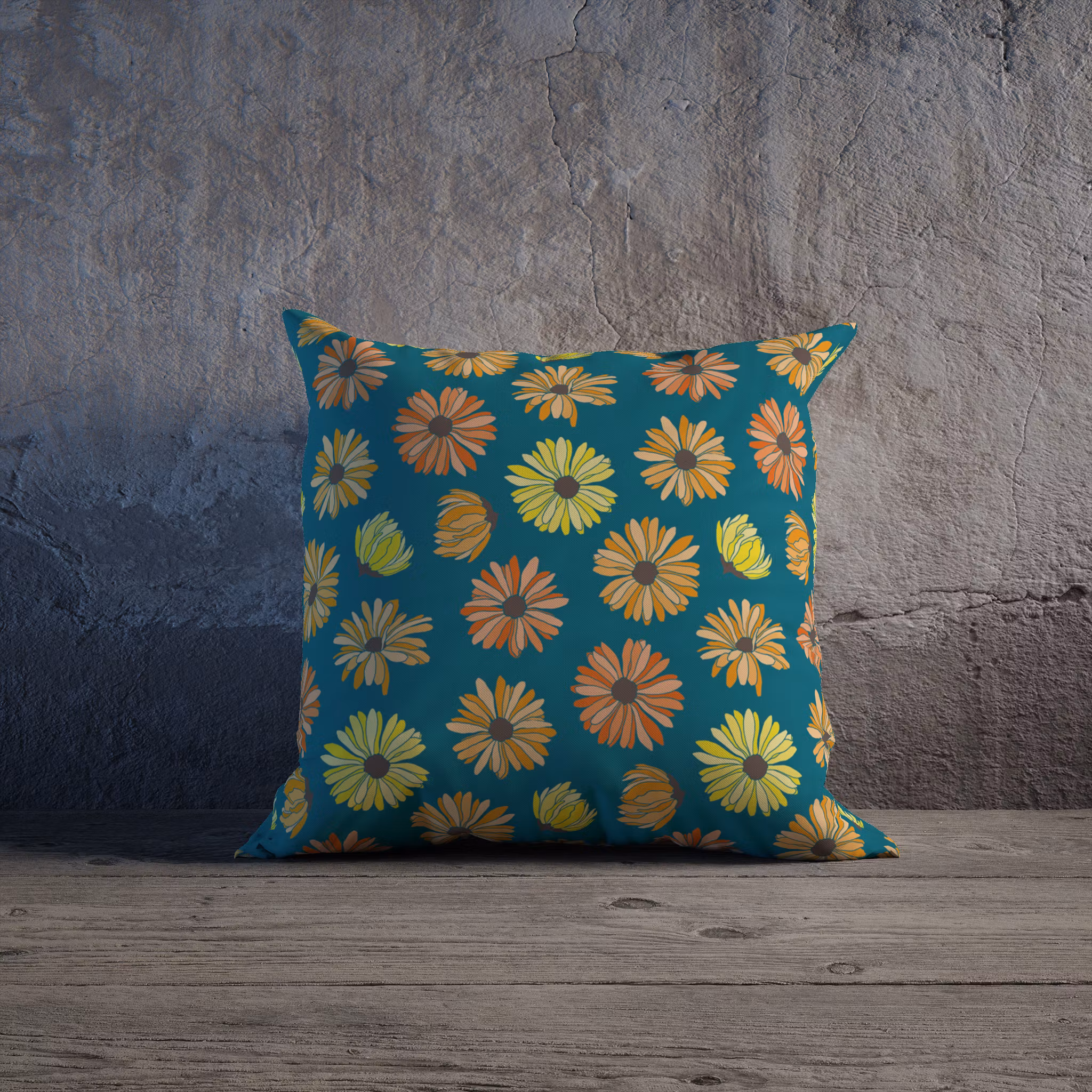 Marigolds, ringblommor på petrolfärgat kuddfodral