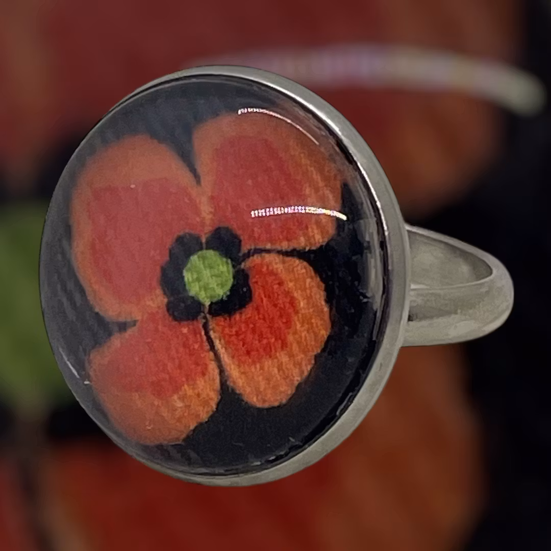 en vallmo på svart tyg i en cabochonring