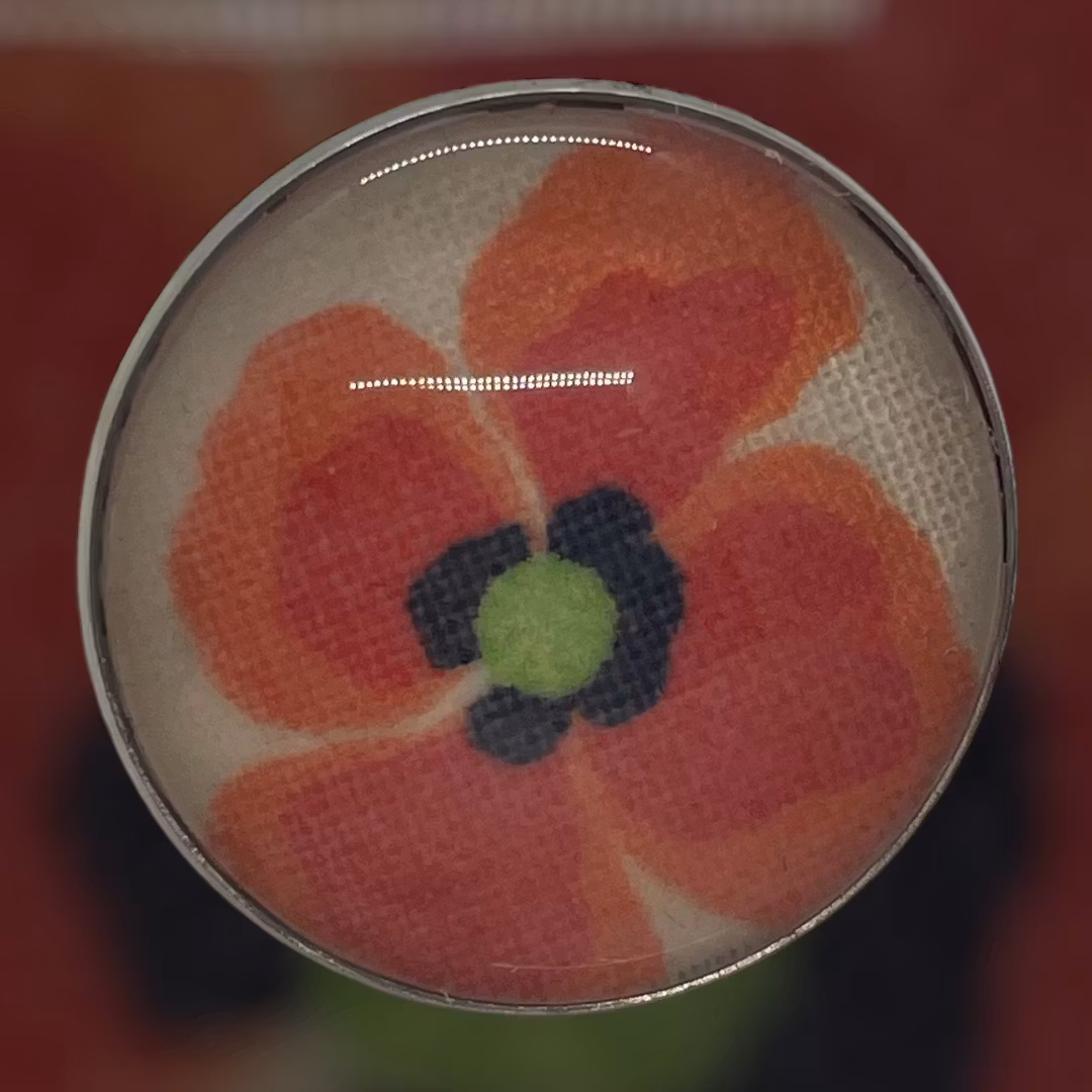 en vallmo på gräddvitt tyg i en cabochonring